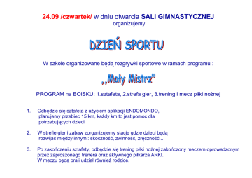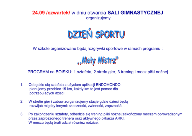 24.09 /czwartek/ w dniu otwarcia SALI GIMNASTYCZNEJ organizujemy W szkole organizowane będą rozgrywki sportowe w ramach programu : PROGRAM na BOISKU: 1.sztafeta, 2.strefa gier, 3.trening i mecz piłki nożnej 1. Odbędzie się sztafeta z użyciem aplikacji ENDOMONDO, planujemy przebiec 15 km, każdy km to jest pomoc dla potrzebujących dzieci 2. W strefie gier i zabaw zorganizujemy stacje gdzie dzieci będą rozwijać między innymi: skoczność, zwinność, zręczność... 3. Po zakończeniu sztafety, odbędzie się trening piłki nożnej zakończony meczem oprowadzonym przez zaproszonego trenera oraz aktywnego piłkarza ARKI. W meczu będą brali udział również rodzice.