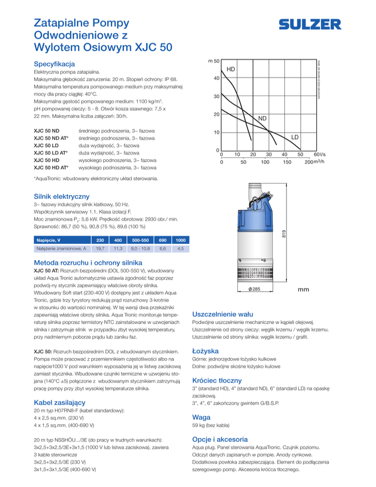 Zatapialne Pompy Odwodnieniowe z Wylotem Osiowym XJC 50 HD Elektryczna pompa zatapialna. Maksymalna głębokość zanurzenia: 20 m. Stopień ochrony: IP 68. Maksymalna temperatura pompowanego medium przy maksymalnej mocy dla pracy ciągłej: 40°C. Maksymalna gęstość pompowanego medium: 1100 kg/m3. pH pompowanej cieczy: 5 - 8. Otwór kosza ssawnego: 7,5 x 22 mm. Maksymalna liczba załączeń: 30/h. XJC 50 ND XJC 50 ND AT* XJC 50 LD XJC 50 LD AT* XJC 50 HD XJC 50 HD AT* XJC50-ND-AD/LD-AA/HD-AC 50Hz m 50 Specyfikacja 40 30 20 średniego podnoszenia, 3~ fazowa średniego podnoszenia, 3~ fazowa duża wydajność, 3~ fazowa duża wydajność, 3~ fazowa wysokiego podnoszenia, 3~ fazowa wysokiego podnoszenia, 3~ fazowa ND 10 0 LD 0 0 10 20 50 30 100 40 150 50 60 l/s 200 m3/h *AquaTronic: wbudowany elektroniczny układ sterowania. Silnik elektryczny Napięcie, V 230 400 500-550 690 1000 Natężenie znamionowe, A 19,7 11,3 9,0 - 10,8 6,6 4,5 819 3~ fazowy indukcyjny silnik klatkowy, 50 Hz. Współczynnik serwisowy 1.1. Klasa izolacji F. Moc znamionowa P2: 5,6 kW. Prędkość obrotowa: 2930 obr./ min. Sprawność: 86,7 (50 %), 90,8 (75 %), 89,6 (100 %) Metoda rozruchu i ochrony silnika XJC 50 AT: Rozruch bezpośredni (DOL 500-550 V), wbudowany układ Aqua Tronic automatycznie ustawia zgodność faz poprzez podwój-ny stycznik zapewniający właściwe obroty silnika. Wbudowany Soft start (230-400 V) dostępny jest z układem Aqua Tronic, gdzie trzy tyrystory redukują prąd rozruchowy 3-krotnie w stosunku do wartości nominalnej. W tej wersji dwa przekaźniki zapewniają właściwe obroty silnika. Aqua Tronic monitoruje temperaturę silnika poprzez termistory NTC zainstalowane w uzwojeniach silnika i zatrzymuje silnik w przypadku zbyt wysokiej temperatury, przy nadmiernym poborze prądu lub zaniku faz. XJC 50: Rozruch bezpośrednim DOL z wbudowanym stycznikiem. Pompa może pracować z przemiennikiem częstotliwości albo na napięcie1000 V pod warunkiem wyposażenia jej w listwę zaciskową zamiast stycznika. Wbudowane czujniki termiczne w uzwojeniu stojana (140°C ±5) połączone z wbudowanym stycznikiem zatrzymują pracę pompy przy zbyt wysokiej temperaturze silnika. Kabel zasilający 20 m typ H07RN8-F (kabel standardowy): 4 x 2,5 sq.mm. (230 V) 4 x 1,5 sq.mm. (400-690 V) 20 m typ NSSHÖU.../3E (do pracy w trudnych warunkach): 3x2,5+3x2,5/3E+3x1,5 (1000 V lub listwa zaciskowa), zawiera 3 kable sterownicze 3x2,5+3x2,5/3E (230 V) 3x1,5+3x1,5/3E (400-690 V) 285 mm Uszczelnienie wału Podwójne uszczelnienie mechaniczne w kąpieli olejowej. Uszczelnienie od strony cieczy: węglik krzemu / węglik krzemu. Uszczelnienie od strony silnika: węglik krzemu / grafit. Łożyska Górne: jednorzędowe łożysko kulkowe Dolne: podwójne skośne łożysko kulowe Króciec tłoczny 3” (standard HD), 4” (standard ND), 6” (standard LD) na opaskę zaciskową. 3”, 4”, 6” zakończony gwintem G/B.S.P. Waga 59 kg (bez kabla) Opcje i akcesoria Aqua plug. Panel sterowania AquaTronic. Czujnik poziomu. Odczyt danych zapisanych w pompie. Anody cynkowe. Dodatkowa powłoka zabezpieczająca. Element do podłączenia szeregowego pomp. Akcesoria króćca tłocznego. Kontrola pracy pompy Wykaz kontrolowanych parametrów XJC 50 XJC 50 AT AT AT + Czujnik poziomu AT + AquaPlug / Panel sterowania AquaTronic AT + AquaPlug / Panel sterowania AquaTronic + Czujnik poziomu Odczyt danych zapisanych w pompie Praca urządzenia X X X X X Zintegrowane wyposażenie startowe X X X X X X X X X X X X X X Ochrona silnika przy wys.natężeniu prądu X X X X X Ochrona silnika przy zanikaniu fazy X X X X X Automatyczne wykrywanie obrotów Ochrona silnika przy wys. temperaturze X Kontrola poziomu X X Ochrona silnika przed suchobiegiem X X Automatyczne wznowienie pracy pompy X X Zatrzymanie pracy pompy X Automatyczna praca i zatrzymanie X X Inf. o zawilgoceniu X X X Inf. o niskiej wartości rezystancji izolacji X X X Inf. o zbyt wysokim lub niskim napięciu XX XX X Inf. o przekroczeniu dop. temp. pracy XX XX X Inf. o przekroczeniu dop. natężenia prądu XX XX X Inf. o asymetrii napięcia XX XX X X X X Podłączenie kabla USB X X Inf. o 10 ostatnich zdarzeniach X Dokumentacja (lista części, instr. warsztatowa) X XX = Sygnalizacja awarii- pompa jest automatycznie zatrzymana w celu ochrony silnika. Wykonanie materiałowe Opis Materiał EN ASTM Elementy odlewane Aluminium EN 1706:AC-43100 ASTM AlSi10mg Kosz ssawny / Uchwyt Stal nierdzewna 10088:X5CrNi18-10 (1.4301) AISI 304 Wał Stal nierdzewna 10088:X20Cr13 (1.4021) AISI 420 Wirnik / Pierścień wymienny Żeliwo białe EN-GJN-HV600(XCr23) ASTM A 532: Alloy III A Elementy złączne Stal nierdzewna 10088:X5CrNiMo 17122 (1.4401) AISI 316 Części zużywające się / O-ringi Kauczuk nitrylowy Powłoka zabezpieczająca 2 skł. farba epoksydowa 120 µm www.sulzer.com XJC 50 50Hz pl (12.2016), Copyright © Sulzer Ltd 2016 Ten dokument nie zapewnia żadnego rodzaju rękojmi lub gwarancji. Wszelkich informacji dotyczących gwarancji i poręczeń możemy udzielić po otrzymaniu zapytania. Dokumentacja techniczno-ruchowa zostanie przekazana oddzielnie. Wszystkie informacje zawarte w niniejszym dokumencie mogą bez uprzedzenia ulec zmianie.