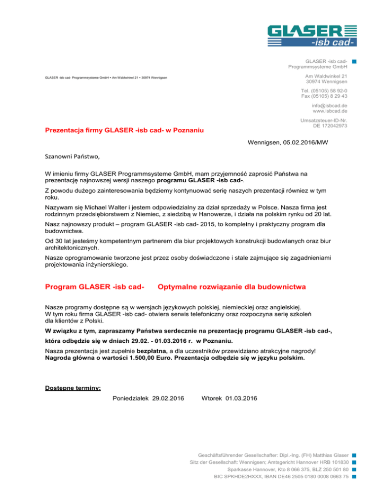GLASER -isb cadProgrammsysteme GmbH Am Waldwinkel 21 30974 Wennigsen GLASER -isb cad- Programmsysteme GmbH Ÿ Am Waldwinkel 21 Ÿ 30974 Wennigsen Tel. (05105) 58 92-0 Fax (05105) 8 29 43 [email protected] www.isbcad.de Umsatzsteuer-ID-Nr. DE 172042973 Prezentacja firmy GLASER -isb cad- w Poznaniu Wennigsen, 05.02.2016/MW Szanowni Państwo, W imieniu firmy GLASER Programmsysteme GmbH, mam przyjemność zaprosić Państwa na prezentację najnowszej wersji naszego programu GLASER -isb cad-. Z powodu dużego zainteresowania będziemy kontynuować serię naszych prezentacji równiez w tym roku. Nazywam się Michael Walter i jestem odpowiedzialny za dział sprzedaży w Polsce. Nasza firma jest rodzinnym przedsiębiorstwem z Niemiec, z siedzibą w Hanowerze, i działa na polskim rynku od 20 lat. Nasz najnowszy produkt – program GLASER -isb cad- 2015, to kompletny i praktyczny program dla budownictwa. Od 30 lat jesteśmy kompetentnym partnerem dla biur projektowych konstrukcji budowlanych oraz biur architektonicznych. Nasze oprogramowanie tworzone jest przez osoby doświadczone i stale zajmujące się zagadnieniami projektowania inżynierskiego. Program GLASER -isb cad- Optymalne rozwiązanie dla budownictwa Nasze programy dostępne są w wersjach językowych polskiej, niemieckiej oraz angielskiej. W tym roku firma GLASER -isb cad- otwiera serwis telefoniczny oraz rozpoczyna serię szkoleń dla klientów z Polski. W związku z tym, zapraszamy Państwa serdecznie na prezentację programu GLASER -isb cad-, która odbędzie się w dniach 29.02. - 01.03.2016 r. w Poznaniu. Nasza prezentacja jest zupełnie bezpłatna, a dla uczestników przewidziano atrakcyjne nagrody! Nagroda główna o wartości 1.500,00 Euro. Prezentacja odbędzie się w języku polskim. Dostępne terminy: Poniedziałek 29.02.2016 Wtorek 01.03.2016 Geschäftsführender Gesellschafter: Dipl.-Ing. (FH) Matthias Glaser Sitz der Gesellschaft: Wennigsen; Amtsgericht Hannover HRB 101830 Sparkasse Hannover, Kto 8 066 375, BLZ 250 501 80 BIC SPKHDE2HXXX, IBAN DE46 2505 0180 0008 0663 75 Prosimy o informację, który z zaproponowanych terminów najbardziej Państwu odpowiada. PROGRAM: 10.00 – 10.15 10.15 – 12.00 12.00 – 13.00 13.00 – 13.15 13.30 – 14.30 Rozpoczęcie Prezentacja programów do tworzenia rysunków konstrukcji budowlanych -isb cadPytania oraz dyskusja Losowanie nagród Wspólny obiad (koszt pokrywa organizator) Będzie nam niezmiernie miło gościć Państwa na naszej prezentacji. Będzie nam równieź bardzo miło móc powitać, w ramach naszej prezentacji, firmę Biuro Projektów Michalewski z Wrocławia, jednego z naszych długoletnich klientów. Pan Michalewski przedstawi Państwu informacje na temat swoich doświadczeń z firmą GLASER -isb cad-. Prosimy o potwierdzenie udziału w spotkaniu wraz z odpowiadającym Państwu terminem pocztą elektroniczną na adres [email protected] i [email protected]. Mogą się Państwo również zgłosić poprzez naszą stronę internetową www.isbcad.pl. Ostateczny termin zgłoszenia na prezentację firmy GLASER to 22.02.2016. Uczestnicy mogą wcześniej zgłosić temat lub problem, który ich szczególnie interesuje - zostanie on omówiony w ramach dyskusji. Jeżeli problem wystąpił w konkretnym obiekcie, proszę wcześniej przesłać to zagadnienie pocztą elektroniczną [email protected]. W razie jakichkolwiek pytań, pozostajemy do Państwa dyspozycji. Mamy nadzieję, że spotkamy się w marcu w Poznaniu. Serdeczne pozdrowienia z Hanoweru. Do zobaczenia Michael Walter