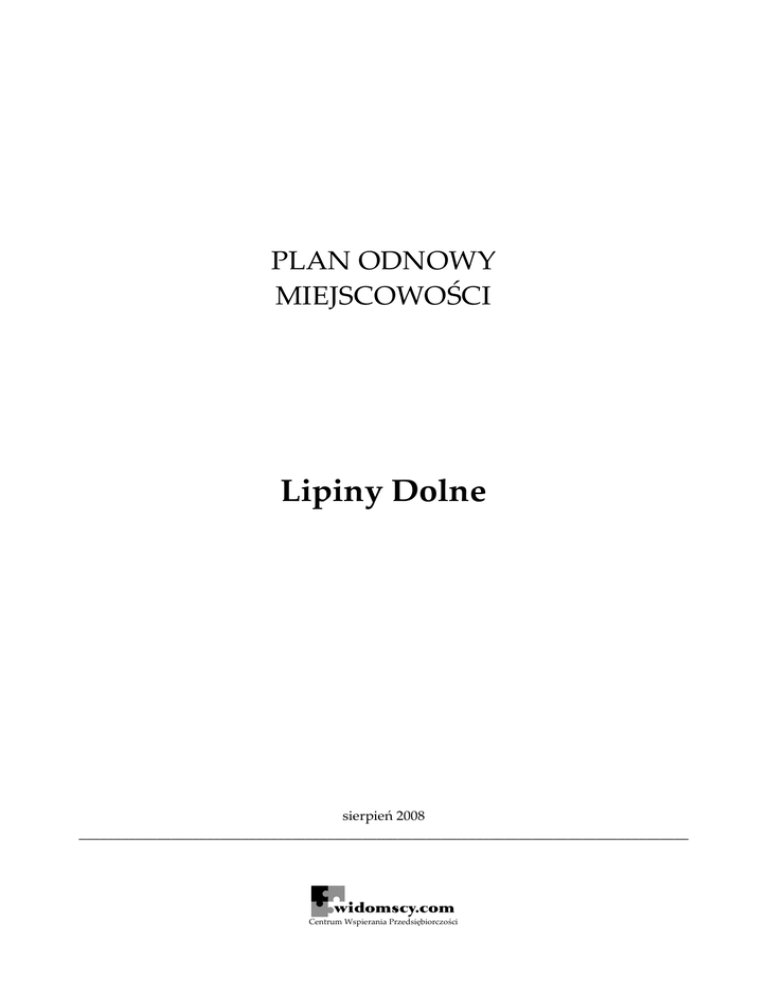 PLAN ODNOWY MIEJSCOWOŚCI Lipiny Dolne sierpień 2008 ______________________________________________________________________________________ Centrum Wspierania Przedsiębiorczości PLAN ODNOWY MIEJSCOWOŚCI LIPINY DOLNE _______________________________________________________________________________ Spis treści I. Wstęp str. 2 II. Charakterystyka miejscowości str. 3 1. Położenie miejscowości, przynależność administracyjna, itp. str. 3 2. Historia miejscowości str. 3 3. Określenie przestrzennej struktury miejscowości str. 4 III. Inwentaryzacja zasobów służących odnowie miejscowości str. 6 1. Zasoby przyrodnicze str. 7 2. Dziedzictwo kulturowe str. 7 3. Obiekty i tereny str. 8 4. Infrastruktura społeczna str. 11 5. Infrastruktura techniczna str. 12 a) Energetyka str. 12 b) Dostarczanie ciepła str. 12 c) Dostarczanie wody str. 12 d) Usuwanie ścieków str. 12 e) Usuwanie odpadów str. 12 f) Gazyfikacja str. 12 g) Telekomunikacja str. 13 6. Gospodarka i rolnictwo str. 13 7. Kapitał społeczny i ludzki str. 13 IV. Analiza SWOT 1. Słabe i mocne strony miejscowości str. 14 str. 14 2. Szanse i zagrożenia str. 18 V. Opis planowanych zadań inwestycyjnych i przedsięwzięć aktywizujących społeczność lokalną str. 22 1 PLAN ODNOWY MIEJSCOWOŚCI LIPINY DOLNE _______________________________________________________________________________ I. Wstęp Plan Odnowy Miejscowości Lipiny Dolne jest dokumentem zgodnym ze strategicznymi dokumentami Gminy Potok Górny oraz innymi strategicznymi dokumentami o charakterze regionalnym, krajowym (takimi jak: Strategia Rozwoju Województwa Lubelskiego, Strategia Rozwoju Kraju oraz Strategia Rozwoju Obszarów Wiejskich i Rolnictwa na lata 2007 – 2013). Opracowanie i uchwalenie Planu Rozwoju Miejscowości jest niezbędnym warunkiem przy ubieganiu się o środki finansowe w ramach Programu Rozwoju Obszarów Wiejskich na lata 2007 – 2013, działanie: Odnowa i Rozwój Wsi. Plan Odnowy Miejscowości Lipiny Dolne opisuje miejscowość - jej zasoby, wewnętrzne uwarunkowania (mocne i słabe strony) oraz czynniki zewnętrzne mogące mieć wpływ na proces odnowy (szanse i zagrożenia). Ponadto, jako strategiczny dokument planistyczny, Plan Odnowy Miejscowości zawiera opis zadań inwestycyjnych i przedsięwzięć aktywizujących lokalną społeczność na przestrzeni najbliższych siedmiu lat. Plan Odnowy Miejscowości Lipiny Dolne został opracowany między innymi na podstawie danych dostarczonych przez Urząd Gminy – dane te wynikały zarówno z wizji Władz Samorządowych, jak również – oczekiwań mieszkańców. 2 PLAN ODNOWY MIEJSCOWOŚCI LIPINY DOLNE _______________________________________________________________________________ II. Charakterystyka miejscowości, w której będzie realizowana operacja 1. Położenie miejscowości, przynależność administracyjna, powierzchnia, liczba ludności Miejscowość Lipiny Dolne znajduje się w województwie lubelskim, powiecie biłgorajskim, gminie Potok Górny i leży przy drodze powiatowej biegnącej do Stalowej Woli. Miejscowość zajmuje 1958 ha, zamieszkuje ją 989 osób. 2. Historia miejscowości ze szczególnym uwzględnieniem wydarzeń mających wpływ na powstanie układu przestrzennego Lipiny Dolne zostały założone pod koniec XVI wieku; założyciel nie jest znany. Następnie miejscowość weszła w skład Ordynacji Zamoyskiej. W 1612 roku funkcjonowała już w miejscowości cerkiew unicka, następnie w 1798 roku wybudowano nową cerkiew (odnawianą w 1839 roku). Obecnie w cerkwi tej mieści się kościół katolicki. Od I rozbioru Polski do 1809 roku Lipiny Dolne znajdowały się w zaborze austriackim, w latach 1809 – 1815 – w Księstwie Warszawskim, w latach 1815 – 1915 – w Królestwie Polskim. W pierwszej połowie XIX wieku w Lipinach Dolnych i Górnych mieszkało około 1500 osób. W latach 1836 – 1870 Lipiny Dolne pełniły funkcję gminy. W 1939 roku do Lipin przeniesiono z Potoka Górnego parafię unicką. W latach 40-stych XIX wieku wzniesiono w Lipinach dworek murowany służący zarządcom majątku (obecnie w rękach prywatnych). W 1864 roku władze carskie uwłaszczyły chłopów w Lipinach Dolnych. Na początku XX wieku funkcjonowała w Lipinach szkołą rosyjska. Po odzyskaniu niepodległości nastąpiło przejęcie cerkwi prawosławnej (dawniej unickiej) i w 1920 roku utworzono w Lipinach parafię rzymskokatolicką (obecnie Lipiny Górne). OSP Lipiny Dolne założono w 1927 roku przez Józefa Kołodzieja, Józefa Sarzyńskiego, Franciszka Grabiasa i Adama Jaszczychę. W okresie międzywojennym w miejscowości wybudowano remizę strażacką (1929 r.). Drewniany budynek remizy istnieje do dzisiaj. 3 PLAN ODNOWY MIEJSCOWOŚCI LIPINY DOLNE _______________________________________________________________________________ W 1964 roku powstała nowa murowana remiza. Po II wojnie światowej nastąpił dalszy rozwój miejscowości. W Lipinach Dolnych powstały punkty handlowe i usługowe, remiza, szkoła (obecnie Szkoła Podstawowa oraz Gimnazjum). Obecny kształt miejscowości Lipiny Dolne zawdzięczają swemu położeniu wzdłuż drogi powiatowej. Na kształt miejscowości i układ zabudowań wpływ miały także parcelacje w 1864 roku oraz z okresu międzywojennego. Zagrodową zabudowę miejscowości zdominowały wybudowane w II połowie XX wieku remiza strażacka oraz Szkoła Podstawowa. W ostatnich latach we wschodniej części sołectwa, przy historycznym trakcie Krzeszów – Tarnogród, powstał zalew – zbiornik retencyjny. 3. Określenie przestrzennej struktury miejscowości Centrum miejscowości rozciąga się wzdłuż drogi Potok Górny – Krzeszów, pomiędzy budynkiem OSP, Szkołą Podstawową i Gimnazjum. Na tym obszarze znajduje się 4 PLAN ODNOWY MIEJSCOWOŚCI LIPINY DOLNE _______________________________________________________________________________ większość budynków użyteczności publicznej, placówka pocztowa, szkoła, straż, bibliotek