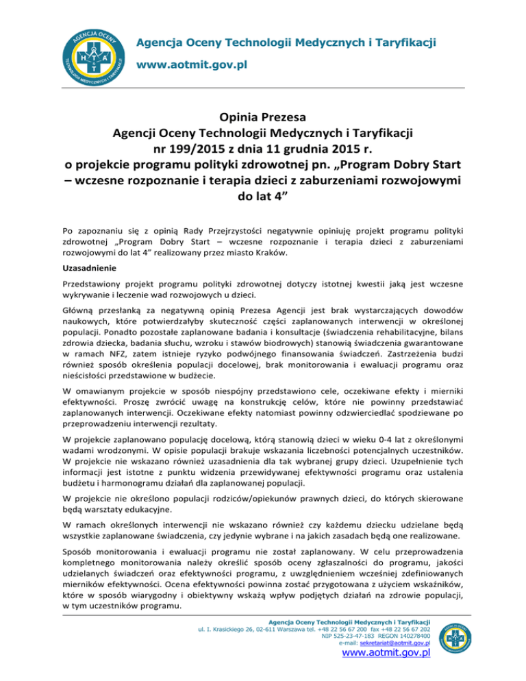 Agencja Oceny Technologii Medycznych i Taryfikacji www.aotmit.gov.pl OpiniaPrezesa AgencjiOcenyTechnologiiMedycznychiTaryfikacji nr199/2015zdnia11grudnia2015r. oprojekcieprogramupolitykizdrowotnejpn.„ProgramDobryStart –wczesnerozpoznanieiterapiadziecizzaburzeniamirozwojowymi dolat4” Po zapoznaniu się z opinią Rady Przejrzystości negatywnie opiniuję projekt programu polityki zdrowotnej „Program Dobry Start – wczesne rozpoznanie i terapia dzieci z zaburzeniami rozwojowymidolat4”realizowanyprzezmiastoKraków. Uzasadnienie Przedstawiony projekt programu polityki zdrowotnej dotyczy istotnej kwestii jaką jest wczesne wykrywanieileczeniewadrozwojowychudzieci. Główną przesłanką za negatywną opinią Prezesa Agencji jest brak wystarczających dowodów naukowych, które potwierdzałyby skuteczność części zaplanowanych interwencji w określonej populacji.Ponadtopozostałezaplanowanebadaniaikonsultacje(świadczeniarehabilitacyjne,bilans zdrowiadziecka,badaniasłuchu,wzrokuistawówbiodrowych)stanowiąświadczeniagwarantowane w ramach NFZ, zatem istnieje ryzyko podwójnego finansowania świadczeń. Zastrzeżenia budzi również sposób określenia populacji docelowej, brak monitorowania i ewaluacji programu oraz nieścisłościprzedstawionewbudżecie. W omawianym projekcie w sposób niespójny przedstawiono cele, oczekiwane efekty i mierniki efektywności. Proszę zwrócić uwagę na konstrukcję celów, które nie powinny przedstawiać zaplanowanych interwencji. Oczekiwane efekty natomiast powinny odzwierciedlać spodziewane po przeprowadzeniuinterwencjirezultaty. Wprojekciezaplanowanopopulacjędocelową,którąstanowiądzieciwwieku0-4latzokreślonymi wadami wrodzonymi. W opisie populacji brakuje wskazania liczebności potencjalnych uczestników. W projekcie nie wskazano również uzasadnienia dla tak wybranej grupy dzieci. Uzupełnienie tych informacji jest istotne z punktu widzenia przewidywanej efektywności programu oraz ustalenia budżetuiharmonogramudziałańdlazaplanowanejpopulacji. W projekcie nie określono populacji rodziców/opiekunów prawnych dzieci, do których skierowane będąwarsztatyedukacyjne. W ramach określonych interwencji nie wskazano również czy każdemu dziecku udzielane będą wszystkiezaplanowaneświadczenia,czyjedyniewybraneinajakichzasadachbędąonerealizowane. Sposób monitorowania i ewaluacji programu nie został zaplanowany. W celu przeprowadzenia kompletnego monitorowania należy określić sposób oceny zgłaszalności do programu, jakości udzielanych świadczeń oraz efektywności programu, z uwzględnieniem wcześniej zdefiniowanych miernikówefektywności.Ocenaefektywnościpowinnazostaćprzygotowanazużyciemwskaźników, które w sposób wiarygodny i obiektywny wskażą wpływ podjętych działań na zdrowie populacji, wtymuczestnikówprogramu. Agencja Oceny Technologii Medycznych i Taryfikacji ul. I. Krasickiego 26, 02-611 Warszawa tel. +48 22 56 67 200 fax +48 22 56 67 202 NIP 525-23-47-183 REGON 140278400 e-mail: [email protected] www.aotmit.gov.pl OpiniaPrezesaAOTMiTnr199/2015zdnia11grudnia2015r. Przedstawiony w projekcie budżet budzi zastrzeżenia. Wskazano jedynie koszty jednostkowe, bez uwzględnienia kosztów kampanii informacyjnej i kosztów warsztatów edukacyjnych dla dzieci. Zewzględu na brak informacji o liczbie potencjalnych uczestników programu oraz okresu realizacji niemożliwe jest określenie budżetu całkowitego. Kwestia ta powinna zostać uzupełniona, w celu zabezpieczeniaodpowiednichśrodkównarealizacjęprogramu.Wartorównieżuzupełnićinformację natematźródłafinansowaniaprogramu. Przedmiotopinii Przedmiotem opinii jest projekt programu polityki zdrowotnej dotyczący wczesnego wykrywania zaburzeńrozwojowychudzieci.Wprojekcienieprzedstawionocałkowitegobudżetuprzeznaczonego narealizacjęprogramu,nieprzedstawionotakżeplanowanegookresurealizacjiprogramu. Opinia Prezesa Agencji została przygotowana w oparciu o ocenę technologii medycznej proponowanej w ramach programu polityki zdrowotnej zgodnie z kryteriami zawartymi w art. 31a ust. 1 i art. 48 ust. 4 ustawy o świadczeniach wraz z oceną założeń projektu programu polityki zdrowotnej, które wspierają efektywność kliniczną i kosztową technologii medycznej planowanej wprogramie. Ocenaprojektuprogramupolitykizdrowotnej Znaczenieproblemuzdrowotnego Projekt programu dotyczy istotnej kwestii, jaką jest niepełnosprawność wśród dzieci. Jest to problemem ogólnoświatowy, stanowiący cel szczególnie promowanych działań WHO i Komisji Europejskiej. Bez względu na przyczyny niepełnosprawności jest uznana za poważny problem, onaturzespołecznej. Zgodnie z Rozporządzeniem Ministra Zdrowia z dnia 21 sierpnia 2009 r. w sprawie priorytetów zdrowotnych (Dz.U. 2009, Nr 137, poz. 1126), program wpisuje się w następujące priorytety zdrowotne:poprawajakościiskutecznościopiekizdrowotnejnadmatką,noworodkiemidzieckiem dolat3;atakżezapobieganie,leczenieirehabilitacjazaburzeńpsychicznych. Wprojekciewsposóbkrótkiizwięzłyprzedstawionoproblemzdrowotnyorazwskazanoogólnedane epidemiologiczne. Zgodnie z danymi Biura Pełnomocnika Rządu ds. Osób Niepełnosprawnych, liczba osób niepełnosprawnychogółemwynosiłanakoniecmarca2011r.około4,7mln(dokładnie4697,0tys.), w tym 169 121 tysięcy dzieci w wieku od 0-14 lat. Tym samym liczba osób niepełnosprawnych wPolsce stanowiła 12,2% ludności kraju wobec 14,3% w 2002 r. (blisko 5,5 mln osób niepełnosprawnychw2002roku).WedługEuropejskiegoAnkietowegoBadaniaZdrowiapodkoniec 2009 r. prawne orzeczenie o niepełnosprawności lub równoważne posiadało ok. 4,2 mln Polaków, wtymblisko184tys.dziecidolat16zaktualnymorzeczeniemoniepełnosprawności. Celeiefektyprogramu Głównymi celami programu są: zwiększenie dostępności (w jednym miejscu) wczesnej diagnostyki i kompleksowej terapii dla dzieci z niepełnosprawnością od 0 do 4 roku życia i ich rodzin, zamieszkałych na terenie miasta Krakowa, a 