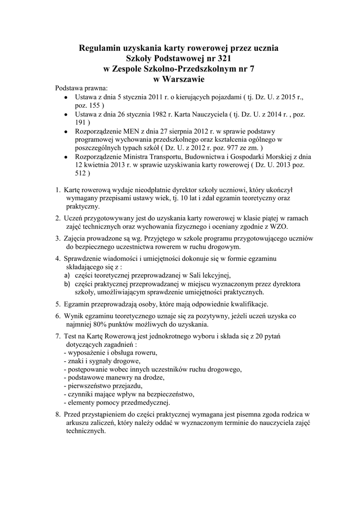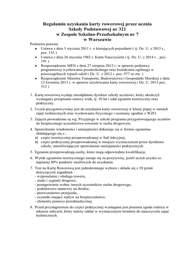 Regulamin uzyskania karty rowerowej przez ucznia Szkoły Podstawowej nr 321 w Zespole Szkolno-Przedszkolnym nr 7 w Warszawie Podstawa prawna: Ustawa z dnia 5 stycznia 2011 r. o kierujących pojazdami ( tj. Dz. U. z 2015 r., poz. 155 ) Ustawa z dnia 26 stycznia 1982 r. Karta Nauczyciela ( tj. Dz. U. z 2014 r. , poz. 191 ) Rozporządzenie MEN z dnia 27 sierpnia 2012 r. w sprawie podstawy programowej wychowania przedszkolnego oraz kształcenia ogólnego w poszczególnych typach szkół ( Dz. U. z 2012 r. poz. 977 ze zm. ) Rozporządzenie Ministra Transportu, Budownictwa i Gospodarki Morskiej z dnia 12 kwietnia 2013 r. w sprawie uzyskiwania karty rowerowej ( Dz. U. 2013 poz. 512 ) 1. Kartę rowerową wydaje nieodpłatnie dyrektor szkoły uczniowi, który ukończył wymagany przepisami ustawy wiek, tj. 10 lat i zdał egzamin teoretyczny oraz praktyczny. 2. Uczeń przygotowywany jest do uzyskania karty rowerowej w klasie piątej w ramach zajęć technicznych oraz wychowania fizycznego i oceniany zgodnie z WZO. 3. Zajęcia prowadzone są wg. Przyjętego w szkole programu przygotowującego uczniów do bezpiecznego uczestnictwa rowerem w ruchu drogowym. 4. Sprawdzenie wiadomości i umiejętności dokonuje się w formie egzaminu składającego się z : a) części teoretycznej przeprowadzanej w Sali lekcyjnej, b) części praktycznej przeprowadzanej w miejscu wyznaczonym przez dyrektora szkoły, umożliwiającym sprawdzenie umiejętności praktycznych. 5. Egzamin przeprowadzają osoby, które mają odpowiednie kwalifikacje. 6. Wynik egzaminu teoretycznego uznaje się za pozytywny, jeżeli uczeń uzyska co najmniej 80% punktów możliwych do uzyskania. 7. Test na Kartę Rowerową jest jednokrotnego wyboru i składa się z 20 pytań dotyczących zagadnień : - wyposażenie i obsługa roweru, - znaki i sygnały drogowe, - postępowanie wobec innych uczestników ruchu drogowego, - podstawowe manewry na drodze, - pierwszeństwo przejazdu, - czynniki mające wpływ na bezpieczeństwo, - elementy pomocy przedmedycznej. 8. Przed przystąpieniem do części praktycznej wymagana jest pisemna zgoda rodzica w arkuszu zaliczeń, który należy oddać w wyznaczonym terminie do nauczyciela zajęć technicznych. 9. Uczeń może przystąpić do egzaminu praktycznego na własnym rowerze posiadającym obowiązkowe wyposażenie i dostarczonym na miejsce egzaminu przez rodzica lub opiekuna. 10. Wynik z części praktycznej uznaje się za pozytywny, jeżeli uczeń wykonał 90 % manewrów i nie stwarzał zagrożenia dla ruchu drogowego. 11. Podczas egzaminu praktycznego ocenie podlegają: - przygotowanie roweru do jazdy - włączanie się do ruchu - omijanie przeszkody - przejście dla pieszych - skręcanie w prawo - skrzyżowanie równorzędne - droga dla rowerów 12. Po drugiej nieudanej próbie wykonania zadania praktycznego, egzamin zostaje przerwany i zakończony oceną negatywną. 13. Dyrektor szkoły ustala formę, miejsce i czas egzaminu praktycznego. 14. O terminie i miejscu egzaminu praktycznego rodzice informowani są dwa tygodnie wcześniej poprzez dziennik elektroniczny. 15. Uczeń ma możliwość poprawy egzaminu teoretycznego i praktycznego w następnym roku szkolnym. 16. W szkole prowadzony jest rejestr wydanych kart rowerowych i przechowywany jest on przez okres 8 lat. 17. W przypadku zagubienia karty rowerowej rodzic, w formie pisemnej może ubiegać się o wydanie duplikatu. Załącznik nr 1 Arkusz zaliczeń dla ucznia ubiegającego się o kartę rowerową Imię i nazwisko ucznia.................................................................................................Klasa……… Szkoła Podstawowa nr 321, Zespół Szkolno-Przedszkolny nr 7 w Warszawie, ul. Szadkowskiego 3 Data urodzenia .......................................……………………….……………….. Adres zamieszkania: ………….…..................................................................................................... ………………………………………….…………………………………………………………… Wyrażenie zgody rodzica/opiekuna prawnego na ubieganie się o uzyskanie karty rowerowej: Ja, ………………………………………………………………………….…… wyrażam zgodę na (imię i nazwisko rodzica) wydanie karty rowerowej mojemu dziecku ………………………………………….……………… (imię i nazwisko dziecka) Oświadczam, że stan zdrowia mojego dziecka jest dobry i nie ma przeciwwskazań zdrowotnych do prowadzenia roweru. Wyrażam zgodę na przystąpienie mojego dziecka do egzaminu praktycznego na kartę rowerową na rowerze stanowiącym własność Miasteczka Ruchu Drogowego w Warszawie. Oświadczam, że biorę odpowiedzialność za dziecko i ewentualne szkody powstałe w trakcie jazdy. ..…………………………… …….…………………………………… (miejscowość i data) (czytelny podpis rodzica/opiekuna) Sprawdzenie kwalifikacji ucznia ubiegającego się o kartę rowerową: L.p. 1. 2. 3. 4. 5. Wymagania Imię i nazwisko osoby sprawdzającej kwalifikacje Opinia wychowawcy na podstawie obserwacji ucznia Znajomość przepisów i znaków drogowych dotyczących rowerzysty Zasady zachowania w miejscu wypadku drogowego Przygotowanie roweru do jazdy i umiejętności praktyczne Bezpieczne poruszanie się rowerem. Kartę rowerową wydano w szkole dnia ............................................................................ DYREKTOR SZKOŁY ........................................................ (pieczęć, podpis) Podpis