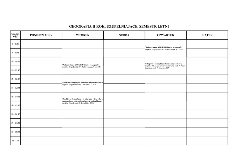 GEOGRAFIA II ROK, UZUPEŁNIAJĄCE, SEMESTR LETNI Godziny zajęć PONIEDZIAŁEK WTOREK ŚRODA CZWARTEK 8 – 8:45 Wykorzystanie ARCGIS Collector w geografii (wykład 26 godzin) dr W. Retkiewicz gr. B s. 217N 9 – 9:45 10 – 10:45 Wykorzystanie ARCGIS Collector w geografii (wykład 26 godzin) dr W. Retkiewicz gr. A s. 217N 11 – 11:45 12 – 12:45 Problemy wód pitnych, leczniczych i geotermalnych (wykład 26 godzin) dr M. Ziułkiewicz s. 307N 13 – 13:45 14 – 14:45 Obiekty hydrograficzne w miastach i ich rola w zagospodarowaniu miejskiej przestrzeni publicznej (wykład 26 godzin) dr P. Tomalski s. 239N 15 – 15:45 16 – 16:45 17 – 17:45 18 – 18:45 19 – 20 Fotografia – narzędzie dokumentacji naukowej (wykład 13 godzin i konwersatorium) prof. J. PeteraZganiacz, prof. P. Czubla s. 307N PIĄTEK