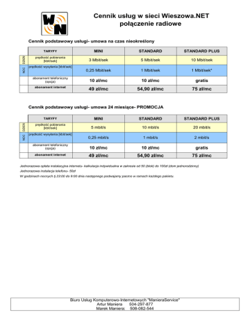 Cennik usług w sieci Wieszowa.NET połączenie radiowe NOC DZIEŃ Cennik podstawowy usługi- umowa na czas nieokreślony TARYFY MINI STANDARD STANDARD PLUS prędkość pobierania [kbit/sek] 3 Mbit/sek 5 Mbit/sek 10 Mbit/sek 0,25 Mbit/sek 1 Mbit/sek 1 Mbit/sek* 10 zł/mc 10 zł/mc gratis 49 zł/mc 54,90 zł/mc 75 zł/mc prędkość wysyłania [kbit/sek] abonament telefoniczny (opcja) abonament internet NOC DZIEŃ Cennik podstawowy usługi- umowa 24 miesiące- PROMOCJA TARYFY MINI STANDARD STANDARD PLUS prędkość pobierania [kbit/sek] 5 mbit/s 10 mbit/s 20 mbit/s 0,25 mbit/s 1 mbit/s 2 mbit/s abonament telefoniczny (opcja) 10 zł/mc 10 zł/mc gratis abonament internet 49 zł/mc 54,90 zł/mc 75 zł/mc prędkość wysyłania [kbit/sek] Jednorazowa opłata instalacyjna internetu- kalkulacja indywidualna w zakresie od 50 (blok) do 100zł (dom jednorodzinny) Jednorazowa instalacja telefonu- 50zł W godzinach nocnych tj 23:00 do 9:00 dnia następnego podwajamy pasmo w ramach każdego pakietu. Biuro Usług Komputerowo-Internetowych "ManieraService" Artur Maniera 504-297-877 Marek Maniera: 508-082-544 Opłaty za usługi dodatkowe w sieci Wieszowa.NET Usługi dodatkowe kwota brutto Cechy Ponowna aktywacja 50,00 zł Ponowna aktywacja usług po wcześniejszym odłączeniu z winy abonenta. Adres publiczny Instalacja dodatkowych stanowisk 5 zł/mc Opłata miesięczna za dodatkowy adres z puli adresów publicznych. Koszt instalacji dodatkowych stanowisk jest dla każdego przypadku inny. Niezbędny sprzęt, kable i urządzenia klient musi nabyć we własnym zakresie lub zakupić w firmie Maniera Service. Każdy przypadek instalacji dodatkowego stanowiska jest inny i wymaga indywidualnej kalkulacji. Karta sieciowa Switch 8-portowy Nadajnik bezprzewodowy 30,00 zł 60,00 zł 120,00 zł kabel UTP kat 5e kabel UTP kat 5e 2,00 zł 1,00 zł Karta sieciowa do komputera. Cena za urządzenie rozdzielające sygnał. Nadajnik bezprzewodowy na dom 54B/G/N. Cena ze 1m bieżący kabla typu skrętka UTP ekranowany. Cena ze 1m bieżący kabla typu skrętka UTP nieekranowana. Opłaty za usługi hostingowe Usługi dodatkowe kwota brutto Utrzymanie domeny WWW WWW+poczta+baza 30,00 zł 61,50 zł 123,00 zł Cechy Zaparkowanie domeny na naszym serwerze. Utrzymanie wirtualnej strony www (php4/5). Strona www oparta na bazie danych, wirtualny serwer www, php4/5, wirtualny serwer pocztowy. Opłaty za usługi telefoniczne podstawowe i dodatkowe Usługi kwota brutto aktywacja usługi przeniesienie numeru biling elektroniczny prezentacja numeru prezentacja numeru fax 50,00 zł 60,00 zł 0,00 zł 0,00 zł 0,00 zł 3zł/mc Cechy Aktywacja Usługi przeniesienie numeru od innego operatora Biling dostępny z panelu administracyjnego. Prezentacja własnego numeru. Prezentacja numeru dzwoniącego. Usługa fax to mail. Uwagi odnośnie instalacji: Każda instalacja zakończona gniazdkiem o wtyku RJ45 we wskazanym przez klienta miejscu. W umowie na czas nieokreślony istnieje możliwość zawieszania usługi na okres do 3 mc. Przy zawieszeniu usługi nie płaci się opłaty abonamentowej. Wszystkie podane ceny zawierają podatek VAT 23%. Biuro Usług Komputerowo-Internetowych "ManieraService" Artur Maniera 504-297-877 Marek Maniera: 508-082-544