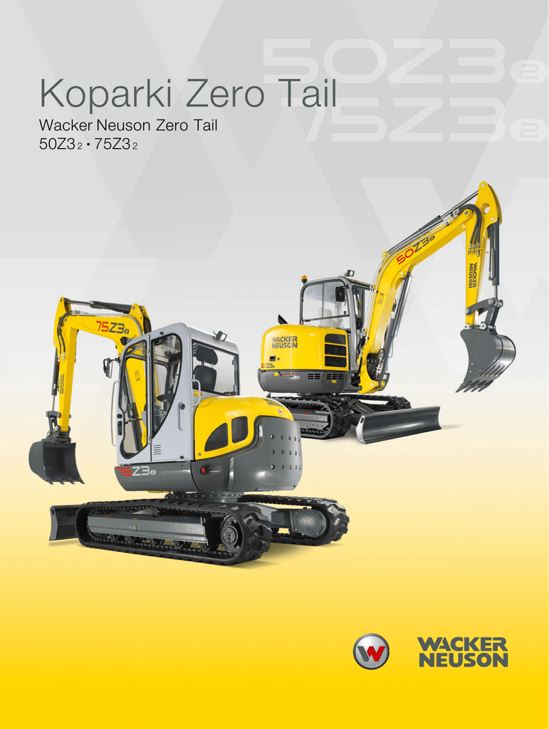 Koparki Zero Tail Wacker Neuson Zero Tail 50Z3 2 • 75Z3 2 Uwolnij swoje plecy: Koparki Zero Tail od Wacker Neuson. Fakty Wacker Neuson: • Brak tylnego zwisu i kompaktowe wymiary. • Przestrzenna kabina ułatwiająca dostęp. • Większy komfort dzięki odizolowaniu jednostki napędowej od kabiny. • Przestronny • W dostęp na czas przeglądu. opcji trzeci obwód sterujący. • Indywidualne możliwości wyposażenia. •2 - kierunkowy dodatkowy układ hydrauliczny z bezciśnieniowym przewodem powrotnym do młota. • 2 prędkości automatyczne jazdy. •Przechylna kabina (spełnia aktualne wymagania ROPS, TOPS i FOPS**). •System kopania pionowego (VDS): Możliwość ciągłego poziomowania górnej struktury koparki w zakresie do 15°.* Maszyny Zero Tail przekonują swoją mocą, zwrotnością i najwyższym komfortem. Koncepcja bocznego położenia silnika a zbiorników w tylnej części maszyny sprawia, że to wszystko staje się realne. Tam gdzie wszystkie inne maszyny nie radzą sobie z ograniczoną przestrzenią terenów roboczych, 5 modele maszyn Zero Tail firmy Wacker Neuson są w stanie zapewnić najwyższe parametry eksploatacyjne. System, Zero Tail Wacker Neuson nie jest wynikiem pójścia na kompromis, ale podstawą prowadzącą do uzyskania solidnej i niezależnej maszyny. Innowacja w ruchu. * Opcja (50Z32) ** FOPS (poziom ochrony I lub II), tylko przy zastosowaniu dodatkowych kratownic – dostępny opcjonalnie. Idealna wszechstronność: Wiodąca konstrukcja. Ekonomiczna praca. Fakty Wacker Neuson: • Większa ekonomiczność, mniejsza ilość przeglądów, większy i cichszy silnik; filtr cząstek stałych w opcji. • Regulowany w pięciu osiach (5) komfortowy fotel. • Zasada konstrukcyjna Zero Tail. • Konstrukcja ramy X z wysokiej jakości stali. • Przechylna kabina. • Wymienne tuleje w dużych łożyskach. Unikalna metoda konstrukcji maszyn Zero Tail Wacker Neuson. Silnik umieszczony z boku maszyny z dodatkową ścianką izolującą go od kabiny: - Minimalizacja hałasu i drgań przenoszonych do kabiny. - Dostęp do silnika Diesla i podzespołów daje najlepsze możliwości wykonywania przeglądów i konserwacji. Zespół zaworu kontrolnego, zbiornik paliwa, zbiornik oleju hydraulicznego z tyłu maszyny: - Mniejsza ilość ciepła przekazywanego do kabiny. Koncepcja maszyn Zero Tail Wacker Neuson umożliwiła zbudowanie większej kabiny, tym samym stworzenie przestronnego miejsca na nogi i dużą przestrzeń nad głową kierowcy. 4 _ 5 WACKER NEUSON PRZEGLĄD Wzajemne powiązania technologiczne: Przewaga pochodząca z interakcji lepszych idei. Mocna konstrukcja stalowa, sprawdzona hydraulika, inteligentna elektronika, silniki o dużej mocy, a także kompletne wyposażenie stanowią podstawę uzyskania wyższej wydajności maszyn Zero Tail Wacker Neuson: 1 2- kierunkowy dodatkowy układ hydrauliczny z bezciśnieniowym przewodem powrotnym do młota w standardzie. Układ sterujący do chwytaka z dodatkowym trzecim obwodem sterowania dla osprzętu (z opcjonalnym sterowaniem proporcjonalnym) dostępny na życzenie. 5 Innowacyjny system szybkiej wymiany EASY LOCK został optymalnie dostosowany do działania obydwu modeli 50Z3 2 i 75Z3 2 i wpływa w decydujący sposób na ulepszenie procesów pracy: Podjedź, podłącz, a blokada włączy się automatycznie. Ze względu na niewielką wysokość konstrukcji, kąt przesunięcia łyżki jest w pełni utrzymywany. To w dużym stopniu wpływa na udoskonalenie przebiegu pracy. 2 Praca w trybie automatycznego biegu jałowego. Po upływie 5 sekund bezczynności, silnik automatycznie przechodzi w tryb prędkości biegu jałowego. To rozwiązanie zmniejsza zużycie paliwa i hałas. Opcja w modelu 50Z3 2 i 75Z3 2 należy do wyposażenia standardowego. Duży układ hydrauliczny zapewnia wyraźną nadwyżkę wydajności, dlatego uzyskanie 100 % wydajności jest gwarantowane w temperaturze otoczenia do 45 °C. 3 Filtr cząstek stałych (opcja) do wszystkich zastosowań tam, gdzie czyste powietrze ma szczególne znaczenie: W zamkniętych przestrzeniach lub przy budowie tuneli i górnictwie. 1 2 3 4 Sterowanie proporcjonalne (opcja) pozwala na regulację krzywych charakterystyki w zależności od działania i przesunięcia odpowiedniego osprzętu. Po naciśnięciu przycisku, można się przełączać między krzywymi charakterystyki, co gwarantuje synchronizację w każdym przypadku między koparką i narzędziem. 4 szybko powoli Ulepszona konstrukcja i procesy pracy potrzebują technologii, która nie tylko „współgra“, ale również będzie niosła ze sobą udogodnienia. Niezależnie od tego, czy będzie to szybki system wymiany, hydraulika, sterowanie proporcjonalne, czy praca automatyczna na prędkości biegu jałowego: Skuteczne wartościowe wyniki można uzyskać wyłącznie poprzez zastosowanie technologii, która jest energooszczędna, pozwala zaoszczędzić czas i jest opłacalna z punktu widzenia ekologicznego. Maszyny Zero Tail Wacker Neuson stanowią wzór opracowany pod kątem pracy w wąskich przestrzeniach roboczych oraz uzyskania najwyższej możliwej skuteczności. Maszyny te mają niewielkie wymagania konserwacyjne, charakteryzuje je wysoki współczynnik dostępności oraz szczególna trwałość. Uosabiają przyszłościowe możliwości. W prawdziwym tego słowa znaczeniu. 5 6 _ 7 WACKER NEUSON SILNIK, HYDRAULIKA Inteligencja praktyczna: Wszystko przemyślane i realizowane z dużym udziałem umiejętności. 1 2 3 1 Przechylna kabina ułatwia dostęp do podzespołów znajdujących się pod nią. 2 Szybki dostęp do silnika dzięki bocznemu położeniu oraz dużemu kątowi otwarcia pokrywy. 3 Wnękowe złączki we wszystkich punktach smarowania zespołu ramienia. Ze względu na konstrukcję, smar przedostaje się bezpośrednio do łożysk. 4 5 6 4 Sztywne ramy X ze stali wysokiej jakości. Mocna i pewna podstawa zapewnia długą trwałość użytkową, a także pozwala na pracę przy pełnym obciążen