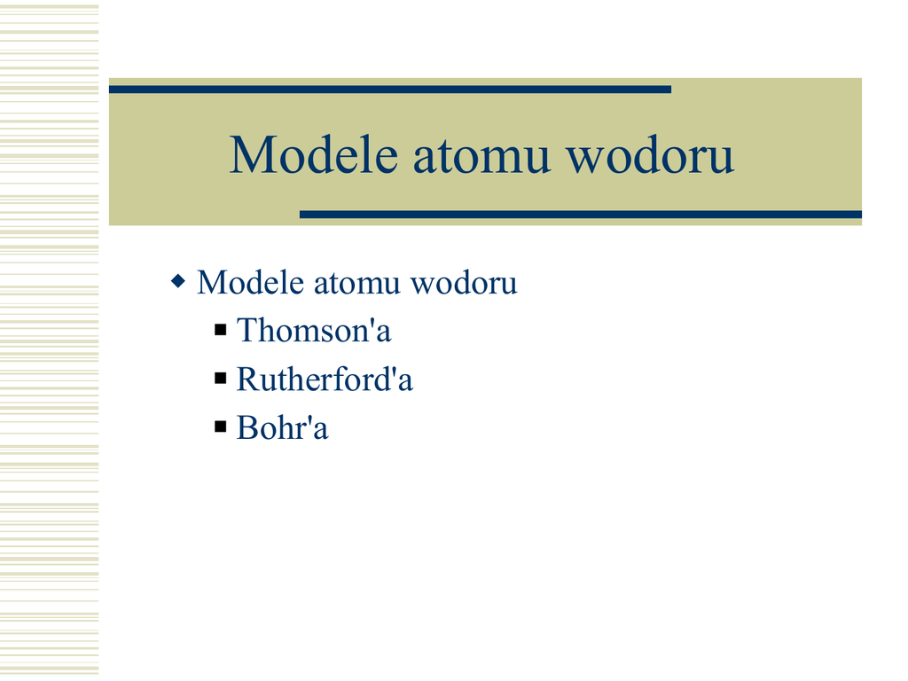 Modele atomu wodoru Modele atomu wodoru Thomson'a Rutherford'a Bohr'a Co to jest atom? – trochę historii • Demokryt: V w. p.n.e • najmniejszy, niepodzielny metodami chemicznymi składnik materii. • atomos - niepodzielny • XVII i XVIII i XIX w. n.e. - osiągnięcia w nowoczesnej chemii (Proust, Gay-Lussac, Lavoisier, Dalton etc.) • hipoteza Avagadro (NA = 6.022 × 1023 atomów/mol) • masa atomowa u ≈ 1.66 x 10-27 kg rozmiar ≈ 1Å (1 x 10-10 m) jeden typ atomu dla każdego pierwiastka Dalton – powrót atomistycznej koncepcji budowy materii robiąc pomiary mas atomowych spostrzegł,że masy atomowe są wielokrotnościami masy atomu wodoru Co to jest atom? – trochę historii Odkrycie elektronu badanie elektrycznych wyładowań w gazach w XIX w. – „promienie katodowe” 1897 J.J. Thompson -v +v Thomson badał promieniowanie ultrafioletowe powstające w lampie katodowej. Zainspirowany pracami Maxwella stwierdził, że promienie katodowe są strumieniem ujemnie naładowanych cząstek, które nazwał korpuskułami, a które dziś znamy jako elektrony. „promienie katodowe” mają masę masa ta jest proporcjonalna do ładunku wyznaczył doświadczalnie q/m w „promieniach katodowych” i udowodnił że są to cząstki elektrony Póżniej Miliken wyznaczył ładunek elektronu =1.60 10-19 C więc można było wyliczyć jaka jest jego masa = 9.11 10-31 kg Co wiedziano o atomach w XIX w.? Atomy są stabilne: Wszystkie atomy które tworzą świat wokół nas są tymi samymi atomami uformowanymi biliony lat temu Atomy zawierają elektrony które mają masę (0.05% atomu) i posiadają ładunek ujemny Atomy posiadają też ładunek dodatni aby atom był elektrycznie obojętny Atomy emitują i absorbują światło np. gazowy wodór (albo sód) pochłania tylko wybrane długości fal padającego promieniowania e-m, ale także odpowiednio „pobudzony” potrafi emitować promieniowanie e-m o tych samych długościach fal. Pierwsze modele atomu Model atomu – Thomson model „ciasteczka z rodzynkami” dodatnio naładowany kulisty atom z elektronami o ujemnych ładunkach rozmieszczonych w środku Model atomu – Rutherford odkrył, że dodatnio naładowane jądro atomu skupia w sobie większość masy i jednocześnie jest bardzo małe (~ 10-15m) w porównaniu z rozmiarami całego atomu (~ 10-10m) Atom jest w 99.9999999999 % pusty Elektrony poruszają się wokół jądra (ale jak???) Pierwsze modele atomu Dlaczego, gdy atom jest w spoczynku, elektrony poruszając się ruchem przyspieszonym wokół jądra nie emitują fali elektromagnetycznej? Przykład: dł.fali emitowane przez wodór dlaczego elektrony nie spadają na jądro? Atomy emitują i absorbują światło, ale dlaczego atomy emitują (absorbują) tylko wybrane dł. fali światła? - problem z widmami atomowymi. Promieniowanie wodoru jest „dyskretne” - widmo liniowe Długości fal „prążków” spełniają pewną zależność: 1 1 1 = R 2 − 2 λ n 2 R ≈ 1.1× 107 m − 1 Model atomu Bohra Założenia: Elektrony są przyciągane przez jądro siłą elektrostatyczną Coulomba Elektrony poruszają się tylko po kołowych orbitach i tylko niektóre z tych orbit są stabilne! Tym orbitom odpowiadają określone energie elektronu - zatem elektron może mieć tylko określone energie!!! (znowu kwantyzacja energii!!! podobnie jak u Planck'a) jądro elektron orbita Poziomy energetyczne Model Bohra atomu wodoru Postulat 1 : Elektrony są przyciągane przez jądro siłą elektrostatyczną Coulomba, zatem mv 2 ke2 = 2 r r siła dośrodkowa Postulat 2: Dozwolone są tylko te orbity które zapewniają, że moment pędu elektronu jest wielokrotnością stałej Planck'a !!! Orbity elektronów są skwantowane !!! siła Coulomb'a mvr = n wartość momentu pędu h = 2π Model Bohra atomu wodoru Z tych postulatów można wyznaczyć promień orbity: Postulat 2 Postulat 1 Widać, że promień orbity zależy tylko od n -pewnej liczby całkowitej – orbity elektronu możemy zatem numerować n v= mr 2 2 rmv = ke n 2 2 rm 2 2 = ke 2 mr n 2 2 2 = ke mr n 2 2 2 r= = n a0 2 mke Model atomu Bohra Atom promieniuje jeśli elektron przeskakuje z orbity dalszej od jądra na orbitę bliżej jądra Atom absorbuje promieniowanie jeśli elektron przeskakuje z orbity bliżej jądra na orbitę dalszą od jądra En = − 13.6 [eV] 2 n 1 1 Eu − El = − 13.6 2 − 2 [eV] = hν nl nu wyższa orbita – wyższy poziom energetyczny hυ niższa orbita – niższy poziom energetyczny Model Bohra atomu wodoru Schemat poziomów energetycznych w atomie wodoru. Liczba kwantowa n oznacza numer poziomu. Możliwe są różne sposoby „spadania” elektronu na niższe poziomy – odpowiadają temu tzw. Serie Lymana, Balmera, Paschena... od nazwisk ich odkrywców. Model Bohra atomu wodoropodobnego Niestety! Dziś model Bohra ma znaczenie tylko historyczne. Model Bohr'a daje dobre rezultaty tylko dla atomu wodoru (lub atomów tzw. wodoropodobnych – tzw. jedno-elektronowych: zjonizowany atom He+, dwukrotnie zjonizowany atom Li++) Nie można wyjaśnić za pomocą niego widm liniowych wielu gazów – pierwiastków „wielo-elektronowych” - zatem model ten jest niepełny!!! Postulaty Bohra dość dowolnie traktują prawa fizyki klasycznej akceptują prawo Coulomba, odrzucają prawa klasycznej elektrodynamiki dot. promieniowania elektromagetycznego Obecnie traktuje się ten model jako początkowe stadium rozwoju teorii atomu - tzw. stara teoria kwantów. Obecnie budowę atomu opisuje się za pomocą „mechaniki kwantowej” matematycznie bardzo skomplikowana teoria
