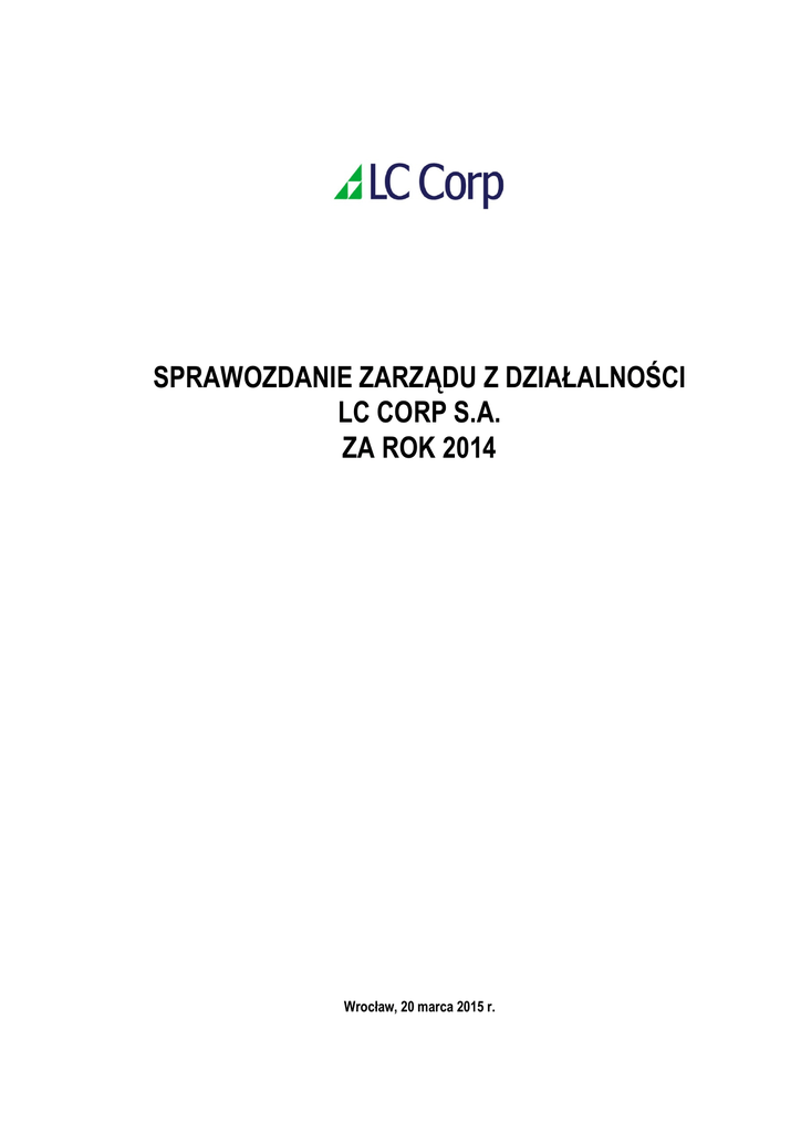SPRAWOZDANIE ZARZĄDU Z DZIAŁALNOŚCI LC CORP S.A. ZA ROK 2014 Wrocław, 20 marca 2015 r. Zasady sporządzenia rocznego sprawozdania finansowego LC Corp S.A. Zgodnie z przepisami ustawy o rachunkowości z dnia 29 września 1994 r., Zarząd jest zobowiązany zapewnić sporządzenie rocznego sprawozdania z działalności Spółki w okresie obrotowym, obejmującego istotne informacje o stanie majątkowym, sytuacji finansowej, ocenę uzyskiwanych efektów oraz wskazanie czynników ryzyka i opis zagrożeń. Niniejsze sprawozdanie z działalności LC Corp S.A. (dalej zwanej „LC Corp”, „Spółką” lub „Emitentem”) obejmuje okres od 1 stycznia do 31 grudnia 2014 r. Raport roczny LC Corp S.A. za okres sprawozdawczy od dnia 01.01.2014 r. do dnia 31.12.2014 r. zawiera: • Sprawozdanie finansowe LC Corp S.A. za okres sprawozdawczy od 01.01.2014 r. do 31.12.2014 r. oraz na dzień 31.12.2014 r. sporządzone zgodnie z Międzynarodowymi Standardami Sprawozdawczości Finansowej, w tym: sprawozdanie z sytuacji finansowej, sprawozdanie z całkowitych dochodów, sprawozdanie z przepływów pieniężnych, sprawozdanie ze zmian w kapitale własnym oraz noty objaśniające do sprawozdania finansowego. • Porównawcze dane finansowe do sprawozdania finansowego na dzień 31.12.2013 r. oraz za okres 12 miesięcy zakończony 31.12.2013 r. • Sprawozdanie Zarządu z działalności LC Corp S.A. za okres od 01.01.2014 r. do 31.12.2014 r. • Oświadczenia Zarządu zgodnie z § 91 ust. 1 pkt 5) i 6) Rozporządzenia Ministra Finansów z dnia 19 lutego 2009 r. w sprawie informacji bieżących i okresowych przekazywanych przez emitentów papierów wartościowych oraz warunków uznawania za równoważne informacji wymaganych przepisami prawa państwa nie będącego państwem członkowskim. 1. PODSTAWOWE INFORMACJE O SPÓŁCE LC Corp S.A. (dalej również jako „LC Corp”, „Spółka” lub „Emitent”) została utworzona aktem notarialnym dnia 3 marca 2006 r. i wpisana w dniu 15 marca 2006 r. do Krajowego Rejestru Sądowego prowadzonego przez Sąd Rejonowy dla Wrocławia – Fabrycznej we Wrocławiu, VI Wydział Gospodarczy Krajowego Rejestru Sądowego pod numerem KRS 0000253077. Siedziba Spółki dominującej mieści się w Polsce we Wrocławiu, ul. Powstańców Śląskich 2-4. Spółce nadano numer statystyczny REGON 020246398. Czas trwania Spółki jest nieoznaczony. Podstawowym przedmiotem działania Spółki jest działalność holdingów finansowych (PKD 64.20.Z). Podmiotem dominującym spółki LC Corp S.A. jest LC Corp B.V., która jest kontrolowana przez Pana Leszka Czarneckiego. Spółka jest jednostką dominującą wobec podmiotów wchodzących w skład grupy kapitałowej LC Corp (dalej również jako „Grupa”). W skład Grupy Kapitałowej LC Corp na dzień 31.12.2014 r. wchodziła LC Corp S.A. oraz następujące spółki zależne: 2 Nazwa spółki Arkady Wrocławskie S.A. z siedzibą we Wrocławiu Sky Tower S.A. z siedzibą we Wrocławiu Warszawa Przyokopowa Sp. z o.o. z siedzibą we Wrocławiu 1 Kraków Zielony Złocień Sp. z o.o. z siedzibą we Wrocławiu LC Corp Invest I Sp. z o.o. z siedzibą we Wrocławiu LC Corp Invest II Sp. z o.o. z siedzibą we Wrocławiu LC Corp Invest III Sp. z o.o. z siedzibą we Wrocławiu LC Corp Invest VII Sp. z o.o. z siedzibą we Wrocławiu LC Corp Invest VIII Sp. z o.o. z siedzibą we Wrocławiu LC Corp Invest IX Sp. z o.o. z siedzibą we Wrocławiu LC Corp Invest X Sp. z o.o. z siedzibą we Wrocławiu LC Corp Invest XI Sp. z o.o. z siedzibą we Wrocławiu 2 LC Corp Invest XII Sp. z o.o. z siedzibą we Wrocławiu 3 LC Corp Invest XV Sp. z o.o. z siedzibą we Wrocławiu LC Corp Invest XVI Sp. z o.o. z siedzibą we Wrocławiu LC Corp Invest XVII Sp. z o.o. z siedzibą we Wrocławiu LC Corp Invest XVIII Sp. z o.o. z siedzibą we Wrocławiu 4 LC Corp Invest XV Sp. z o.o. Projekt 1 Sp. k. z siedzibą we Wrocławiu LC Corp Invest XV Sp. z o.o. Projekt 2 Sp. k. z siedzibą we Wrocławiu LC Corp Invest XV Sp. z o.o. Projekt 3 Sp. k. z siedzibą we Wrocławiu LC Corp Invest XV Sp. z o.o. Projekt 4 Sp. k. z siedzibą we Wrocławiu LC Corp Invest XV Sp. z o.o. Projekt 5 Sp. k. z siedzibą we Wrocławiu LC Corp Invest XV Sp. z o.o. Projekt 6 Sp. k. z siedzibą we Wrocławiu LC Corp Invest XV Sp. z o.o. Projekt 7 Sp. k. z siedzibą we Wrocławiu LC Corp Invest XV Sp. z o.o. Projekt 8 Sp. k. z siedzibą we Wrocławiu LC Corp Invest XV Sp. z o.o. Projekt 9 Sp. k. z siedzibą we Wrocławiu LC Corp Invest XV Sp. z o.o. Projekt 10 Sp. k. z siedzibą we Wrocławiu LC Corp Invest XV Sp. z o.o. Projekt 11 Sp. k. z siedzibą we Wrocławiu 5 LC Corp Invest XV Sp. z o.o. Projekt 14 Sp. k. z siedzibą we Wrocławiu 6 LC Corp Invest XVII Sp. z o.o. Projekt 20 Sp. k. z siedzibą we Wrocławiu LC Corp Invest XV Sp. z o.o. Finance S.K.A. LC Corp Invest XV Sp. z o.o. Investmets S.K.A. LC Corp Invest XVIII Sp. z o.o. Real Estate S.K.A. 7 Wysokość kapitału na dzień 31.12.2014 r. w PLN 113.700.000 23.100.000 33.001.000 11.230.000 5.000 88.800.000 6.700.000 4.000.000 13.500.000 4.700.000 10.300.000 41.000.000 24800.000 5.000 5.000 5.000 5.000 50.000 91.905.080 50.000 Efektywny udział LC Corp S.A. 31.12.2014 r. 31.12.2013 100% 100% 100% (pośrednio i bezpośrednio) 100% 100% (pośrednio i bezpośrednio) 100% 100% 100% 100% 100% 100% 100% 100% 100% 100% 100% 100% 100% (pośrednio) 100% (pośrednio) 100% (pośrednio) 100% (pośrednio) 100% (pośrednio) 100% (pośrednio) 100% (pośrednio) 100% (pośrednio) 100% (pośrednio) 100% (pośrednio) 100% (pośrednio) 100% (pośrednio) 100% (pośrednio) 100% (pośrednio i bezpośrednio) 100% (pośrednio i bezpośrednio) 100% (pośrednio i bezpośrednio) 100% 100% 100 % 100% 100% (pośrednio i bezpośrednio) 100% 100% 100% 100% 100% 100% 100% 100% 100% 100% 100% 100% (pośrednio) 100% (pośrednio) 100% (pośrednio) 100% (pośrednio) 100% (pośrednio) 100% (pośrednio) 100% (pośrednio) 100% (pośrednio) 100% (pośrednio) 100% (pośrednio) 100%