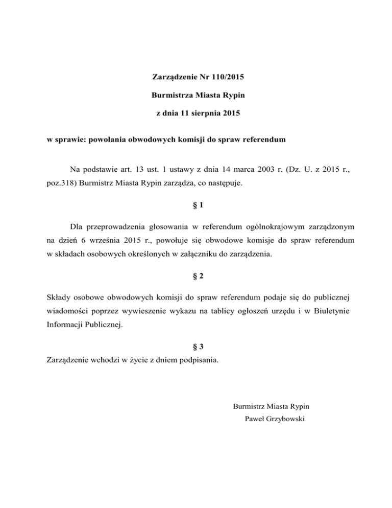 Zarządzenie Nr 110/2015 Burmistrza Miasta Rypin z dnia 11 sierpnia 2015 w sprawie: powołania obwodowych komisji do spraw referendum Na podstawie art. 13 ust. 1 ustawy z dnia 14 marca 2003 r. (Dz. U. z 2015 r., poz.318) Burmistrz Miasta Rypin zarządza, co następuje. §1 Dla przeprowadzenia głosowania w referendum ogólnokrajowym zarządzonym na dzień 6 września 2015 r., powołuje się obwodowe komisje do spraw referendum w składach osobowych określonych w załączniku do zarządzenia. §2 Składy osobowe obwodowych komisji do spraw referendum podaje się do publicznej wiadomości poprzez wywieszenie wykazu na tablicy ogłoszeń urzędu i w Biuletynie Informacji Publicznej. §3 Zarządzenie wchodzi w życie z dniem podpisania. Burmistrz Miasta Rypin Paweł Grzybowski Załącznik nr 1 do Zarządzenia Nr 110/2015 Burmistrza Miasta Rypin z dnia 11.08.2015 r. Obwodowa Komisja Wyborcza Nr 1 Liceum Ogólnokształcące w Rypinie, ul. Kościuszki 51 1. Pawlak Dawid 2. Rumińska Krystyna 3. Lipka-Szalkowska Monika 4. Trojakowska Magdalena 5. Pawłowska Mariola, Ewa 6. Cześnik Beata, Anna 7. Kamiński Zdzisław 8. Wesołowski Andrzej 9. Cywińska Ewa - pracownik samorządowy Obwodowa Komisja Wyborcza Nr 2 Liceum Ogólnokształcące w Rypinie, ul. Kościuszki 51 1. Brudecki Kamil 2. Sitkowska Marta 3. Trojakowska Paulina 4. Trzcińska Anna, Maria 5. Jadczak Marcin 6. Kamińska Aleksandra, Irena 7. Wiśniewska Mirosława, Ewa 8. Błaszkiewicz Tomasz 9. Chmielewski Karol - pracownik samorządowy Obwodowa Komisja Wyborcza Nr 3 Rypiński Dom Kultury w Rypinie, ul. Warszawska 8 1. Makowski Michał 2. Witkowska Aleksandra, Lidia 3. Jastrzębski Mieczysław 4. Kleps Andrzej 5. Watkowska Anna 6. Raczkowski Rafał 7. Rutkowska Katarzyna 8. Biernacka Aneta 9. Szwankowska Agnieszka - pracownik samorządowy Obwodowa Komisja Wyborcza Nr 4 Muzeum Ziemi Dobrzyńskiej w Rypinie, ul. Warszawska 20 1. Gurtatowska Zyta 2. Mazurkiewicz Anna 3. Rybka Renata 4. Pawłowski Piotr 5. Kruszkiewicz Katarzyna 6. Witkowska Anna 7. Rutkowski Piotr 8. Piotrowska Agnieszka, Sylwia 9. Krajewski Błażej - pracownik samorządowy Obwodowa Komisja Wyborcza Nr 5 Starostwo Powiatowe w Rypinie, ul. Warszawska 38 1. Grabkowska Oliwia, Maria 2. Raczkowska Barbara 3. Alichnowicz Piotr 4. Pawłowska Iwona 5. Liszewski Robert 6. Łapkiewicz Teresa 7. Woźnicka Katarzyna 8. Kożuch Robert, Jarosław 9. Błaszczak Aleksandra - pracownik samorządowy Obwodowa Komisja Wyborcza Nr 6 Urząd Miasta Rypin, ul. Warszawska 40 1. Świtanowska Krystyna 2. Witkowska Aneta 3. Skomra Helena 4. Kamiński Karol 5. Ardtka Marlena 6. Makowska Karolina 7. Rutkowski Mateusz 8. Kędziorska Daniela 9. Węglarz Kamila - pracownik samorządowy Obwodowa Komisja Wyborcza Nr 7 Szkoła Podstawowa Nr 3 w Rypinie, ul. Młyńska 12 1. Górecki Patryk 2. Górecki Włodzimierz 3. Liszewska Zofia 4. Żytowiecka Bożena 5. Liszewska Zofia 6. Durszlewicz-Topa Ewa, Danuta 7. Szulc Przemysław 8. Bernat Katarzyna 9. Turalski Marcin - pracownik samorządowy Obwodowa Komisja Wyborcza Nr 8 Szkoła Podstawowa Nr 3 w Rypinie, ul. Młyńska 12 1. Łyczak Maciej 2. Rębacz Karolina, Marta 3. Dębski Jan 4. Witkowska Filomena 5. Krajewska Anna, Halina 6. Smolińska Anna 7. Bogucka Henryka 8. Krukowski Grzegorz 9. Tyburska Dorota - pracownik samorządowy Obwodowa Komisja Wyborcza Nr 9 Szkoła Podstawowa Nr 1 w Rypinie, ul. 3 Maja 3. 1. Świerczyńska Izabela 2. Ryncarz Irmina 3. Sieklicki Bartosz, Michał 4. Czajkowska Anna 5. Kędziorska Maria, Hanna 6. Borkowski Łukasz 7. Mazanowski Kamil, Łukasz 8. Zaczkiewicz Sylwia 9. Kowalczyk Marcin - pracownik samorządowy Obwodowa Komisja Wyborcza Nr 10 Szkoła Podstawowa Nr 1 w Rypinie, ul. 3 Maja 3. 1. Kamiński Paweł 2. Brokos Alicja 3. Kędziorski Jerzy, Jan 4. Ostrowska Aleksandra 5. Boniecka Małgorzata 6. Łażewski Piotr 7. Kowalczyk Mariusz 8. Kostuj Dariusz 9. Głowacki Kamil - pracownik samorządowy Obwodowa Komisja Wyborcza Nr 11 Zespół Szkół Nr 2 w Rypinie, ul. Dworcowa 9 1. Biernat Barbara 2. Wyskiel Adriana 3. Witkowski Miłosz 4. Lemański Eugeniusz, Zdzisław 5. Mazanowska Hanna, Iwona 6. Trzcińska Grażyna, Jolanta 7. Morawski Jarosław 8. Felicki Karol, Adam 9. Jarzębowska Żaneta - pracownik samorządowy Obwodowa Komisja Wyborcza Nr 12 Zespół Szkół Nr 2 w Rypinie, ul. Dworcowa 9 1. Górecki Robert 2. Sieklicka Justyna 3. Ciurzyńska Teresa, Ewa 4. Kwiatkowski Andrzej 5. Wiesztort Anna 6. Lemańska Barbara, Czesława 7. Chojnacka Marzena 8. Radecki Mariusz 9. Westfal Ewa - pracownik samorządowy Obwodowa Komisja Wyborcza Nr 13 Rypińskie Centrum Sportu w Rypinie, ul. Dworcowa 11 1. Treider Kinga 2. Asztemborski Jan, Wojciech 3. Błaszkiewicz Dorota 4. Gmiński Jakub 5. Wojnowska Sylwia 6. Kaliciecka Halina 7. Świeczkowski Maciej 8. Wesołowska Helena 9. Lewandowska Joanna - pracownik samorządowy Obwodowa Komisja Wyborcza Nr 14 Rypińskie Centrum Sportu w Rypinie, ul. Dworcowa 11 1. Czajkowski Jacek 2. Naruszko Norbert, Grzegorz 3. Góralczyk Agnieszka 4. Witkowska Michalina 5. Jackowski Jacek 6. Goślicka-Bartoszyńska Dorota 7. Jaszczułt Krystyna 8. Kadzińska Irena 9. Tuszko Alicja - pracownik samorządowy Obwodowa Komisja Wyborcza Nr 15 Świetlica Spółdzielni Mieszkaniowej Lokatorsko - Własnościowej w Rypinie, ul. Wojska Polskiego 9 1. Chełmicka Małgorzata 2. Fede Ewa 3. Witkowski Marek 4. Pausz Urszula 5. Tomaszewska Urszula 6. Pawlak Hanna 7. Zielińska Dorota 8. Marchlewski Jarosław, Zbigniew 9. Rębacz Przemysław - pracownik samorządowy Obwodowa Komisja Wyborcza Nr 16 Szpital Powiatowy w Rypinie, ul. 3 Maja 2 1. Pawłowska Anna, Mariola 2. Czapliński Leszek 3. Ostrowski Zbigniew, Adam 4. Włodarczyk Krystyna 5. Liszewski Marek 6. Westfal Teresa 7. Kulwicka Beata 8. Cieszyńska Joanna 9. Kwiatkowska Ewa - pracownik samorządowy, BURMISTRZ MIASTA RYPIN Paweł Grzybowski