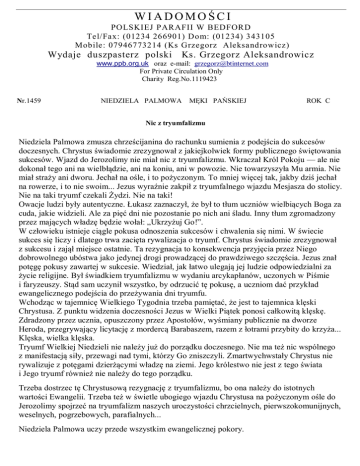 WIADOMOŚCI POLSKIEJ PARAFII W BEDFORD Tel/Fax: (01234 266901) Dom: (01234) 343105 Mobile: 07946773214 (Ks Grzegorz Aleksandrowicz) Wydaje duszpasterz polski Ks. Grzegorz Aleksandrowicz www.ppb.org.uk oraz e-mail: [email protected] For Private Circulation Only Charity Reg.No.1119423 Nr.1459 NIEDZIELA PALMOWA MĘKI PAŃSKIEJ ROK C Nic z tryumfalizmu Niedziela Palmowa zmusza chrześcijanina do rachunku sumienia z podejścia do sukcesów doczesnych. Chrystus świadomie zrezygnował z jakiejkolwiek formy publicznego świętowania sukcesów. Wjazd do Jerozolimy nie miał nic z tryumfalizmu. Wkraczał Król Pokoju — ale nie dokonał tego ani na wielbłądzie, ani na koniu, ani w powozie. Nie towarzyszyła Mu armia. Nie miał straży ani dworu. Jechał na ośle, i to pożyczonym. To mniej więcej tak, jakby dziś jechał na rowerze, i to nie swoim... Jezus wyraźnie zakpił z tryumfalnego wjazdu Mesjasza do stolicy. Nie na taki tryumf czekali Żydzi. Nie na taki! Owacje ludzi były autentyczne. Łukasz zaznaczył, że był to tłum uczniów wielbiących Boga za cuda, jakie widzieli. Ale za pięć dni nie pozostanie po nich ani śladu. Inny tłum zgromadzony przez mających władzę będzie wołał: „Ukrzyżuj Go!”. W człowieku istnieje ciągle pokusa odnoszenia sukcesów i chwalenia się nimi. W świecie sukces się liczy i dlatego trwa zacięta rywalizacja o tryumf. Chrystus świadomie zrezygnował z sukcesu i zajął miejsce ostatnie. Ta rezygnacja to konsekwencja przyjęcia przez Niego dobrowolnego ubóstwa jako jedynej drogi prowadzącej do prawdziwego szczęścia. Jezus znał potęgę pokusy zawartej w sukcesie. Wiedział, jak łatwo ulegają jej ludzie odpowiedzialni za życie religijne. Był świadkiem tryumfalizmu w wydaniu arcykapłanów, uczonych w Piśmie i faryzeuszy. Stąd sam uczynił wszystko, by odrzucić tę pokusę, a uczniom dać przykład ewangelicznego podejścia do przeżywania dni tryumfu. Wchodząc w tajemnicę Wielkiego Tygodnia trzeba pamiętać, że jest to tajemnica klęski Chrystusa. Z punktu widzenia doczesności Jezus w Wielki Piątek ponosi całkowitą klęskę. Zdradzony przez ucznia, opuszczony przez Apostołów, wyśmiany publicznie na dworze Heroda, przegrywający licytację z mordercą Barabaszem, razem z łotrami przybity do krzyża... Klęska, wielka klęska. Tryumf Wielkiej Niedzieli nie należy już do porządku doczesnego. Nie ma też nic wspólnego z manifestacją siły, przewagi nad tymi, którzy Go zniszczyli. Zmartwychwstały Chrystus nie rywalizuje z potęgami dzierżącymi władzę na ziemi. Jego królestwo nie jest z tego świata i Jego tryumf również nie należy do tego porządku. Trzeba dostrzec tę Chrystusową rezygnację z tryumfalizmu, bo ona należy do istotnych wartości Ewangelii. Trzeba też w świetle ubogiego wjazdu Chrystusa na pożyczonym ośle do Jerozolimy spojrzeć na tryumfalizm naszych uroczystości chrzcielnych, pierwszokomunijnych, weselnych, pogrzebowych, parafialnych... Niedziela Palmowa uczy przede wszystkim ewangelicznej pokory. NIEDZIELA MĘKI PAŃSKIEJ - NIEDZIELA PALMOWA Rok C Niedziela,20.3.2016 r Godz. 9.15 - GORZKIE ŻALE. POŚWIĘCENIE PALM. Godz. 9.30 - za dusze ś.p. Józefy, Antoniego i Anny Popek - int. córki Joanny. Godz.11.00 - za dusze ś.p. rodziców Józefy i Jana Stankiewiczów - int. córki. Godz.19.00 W int.Romualda z ok.urodzin z prośbą o błog.Boże i opiekę M.Bożej – int.rodziny. Poniedziałek,21.3.2016 Godz. 9.30 - Intencja wolna. Wtorek, 22.03.2016 Godz. 9.30 - Intencja wolna. Środa, 23.03.2016 Godz. 9.30 - Intencja wolna. Godz.19.00 - za dusze ś.p. Elżbiety Okomskiej w rocznice śmierci - int. dzieci z rodzinami. Czwartek,24.03.2016 WIELKI CZWARTEK Godz.19.00 MSZA ŚWIĘTA WIECZERZY PAŃSKIEJ. Piątek, 25.03. 2016 WIELKI PIĄTEK Godz.15.00 DROGA KRZYŻOWA i KORONKA DO MIŁOSIERDZIA BOŻEGO. Godz.19.00 LITURGIA MĘKI PAŃSKIEJ. Godz.20.00 ADORACJA GROBU PAŃSKIEGO. Sobota, 26.03. 2016 WIELKA SOBOTA Godz. 19.30.00 LITURGIA WIELKIEJ SOBOTY i REZUREKCJA. Niedziela, 27.3.2016 NIEDZIELA ZMARTWYCHWSTANIA PAŃSKIEGO - WIELKANOC Godz. 9.30 - W INTENCJI PARAFIAN. Godz.11.00 - W INTENCJI PARAFIAN. Godz.19.00 - W INTENCJI PARAFIAN. CHRZEST ŚW.:Sakrament Chrztu św otrzymał: MAXIMILIAN ŁUKSZ LISOWSKI – 19 marca 2016 r. Nowo ochrzczonemu dziecku i jego rodzicom życzymy błogosławieństwa Bożego i opieki Bożej. OGŁOSZENIA PARAFIALNE: 1. W tym tygodniu rozpoczynamy WIELKI TYDZIEŃ rozważając tajemnice naszego zbawienia. WIELKI CZWARTEK - Msza święta Wieczerzy Pańskiej o godz.19.00 WIELKI PIĄTEK - Droga Krzyżowa o godz. 15.00 i Liturgia Męki Pańskiej o godz.19.00 WIELKA SOBOTA - Wigilia Paschalna zakończona Rezurekcją o godz.19.30 2. W WIELKI PIĄTEK obowiązuje nas post ścisły. 3. W WIELKĄ SOBOTĘ odbędzie się w naszym kościele w Bedford tradycyjne ŚWIĘCENIE POKARMÓW od godz. 12.00 do godz.15.00 (co pół godziny: godz.12.00, 12.30, 13.00, 13.30, 14.00, 14.30 i 15.00). 4. W okresie Wielkiego Postu jest wystawiona puszka na cele charytatywne z okazji JAŁMUŻNY POSTNEJ. 5. Zbierane są również ofiary imienne na Listę na kwiaty do Grobu Pańskiego. 6. W tym tygodniu w środę o godz.10.00 proszę o pomoc w sprzątaniu kościoła w przygotowaniu na święta. 7. Jak zwykle są do zakupienia tygodniki katolickie Gość Niedzielny i Mały Gość Niedzielny w cenie Ł1.50 8. KURS PRZEDMAŁŻEŃSKI odbędzie się tydzień po Wielkanocy w dniach 3, 10 i 17 kwietnia (godz.19.00) 9.KOLĘDA PARAFIALNA(wizyty duszpasterskie) zakończą się w tym tygodniu w Bedford(Ampthill Rd): Wtorek,22 marca: Stypuła P.A, Formella M, Szczęsny M.A, Sowa M, Michalski M.J, Chmielewski Z.J, Matlak P.M, Polak U, Liskowiak T.J, Sobczak M, Juszczyk R.A, Faliński K, Kozioł A, Biej P, Wielgus K, Cygan T, Kłoda K.M, Kozicka W, Kiełbowicz A.M, Mączyński L.D, Treder J.M, Podwojski K.K, Jankowski R.O, Wiśniewski M, Sarnowski M.K, Mleczko K, Kraus Ł, Strojek M.K, Grądzki R.A, Jurkowski M.L, 