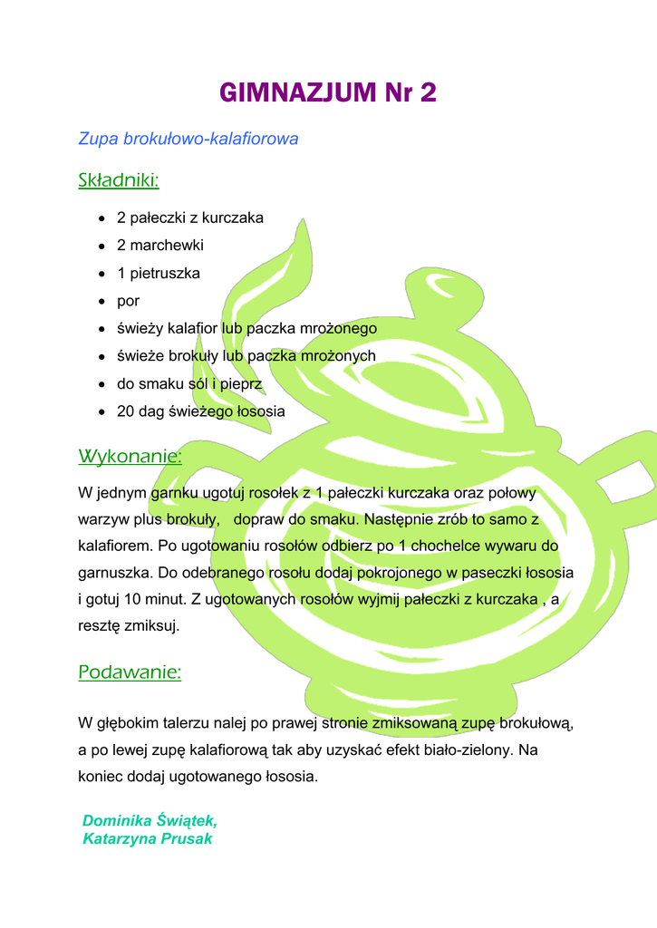 GIMNAZJUM Nr 2 Zupa brokułowo-kalafiorowa Składniki: 2 pałeczki z kurczaka 2 marchewki 1 pietruszka por świeży kalafior lub paczka mrożonego świeże brokuły lub paczka mrożonych do smaku sól i pieprz 20 dag świeżego łososia Wykonanie: W jednym garnku ugotuj rosołek z 1 pałeczki kurczaka oraz połowy warzyw plus brokuły, dopraw do smaku. Następnie zrób to samo z kalafiorem. Po ugotowaniu rosołów odbierz po 1 chochelce wywaru do garnuszka. Do odebranego rosołu dodaj pokrojonego w paseczki łososia i gotuj 10 minut. Z ugotowanych rosołów wyjmij pałeczki z kurczaka , a resztę zmiksuj. Podawanie: W głębokim talerzu nalej po prawej stronie zmiksowaną zupę brokułową, a po lewej zupę kalafiorową tak aby uzyskać efekt biało-zielony. Na koniec dodaj ugotowanego łososia. Dominika Świątek, Katarzyna Prusak