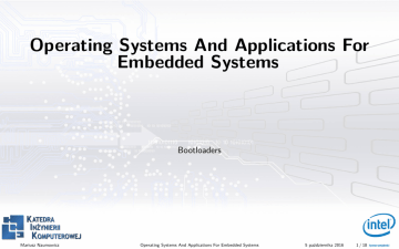 Operating Systems And Applications For Embedded Systems Bootloaders Mariusz Naumowicz Operating Systems And Applications For Embedded Systems 5 października 2016 1 / 18 Plan The boot sequence Phase 1: ROM code Phase 2: SPL Phase 3: TPL UEFI firmware Choosing a bootloader Wyniki U-Boot Building U-Boot Installing U-Boot Using U-Boot Boot image format Loading images Booting Linux Mariusz Naumowicz Operating Systems And Applications For Embedded Systems 5 października 2016 2 / 18 Phase 1: ROM code Mariusz Naumowicz Operating Systems And Applications For Embedded Systems 5 października 2016 3 / 18 Phase 2: SPL Mariusz Naumowicz Operating Systems And Applications For Embedded Systems 5 października 2016 4 / 18 Phase 3: TPL Mariusz Naumowicz Operating Systems And Applications For Embedded Systems 5 października 2016 5 / 18 UEFI firmware Most embedded PC designs and some ARM designs have firmware based on the Universal Extensible Firmware Interface (UEFI) standard, see the offcial website at http://www.uefi.org for more information. The boot sequence is fundamentally the same as described in the preceding section: I Phase 1: The processor loads the UEFI boot manager firmware from flash memory. In some designs, it is loaded directly from NOR flash memory, in others there is ROM code on-chip which loads the boot manager from SPI flash memory I Phase 2: The boot manager loads the boot firmware from the EFI System Partition (ESP) or a hard disk or SSD, or from a network server via PXE boot. I Phase 3: The TPL in this case has to be a bootloader that is capable of loading a Linux kernel and an optional RAM disk into memory. Common choices are: I I Mariusz Naumowicz GRUB 2: This is the GNU Grand Unified Bootloader, version 2, and it is the most commonly used Linux loader on PC platforms. However, there is one controversy in that it is licensed under GPL v3, which may make it incompatible with secure booting since the license requires the boot keys to to be supplied with the code. The website is https://www.gnu.org/ software/grub/. gummiboot: This is a simple UEFI-compatible bootloader which has since been integrated into systemd, and is licensed under LGPL v2.1 The website is https://wiki.archlinux.org/index.php/Systemd-boot. Operating Systems And Applications For Embedded Systems 5 października 2016 6 / 18 Choosing a bootloader Name Das U-Boot Barebox GRUB 2 RedBoot CFE YAMON Mariusz Naumowicz Architectures ARM, Blackfin, MIPS, PowerPC, SH ARM, Blackfin, MIPS, PowerPC X86, X86_64 ARM, MIPS, PowerPC, SH Broadcom MIPS MIPS Operating Systems And Applications For Embedded Systems 5 października 2016 7 / 18 U-Boot U-Boot, or to give its full name, Das U-Boot, began life as an open source bootloader for embedded PowerPC boards. Then, it was ported to ARM-based boards and later to other architectures, including MIPS, SH, and x86. It is hosted and maintained by Denx Software Engineering. There is plenty of information available, and a good place to start is www.denx.de/wiki/U-Boot. There is also a mailing list at [email protected]. Mariusz Naumowicz Operating Systems And Applications For Embedded Systems 5 października 2016 8 / 18 Building U-Boot git clone git://git.denx.de/u-boot.git cd u-boot make CROSS_COMPILE=arm-cortex_a8-linux-gnueabihf- am335x_boneblack_defconfig make CROSS_COMPILE=arm-cortex_a8-linux-gnueabihfThe results of the compilation are: I u-boot: This is U-Boot in ELF object format, suitable for use with a debugger I u-boot.map: This is the symbol table I u-boot.bin: This is U-Boot in raw binary format, suitable for running on your device I u-boot.img: This is u-boot.bin with a U-Boot header added, suitable for uploading to a running copy of U-Boot I u-boot.srec: This is U-Boot in Motorola srec format, suitable for transferring over a serial connection Mariusz Naumowicz Operating Systems And Applications For Embedded Systems 5 października 2016 9 / 18 Installing U-Boot sudo sfdisk -D -H 255 -S 63 /dev/mmcblk0 « EOF ,9,0x0C,* „,EOF sudo mkfs.vfat -F 16 -n boot /dev/mmcblk0p1 cp MLO u-boot.img /media/chris/boot gtkterm -p /dev/ttyUSB0 -s 115200 U-Boot# Mariusz Naumowicz Operating Systems And Applications For Embedded Systems 5 października 2016 10 / 18 Using U-Boot Usually, U-Boot offers a command-line interface over a serial port. It gives a command prompt which is customized for each board. In the examples, I will use U-Boot#. Typing help prints out all the commands confgured in this version of U-Boot; typing help <command> prints out more information about a particular command. Mariusz Naumowicz Operating Systems And Applications For Embedded Systems 5 października 2016 11 / 18 Boot image format mkimage Usage: mkimage -l image -l ==> list image header information mkimage [-x] -A arch -O os -T type -C comp -a addr -e ep -n name -d data_file[:data_file...] image -A ==> set architecture to ’arch’ -O ==> set operating system to ’os’ -T ==> set image type to ’type’ -C ==> set compression type ’comp’ -a ==> set load address to ’addr’ (hex) -e ==> set entry point to ’ep’ (hex) -n ==> set image name to ’name’ -d ==> use image data from ’datafile’ -x ==> set XIP (execute in place) mkimage [-D dtc_options] -f fit-image.its fit-image mkimage -V ==> print version information and exit For example, to prepare a kernel image for an ARM processor, the command is: mkimage -A arm -O linux -T kernel -C gzip -a 0x80008000 -e 0x80008000 -n ’Linux’ -d zImage uImage Mariusz Naumowicz Operating Systems And Applications For Embedded Systems 5 października 2016 12 / 18 Loading images I U-Boot# mmc rescan U-Boot# fatload mmc 0:1 82000000 uimage reading uimage 4605000 bytes read in 254 ms (17.3 MiB/s) U-Boot# iminfo 82000000 ## Checking Image at 82000000 ... Legacy image found Image Name: Linux-3.18.0 Created: 2014-12-23 21:08:07 UTC Image Type: ARM Linux Kernel Image (uncompressed) Data Size: 4604936 Bytes = 4.4 MiB Load Address: 80008000 Entry Point: 80008000 Verifyi