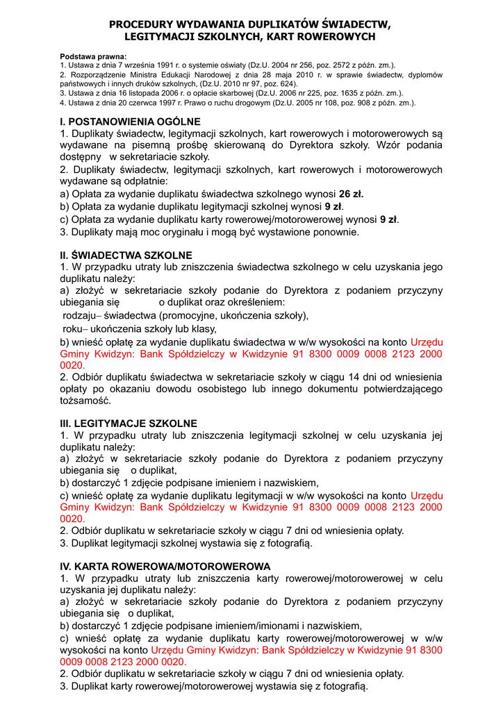 PROCEDURY WYDAWANIA DUPLIKATÓW ŚWIADECTW, LEGITYMACJI SZKOLNYCH, KART ROWEROWYCH Podstawa prawna: 1. Ustawa z dnia 7 września 1991 r. o systemie oświaty (Dz.U. 2004 nr 256, poz. 2572 z późn. zm.). 2. Rozporządzenie Ministra Edukacji Narodowej z dnia 28 maja 2010 r. w sprawie świadectw, dyplomów państwowych i innych druków szkolnych, (Dz.U. 2010 nr 97, poz. 624). 3. Ustawa z dnia 16 listopada 2006 r. o opłacie skarbowej (Dz.U. 2006 nr 225, poz. 1635 z późn. zm.). 4. Ustawa z dnia 20 czerwca 1997 r. Prawo o ruchu drogowym (Dz.U. 2005 nr 108, poz. 908 z późn. zm.). I. POSTANOWIENIA OGÓLNE 1. Duplikaty świadectw, legitymacji szkolnych, kart rowerowych i motorowerowych są wydawane na pisemną prośbę skierowaną do Dyrektora szkoły. Wzór podania dostępny w sekretariacie szkoły. 2. Duplikaty świadectw, legitymacji szkolnych, kart rowerowych i motorowerowych wydawane są odpłatnie: a) Opłata za wydanie duplikatu świadectwa szkolnego wynosi 26 zł. b) Opłata za wydanie duplikatu legitymacji szkolnej wynosi 9 zł. c) Opłata za wydanie duplikatu karty rowerowej/motorowerowej wynosi 9 zł. 3. Duplikaty mają moc oryginału i mogą być wystawione ponownie. II. ŚWIADECTWA SZKOLNE 1. W przypadku utraty lub zniszczenia świadectwa szkolnego w celu uzyskania jego duplikatu należy: a) złożyć w sekretariacie szkoły podanie do Dyrektora z podaniem przyczyny ubiegania się o duplikat oraz określeniem: rodzaju świadectwa (promocyjne, ukończenia szkoły), roku ukończenia szkoły lub klasy, b) wnieść opłatę za wydanie duplikatu świadectwa w w/w wysokości na konto Urzędu Gminy Kwidzyn: Bank Spółdzielczy w Kwidzynie 91 8300 0009 0008 2123 2000 0020. 2. Odbiór duplikatu świadectwa w sekretariacie szkoły w ciągu 14 dni od wniesienia opłaty po okazaniu dowodu osobistego lub innego dokumentu potwierdzającego tożsamość. III. LEGITYMACJE SZKOLNE 1. W przypadku utraty lub zniszczenia legitymacji szkolnej w celu uzyskania jej duplikatu należy: a) złożyć w sekretariacie szkoły podanie do Dyrektora z podaniem przyczyny ubiegania się o duplikat, b) dostarczyć 1 zdjęcie podpisane imieniem i nazwiskiem, c) wnieść opłatę za wydanie duplikatu legitymacji w w/w wysokości na konto Urzędu Gminy Kwidzyn: Bank Spółdzielczy w Kwidzynie 91 8300 0009 0008 2123 2000 0020. 2. Odbiór duplikatu w sekretariacie szkoły w ciągu 7 dni od wniesienia opłaty. 3. Duplikat legitymacji szkolnej wystawia się z fotografią. IV. KARTA ROWEROWA/MOTOROWEROWA 1. W przypadku utraty lub zniszczenia karty rowerowej/motorowerowej w celu uzyskania jej duplikatu należy: a) złożyć w sekretariacie szkoły podanie do Dyrektora z podaniem przyczyny ubiegania się o duplikat, b) dostarczyć 1 zdjęcie podpisane imieniem/imionami i nazwiskiem, c) wnieść opłatę za wydanie duplikatu karty rowerowej/motorowerowej w w/w wysokości na konto Urzędu Gminy Kwidzyn: Bank Spółdzielczy w Kwidzynie 91 8300 0009 0008 2123 2000 0020. 2. Odbiór duplikatu w sekretariacie szkoły w ciągu 7 dni od wniesienia opłaty. 3. Duplikat karty rowerowej/motorowerowej wystawia się z fotografią.