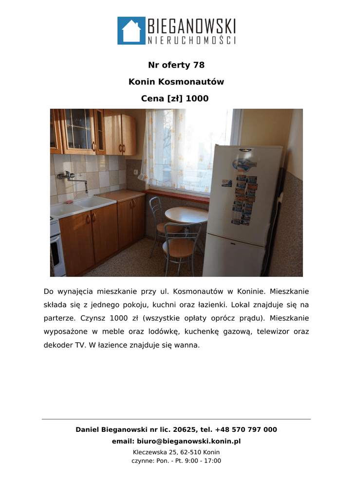 Nr oferty 78 Konin Kosmonautów Cena [zł] 1000 Kawalerka w pełni