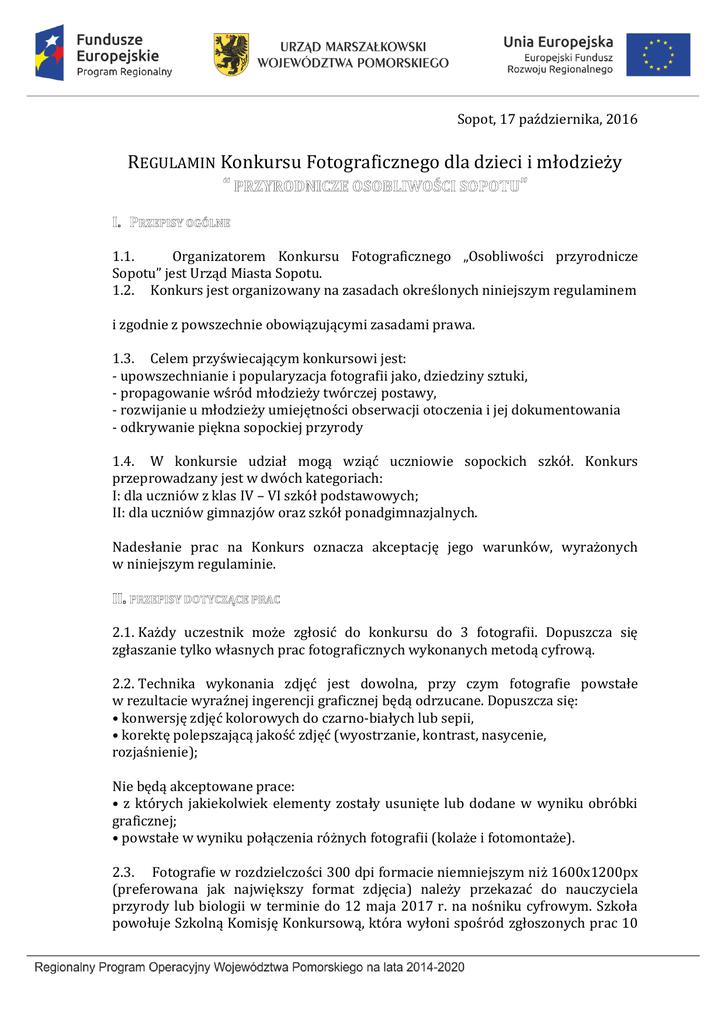 Sopot, 17 października, 2016 REGULAMIN Konkursu Fotograficznego dla dzieci i młodzieży 1.1. Organizatorem Konkursu Fotograficznego „Osobliwości przyrodnicze Sopotu” jest Urząd Miasta Sopotu. 1.2. Konkurs jest organizowany na zasadach określonych niniejszym regulaminem i zgodnie z powszechnie obowiązującymi zasadami prawa. 1.3. Celem przyświecającym konkursowi jest: - upowszechnianie i popularyzacja fotografii jako, dziedziny sztuki, - propagowanie wśród młodzieży twórczej postawy, - rozwijanie u młodzieży umiejętności obserwacji otoczenia i jej dokumentowania - odkrywanie piękna sopockiej przyrody 1.4. W konkursie udział mogą wziąć uczniowie sopockich szkół. Konkurs przeprowadzany jest w dwóch kategoriach: I: dla uczniów z klas IV – VI szkół podstawowych; II: dla uczniów gimnazjów oraz szkół ponadgimnazjalnych. Nadesłanie prac na Konkurs oznacza akceptację jego warunków, wyrażonych w niniejszym regulaminie. 2.1. Każdy uczestnik może zgłosić do konkursu do 3 fotografii. Dopuszcza się zgłaszanie tylko własnych prac fotograficznych wykonanych metodą cyfrową. 2.2. Technika wykonania zdjęć jest dowolna, przy czym fotografie powstałe w rezultacie wyraźnej ingerencji graficznej będą odrzucane. Dopuszcza się: • konwersję zdjęć kolorowych do czarno-białych lub sepii, • korektę polepszającą jakość zdjęć (wyostrzanie, kontrast, nasycenie, rozjaśnienie); Nie będą akceptowane prace: • z których jakiekolwiek elementy zostały usunięte lub dodane w wyniku obróbki graficznej; • powstałe w wyniku połączenia różnych fotografii (kolaże i fotomontaże). 2.3. Fotografie w rozdzielczości 300 dpi formacie niemniejszym niż 1600x1200px (preferowana jak największy format zdjęcia) należy przekazać do nauczyciela przyrody lub biologii w terminie do 12 maja 2017 r. na nośniku cyfrowym. Szkoła powołuje Szkolną Komisję Konkursową, która wyłoni spośród zgłoszonych prac 10 najlepszych i do 18 maja przekaże je na nośniku cyfrowym do Kancelarii Urzędu Miasta w Sopocie. 2.4. Organizator zastrzega sobie prawo do wyłączenia z udziału w Konkursie prac o niskiej jakości technicznej. 2.5. Wraz ze zdjęciami należy przekazać do nauczyciela podpisaną przez rodziców ucznia klauzulę (w załączniku): "Wyrażam zgodę na przetwarzanie danych osobowych mojego dziecka przez Organizatora Konkursu Fotograficznego dla Dzieci i Młodzieży w celach wynikających z regulaminu tego Konkursu, zgodnie z ustawą z dnia 29 sierpnia 1997 roku o ochronie danych osobowych (Dz. U. z 1997 r., nr 133, poz. 883 z późniejszymi zmianami). Poprzez wysłanie zdjęć na Konkurs nieodpłatnie przenoszę na Organizatora wszelkie autorskie prawa majątkowe do nich, na wszystkich polach eksploatacji, o których mowa w art. 50 Ustawy z dnia 4 lutego 1994 roku o prawie autorskim i prawach pokrewnych (Dz. U. Z 2000 r., Nr 80, poz. 904 z późn. zmianami). W Konkursie mogą brać udział jedynie te prace, które nie zostały nigdzie opublikowane, ani nie brały udziału w żadnym konkursie. 2.6. Fotografie nie mogą naruszać jakichkolwiek praw osób trzecich, w szczególności praw autorskich ani dóbr osobistych. Rodzic uczestnika jest zobowiązany do uzyskania od osób, którym przysługują przedmiotowe prawa, wszelkich niezbędnych praw, licencji, zgód i upoważnień w zakresie niezbędnym do uczestniczenia w Konkursie. Naruszenie powyższych postanowień będzie traktowane jako istotne naruszenie Regulaminu, skutkujące natychmiastowym wykluczeniem z udziału w Konkursie. Rodzic uczestnika będzie wyłącznie odpowiedzialny za zgodność z prawem nadesłanej Fotografii i poniesie wszelkie konsekwencje jej wykorzystania przez Organizatora w ramach Konkursu. 2.7. Organizator zastrzega sobie prawo do niespełniających wymienionych wyżej wymogów. dyskwalifikowania prac 2.8. Organizator nie zwraca prac biorących udział w Konkursie, prac zdyskwalifikowanych jak również z niego wyłączonych. 3.1. Konkurs rozpoczyna się w dniu ogłoszenia. 3.2. Termin przekazania prac do nauczyciela mija 12 maja 2017 roku. Do dnia 12 maja 2017 roku uczniowie przekazują prace nauczycielom. 3.3. Do 19 maja szkoły przekazują do kancelarii Urzędu Miasta 10 wybranych komisyjnie fotografii na podpisanym nośniku cyfrowym, prace powinny zostać zaadresowane na Wydział Kultury i Sportu Urzędu Miasta Sopotu. 3.4. Fotografie przekazane po terminie nie będą brane pod uwagę w Konkursie. 3.5. Organizator powołuje Jury Konkursu (Jury). 3.6. Ocena prac przez Jury nastąpi do dnia 2 czerwca 2017 roku. Decyzja Jury jest ostateczna i nie podlega weryfikacji. Jury wyłania zwycięzców oraz zastrzega sobie prawo nie wyłaniania zwycięzców, jak i przyznawania miejsc ex aequo. 3.7. Szkoły uczestniczące w Konkursie zostaną powiadomione o wynikach do 2 czerwca 2017 roku. 3.8. Uroczyste wręczenie nagród nastąpi w Urzędzie Miasta, w terminie podanym przez Organizatora. 4.1. Zwycięzcy otrzymają nagrody rzeczowe. 5.1. Złożenie pracy w konkursie jest równoznaczne z przekazaniem praw autorskich do zdjęcia na organizatora. Organizator w związku z powyższym ma prawo do umieszczania nadesłanych na Konkurs prac (oznaczonych imieniem i nazwiskiem autora) na stronie miejskiego portalu internetowego, do wielokrotnej ich ekspozycji oraz do wykorzystania we wszelkich drukach i publikacjach 5.2. Uprawnienia, o których mowa powyżej w pkt. 5.1., przysługują Organizatorowi nieodpłatnie, na podstawie oświadczeń złożonych przez autorów zdjęć, a wymaganych w pkt. 2.8. niniejszego regulaminu. KARTA ZGŁOSZENIA I Konkurs Fotografii Dla Dzieci i Młodzieży Imię i nazwisko ...................................................................................................................... (wypełnić obowiązkowo) Nazwa i adres szkoły ............................................................................................................. (wypełnić obo