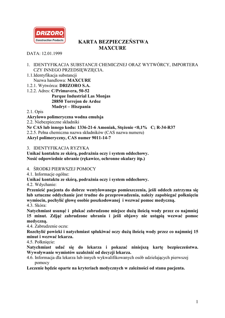KARTA BEZPIECZEŃSTWA MAXCURE DATA: 12.01.1999 1. IDENTYFIKACJA SUBSTANCJI CHEMICZNEJ ORAZ WYTWÓRCY, IMPORTERA CZY INNEGO PRZEDSIĘWZIĘCIA. 1.1.Identyfikacja substancji Nazwa handlowa: MAXCURE 1.2.1. Wytwórca: DRIZORO S.A. 1.2.2. Adres: C/Primavera, 50-52 Parque Industrial Las Monjas 28850 Torrejon de Ardoz Madryt – Hiszpania 2.1. Opis Akrylowo polimeryczna wodna emulsja 2.2. Niebezpieczne składniki Nr CAS lub innego kodu: 1336-21-6 Amoniak, StęŜenie <0,1% C; R-34-R37 2.2.5. Pełna chemiczna nazwa składników (CAS nazwa numeru) Akryl polimeryczny, CAS numer 9011-14-7 3. IDENTYFIKACJA RYZYKA Unikać kontaktu ze skórą, podraŜnia oczy i system oddechowy. Nosić odpowiednie ubranie (rękawice, ochronne okulary itp.) 4. ŚRODKI PIERWSZEJ POMOCY 4.1. Informacje ogólne: Unikać kontaktu ze skórą, podraŜnia oczy i system oddechowy. 4.2. Wdychanie: Przenieść pacjenta do dobrze wentylowanego pomieszczenia, jeśli oddech zatrzyma się lub sztuczne oddychanie jest trudne do przeprowadzenia, naleŜy zapobiegać połknięciu wymiocin, pochylić głowę osobie poszkodowanej i wezwać pomoc medyczną. 4.3. Skóra: Natychmiast usunąć i płukać zabrudzone miejsce duŜą ilością wody przez co najmniej 15 minut. Zdjąć zabrudzone ubrania i jeśli objawy nie ustąpią wezwać pomoc medyczną. 4.4. Zabrudzenie oczu: Rozchylić powieki i natychmiast spłukiwać oczy duŜą ilością wody przez co najmniej 15 minut i wezwać lekarza. 4.5. Połknięcie: Natychmiast udać się do lekarza i pokazać niniejszą kartę bezpieczeństwa. Wywoływanie wymiotów uzaleŜnić od decyzji lekarza. 4.6. Informacja dla lekarza lub innych wykwalifikowanych osób udzielających pierwszej pomocy Leczenie będzie oparte na kryteriach medycznych w zaleŜności od stanu pacjenta. 1 KARTA BEZPIECZEŃSTWA MAXCURE 5. ŚRODKI GASZENIA OGNIA 5.1. Odpowiednie środki gaśnicze Mgła wodna, CO2, proszek chemiczny, piana. 5.2. Środki gaśnicze, które nie mogą być uŜyte z powodów bezpieczeństwa. Obfity podmuch wody 5.3. Szczególne niebezpieczeństwo w przypadku poŜaru Produkt niepalny. Ze spalania mogą wydzielać się małe ilości tlenku węgla, azotu oraz cyjanku. Z miejsca wypadku naleŜy ewakuować wszystkich, którzy znajdują się na linii wiatru. 5.4. Specjalny przeciwpoŜarowy sprzęt ochronny StraŜacy muszą nosić buty, rękawice i kombinezon ognioodporny oraz niezaleŜny sprzęt do oddychania 5.5. Inne instrukcje Ciecze stosowane do gaszenia ognia naleŜy trzymać w celu późniejszego usunięcia. 6. ŚRODKI OSTROśNOŚCI 6.1. Indywidualne środki ostroŜności Nie wdychać uwalniających się oparów i unikać kontaktu z oczami i ze skórą. Nosić ubranie ochronne, rękawice, buty oraz ochronę na oczy (okulary z bocznymi wkładkami). 6.2. Środki ostroŜności względem środowiska Zapobiegać przedostaniu się produktu do ziemi, kanalizacji, czy do jakichkolwiek wód. 6.3. Metody czyszczenia Jeśli oczyszczenie jest nie moŜliwe, wyciek musi być wchłonięty za pomocą odpowiednich środków (piaskiem). Pozostałości muszą być zebrane, oznakowane i usunięte zgodnie z obowiązującym prawem. 7. PRZENOSZENIE I PRZECHOWYWANIE 7.1. Przenoszenie Nie wdychać oparów. Unikać jakiegokolwiek kontaktu ze skórą i oczami. Nosić odpowiednie ubranie. Zawsze naleŜy pamiętać o obowiązujących przepisach. 7.2. Przechowywanie Opakowania przechowywać szczelnie zamknięte w suchym, chłodnym i dobrze wentylowanym pomieszczeniu. Przechowywać w temperaturze między 100-350C. Chronić przed wilgocią. 8. KONTROLA PRACY/OCHRONA OSOBISTA 8.3.1. Specjalne instrukcje dotyczące ochrony i higieny Zapewnić dobrą wentylację w miejscu przechowywania, przenoszenia i stosowania. 8.3.2. Ochrona układu oddechowego W normalnych warunkach pracy ochrona nie jest konieczna. 8.3.3. Ochrona rąk UŜywać wodoodpornych rękawic. 8.3.4. Ochrona oczu Nosić ochronne okulary z bocznymi osłonami. 2 KARTA BEZPIECZEŃSTWA MAXCURE 8.3.5. Ochrona skóry Nosić wodoodporne ochronne ubranie i wysokie buty. 9. WŁŚCIWOŚCI FIZYCZNE I CHEMICZNE 9.1. Stan fizyczny, kolor i zapach śółty mleczny płyn o charakterystycznym zapachu 9.2. pH: 7-9 9.3.1. Temperatura wrzenia: powyŜej 1000C 9.3.3. Temperatura rozkładu: 170°C 9.4. Temperatura zapłonu: N.A. 9.10. Ciśnienie pary: powyŜej 1 9.11. Gęstość względna: 1,0-1,2g/cm3 9.12. Rozpuszczalność: a) rozpuszczalność w wodzie: Rozpuszczalny 10. STABILNOŚĆ I ODDZAIŁYWANIE 10.1. Warunki, których naleŜy unikać Niebezpieczne reakcje podczas składowania i przenoszenia zgodnie z powszechnymi praktykami stosowanymi w przemyśle. Polimer moŜe się rozkładać przy temperaturze około 170°C. Chronić przed wilgocią. 10.2. Materiały, których naleŜy unikać N.A. 10.3. Niebezpieczne produkty rozkładu Termiczny rozkład moŜe nastąpić za pomocą monomeru akrylowego. 11. INFORMACJA TOKSYKOLOGICZNA 11.1. Ostra toksyczność Przyjmowanie pokarmu DL 50 – szczur > 5000 mg/kg Skóra DL 50 – królik > 5000 mg/kg 11.2. PodraŜnienia W kontakcie ze skórą i oczami królika powoduje podraŜnienia bez Ŝadnych skutków. 11.3. Uczulenia MoŜe mieć miejsce. 11.4. Długotrwała toksyczność N.A. 12. INFORMACJA EKOLOGICZNA 12.1.1. Biodegradacja Produkt nie ulega biodegradacji chociaŜ łatwo ulega bioeliminacji. 12.1.2 Chemiczna degradacja Produkt jest trwały 12.2. Bioakumulacja Produkt nie ulega bioakumulacji 12.3. Ruchliwość Produkt jest stabilny 3 KARTA BEZPIECZEŃSTWA MAXCURE 13. USUWANIE PRODUKTU Pozostałości muszą być usunięte zgodnie z obowiązującym prawem. Doradza się usuwanie pozostałości mechaniczne lub za pomocą odpowiednich środków np. piaskiem. Rozwiązaniem teŜ moŜe być koagulacja ze stopniowym dodawaniem chlorku Ŝelazowego, a następnie usuniecie zgodnie z przepisami prawa. 14. INFORMACJE DOTYCZĄCE TRANSPORTU 14.1. Numer UN: nie jest sklasyfikowany jako niebezpieczny 15. INFORMACJE O PRZEPISACH 15.1.1. Kod literowy symbolu ostrzegawczego 