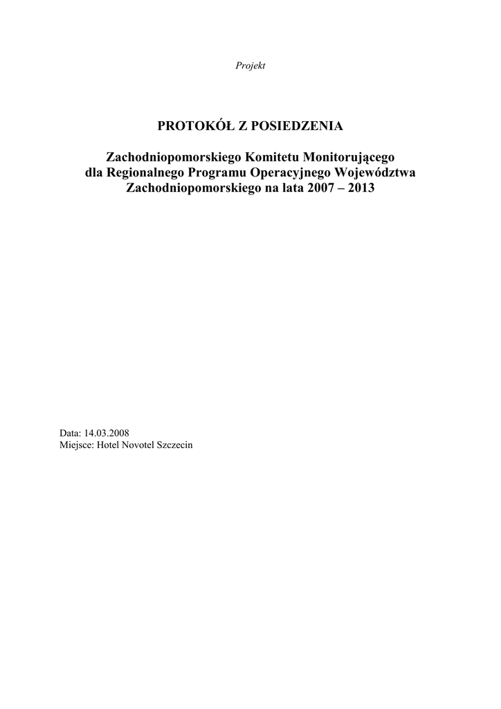 Projekt PROTOKÓŁ Z POSIEDZENIA Zachodniopomorskiego Komitetu Monitorującego dla Regionalnego Programu Operacyjnego Województwa Zachodniopomorskiego na lata 2007 – 2013 Data: 14.03.2008 Miejsce: Hotel Novotel Szczecin Punkt 1 Otwarcie obrad Obradom Zachodniopomorskiego Komitetu Monitorującego w dniu 14.03.2008 przewodniczył p. Władysław Husejko, Wicemarszałek Województwa Zachodniopomorskiego. Przewodniczący powitał przybyłych członków Komitetu i obserwatorów, w tym w sposób szczególny przedstawiciela Komisji Europejskiej oraz przedstawicieli Ministra Rozwoju Regionalnego, Ministra Gospodarki oraz Wojewody Zachodniopomorskiego. Punkt 2 Przyjęcie porządku obrad Członkowie ZKM jednogłośnie przyjęli porządek obrad. Punkt 3 Przyjęcie protokołu Na wniosek Przewodniczącego przy czterech głosach wstrzymujących ZKM przyjął protokół z inauguracyjnego posiedzenia ZKM w dniu 14.12.2007. Punkt 3 Wręczenie nominacji W związku z poszerzeniem składu ZKM o reprezentantów organizacji pozarządowych oraz izb przemysłowo-handlowych, Przewodniczący wręczył reprezentantom tych instytucji nominacje na członków Komitetu. Punkt 4 Prezentacja prac nad Regionalnym Programem Operacyjnym P. Angelika Rabizo, Dyrektor Wydziału WdraŜania RPO przedstawiła harmonogram prac nad Regionalnym Programem Operacyjnym Województwa Zachodniopomorskiego oraz nad dokumentami niezbędnymi do jego realizacji, w tym: Uszczegółowieniem RPO, Instrukcją Wykonawczą Instytucji Zarządzającej RPO WZ, Planem Kontroli, Planem Ewaluacji. Następnie przedstawione zostały prace nad Planem Komunikacji oraz działania związane z promowaniem Programu. Kolejno przedstawione zostały prace związane z przygotowaniem kryteriów wyboru projektów w ramach RPO oraz z wdroŜeniem Lokalnego Systemu Informatycznego. Zaprezentowany został harmonogram uruchamiania naborów projektów konkursowych w ramach poddziałań 1.1.1 i 1.1.2 oraz podpisywania pre-umów z Beneficjentami Indykatywnego Planu Inwestycyjnego. P. Marcin Szmyt, Dyrektor Wydziału Zarządzania RPO przedstawił zapisy Uszczegółowienia RPO w wersji 3.0 ze szczególnym naciskiem na działania, dla których ZKM będzie w pierwszej kolejności przyjmował kryteria wyboru projektów. Przedstawiony został takŜe wykaz projektów kluczowych po aktualizacji dokonanej przez Zarząd Województwa na przełomie lutego i marca 2008. W sesji pytań p. Artur Wezgraj, Kanclerz Politechniki Koszalińskiej zadał pytanie, czy projekty z IPI podlegają zapisom dotyczącym poszczególnych działań i poddziałań RPO WZ, w tym ocenie wg tych samych kryteriów, na co uzyskał odpowiedź twierdzącą. P. Andrzej Szczodry, Zastępca Prezydenta Miasta Świnoujście zadał pytanie o sposób konsultowania społecznego IPI. W odpowiedzi p. M. Szmyt poinformował, iŜ zgodnie z 2 wytycznymi konsultacje odbędą się przede wszystkim podczas Konferencji Współpracy, którą zaplanowano na 27 marca 2008r. oraz serii sektorowych konferencji uzgodnieniowych. P. Krzysztof Lis, Starosta Szczecinecki zadał pytanie czy przy tworzeniu załącznika nr 6 brano pod uwagę jedynie dane na poziomie gmin, czy równieŜ na poziomie powiatów. W odpowiedzi poinformowano, iŜ dane wykorzystywane przy tworzeniu Załącznika 6 do RPO nie są osiągalne na poziomie powiatów, a jedynie na poziomie gmin. P. Waldemar Misko, Burmistrz Miasta i Gminy Karlino zadał pytanie o zasadę przyznawania pomocy, w przypadku kiedy o dofinansowanie ubiegać się będą związki gmin, w skład których wchodzić będą zarówno gminy z załącznika nr 6 jak i inne gminy. W odpowiedzi stwierdzono, iŜ stosowany będzie podstawowy poziom dofinansowania zapisany w Uszczegółowieniu RPO WZ. P. Ryszard Górewicz, przedstawiciel Business Centre Club zadał pytanie dotyczące długiego czasu oceny projektu (300 dni), w odpowiedzi stwierdzono, iŜ jest to maksymalny termin i w miarę moŜliwości będzie skracany oraz, iŜ proces oceny jest procesem skomplikowanym angaŜującym oprócz urzędników takŜe ekspertów zewnętrznych. Ten okres zawiera takŜe czas dla Wnioskodawcy na wniesienie poprawek w przypadku stwierdzenia braków na etapie oceny formalnej. P. Krzysztof Lis, zadał pytanie o termin naboru projektów do poddziałań związanych z drogami lokalnymi. W odpowiedzi stwierdzono, iŜ termin naboru został zaplanowany na drugą połowę 2008 roku z uwagi na to, Ŝe WWRPO musi się przygotować do naborów. Jednocześnie proponowany termin naboru umoŜliwi samorządom zaplanowanie inwestycji w budŜetach oraz odpowiednie przygotowanie wymaganych dokumentów. Terminy naboru projektów dróg regionalnych podyktowane są zagwarantowaniem środków na ten cel w ramach Wieloletniego Planu Inwestycyjnego przyjętego 30 listopada 2007 przez Sejmik Województwa oraz systemową ścieŜką realizacji tych projektów. Punkt 5 Kryteria wyboru projektów Przewodniczący zaproponował zmianę polegającą na zatwierdzeniu przez ZKM jedynie kryteriów merytoryczno-finansowych dotyczących dwóch poddziałań, które mają zostać uruchomione w pierwszej kolejności, ale wraz z punktami przypisanymi tym kryteriom – zgodnie z sugestią Komisji Europejskiej. P. Władysław Lisewski, przedstawiciel NSZZ „Solidarność” Pomorza Zachodniego stwierdził, iŜ zgodnie z ustaleniami z poprzedniego posiedzenia Komitetu nie ma moŜliwości wprowadzania nowych spraw pod obrady Komitetu w trakcie posiedzenia. W odpowiedzi Przewodniczący obradom Komitetu, p. Władysław Husejko Wicemarszałek Województwa Zachodniopomorskiego stwierdził, iŜ jest to jedynie modyfikacja uchwały przesłanej w wymaganym regulaminem terminie. P. Piotr Łysoń, przedstawiciel Ministra Rolnictwa i Rozwoju Wsi zaproponował rozwiązanie polegające na wykorzystaniu doświadczeń innych województw i przeprowadzeniu dyskusji nad zaprezentowanymi, uszczegółowionymi kryteriami oraz stwierdzenie czy w trakcie debaty uda się wypracować uchw