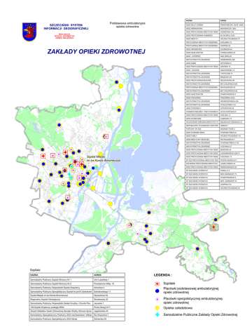 Podstawowa ambulatoryjna opieka zdrowotna SZCZECIŃSKI SYSTEM INFORMACJI GEOGRAFICZNEJ Mapę wykonał WYDZIAŁ INFORMATYKI URZĘDU MIEJSKIEGO ZAKŁADY OPIEKI ZDROWOTNEJ NAZWA ADRES NZOZ MULTI-CORDIS POWSTAŃCÓW WLKP. 66/68 NZOZ ABRAMOWSKI MICKIEWICZA 128A NZOZ PRZYCHODNIA MEDYCYNY RODZ ODZIEŻOWA 12A NZOZ PRZYCHODNIA-GUMIEŃCE KU SŁOŃCU 23/24 NZOZ MEDYCY WOJSKA POLSKIEGO 72 PRZYCHODNIA MEDYCYNY RODZINNEJ KADŁUBKA 10 PRZYCHODNIA MEDYCYNY RODZINNEJ CHOPINA 22 NZOZ HIPOKRATES ŁUCZNICZA 64 NZOZ NASZ DOKTOR STRZAŁOWSKA 25 NZOZ - INTERPED NAD ODRĄ 28 INDYW.PRAKTYKI LEKARSKIE KRZEMIENNA 42B NZOZ DĄBIE GRYFIŃSKA 2 NZOZ PRZYCHODNIE MEDYCYNY RODZ SZAFERA 16 NZOZ - MAJOWE NAŁKOWSKIEJ 14 INDYW.PRAKTYKI LEKARSKIE TARTACZNA 14 INDYW.PRAKTYKI LEKARSKIE BRĄZOWA 6/8 NZOZ PRZYCHODNIA-BUKOWE SELEDYNOWA 99 INDYW.PRAKTYKI LEKARSKIE BAT.CHŁOPSKICH 86 PRZYCHODNIA MEDYCYNY RODZINNEJ MACIEJEWICZA 25 INDYW.PRAKTYKI LEKARSKIE BAT.CHŁOPSKICH 38 NZOZ NASZ DOKTOR STARZYŃSKIEGO 2 NZOZ PODGÓRNA PODGÓRNA 22/23 INDYW.PRAKTYKI LEKARSKIE HRUBIESZOWSKA 22A INDYW.PRAKTYKI LEKARSKIE STOŁCZYŃSKA 161 NZOZ POGODNA II WITKIEWICZA 64 DOMMED,FAMILMED - PRZYCHODNIE M 26-GO KWIETNIA 63 NZOZ PRZYCHODNIA MEDYCYNY RODZ WIŚLANA 14 NZOZ SŁONECZNE ŁUBINOWA 15 WOJEWÓDZKI OŚRODEK MEDYCYNY PR BOLESŁAWA ŚMIAŁEGO 33 NIEPUBLICZNY STOCZNIOWY ZOZ PORT ç ç ç ç ç çç Szpital Miejski Szpital Miejski Szpital Miejski Miejski Szpital Szpital Miejski im.św.Karola im.św.Karola im.św.Karola Boromeusza Boromeusza Boromeusza ç ç DUBOIS 7 PORTOWY SP ZOZ ENERGETYKÓW 2 NZOZ STAROMŁYŃSKA STAROMŁYŃSKA 23 NZOZ FAMILY WOJSKA POLSKIEGO 101 NZOZ MEDYCYNY SZKOLNEJ ŚW.WOJCIECHA 7 INDYW.PRAKTYKI LEKARSKIE STAROMŁYŃSKA 21-26 INDYW.PRAKTYKI LEKARSKIE 3-GO MAJA 27 NZOZ PRZYCHODNIA MEDYCYNY RODZ MIODOWA 45 NZOZ PRZYCHODNIA MEDYCYNY RODZ ŁUKASIŃSKIEGO 42B/12 NZOZ PRZYCHODNIA MEDYCYNY RODZ 9-GO MAJA 13 SP ZOZ PRZYCHODNIA MEDYCYNY ROD PIOTRA SKARGI 9/11 ZOZ MSWiA PRZYCHODNIA MEDYCYNY JAGIELLOŃSKA 44 NZOZ PRZYCHODNIA MEDYCYNY RODZ DERDOWSKIEGO 28 SP ZOZ SZKÓŁ WYŻSZYCH PAWŁA VI 2 SP ZOZ SZKÓŁ WYŻSZYCH BOH.WARSZAWY 75 SP ZOZ SZKÓŁ WYŻSZYCH STARZYŃSKIEGO 9 SP ZOZ SZKÓŁ WYŻSZYCH BOH. WARSZAWY 51 SP ZOZ SZKÓŁ WYŻSZYCH CHOPINA 51A SP ZOZ SZKÓŁ WYŻSZYCH WOJSKA POLSKIEGO 97 ç ç Szpitale NAZWA ADRES Samodzielny Publiczny Szpital Kliniczny Nr 1 Unii Lubelskiej 1 Samodzielny Publiczny Szpital Kliniczny Nr 2 Powstańców Wlkp. 72 Samodzielny Publiczny Wojewódzki Szpital Zespolony Arkońska 4 Samodzielny Publiczny Specjalistyczny Szpital im.prof.A.Sokołowsk Sokołowskiego 11 Szpital Miejski im.św.Karola Boromeusza Wyzwolenia 52 Regionalny Szpital Onkologiczny Strzałowska 22 Samodzielny Publiczny Wojewódzki Zakład Gruźlicy i Chorób Płuc Janosika 1 109 Szpital Wojskowy podległy MON Piotra Skargi 9/11 LEGENDA : ç ç Szpitale Placówki podstawowej ambulatoryjnej opieki zdrowotnej Placówki specjalistycznej ambulatoryjnej opieki zdrowotnej Opieka całodobowa Zespół Zakładów Opieki Zdrowotnej Zarządu Służby Zdrowia Spraw Jagiellońska 44 Samodzielny Specjalistyczny Publiczny ZOZ nad Dzieckiem i Młodz Św.Wojciecha 7 Samodzielny Publiczny Specjalistyczny ZOZ Zdroje Żołnierska 55 Samodzielne Publiczne Zakłady Opieki Zdrowotnej