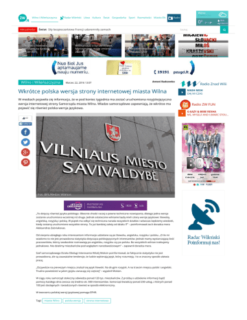 Wilno Wilno i Wileńszczyzna Aktualności Radar Wileński Litwa Kultura Świat Gospodarka Sport Rozmaitości Miasto Ełk Świat Siły bezpieczeństwa Francji udaremniły zamach Chłopaki z Niemenczyna z medalami na turnieju bokserskim Wilno i Wileńszczyzna Benkunskas o Syrokmlówce: Ministerstwo może zmienić zdanie Prezydent malowała pisanki w Niemenczynie Antoni Radczenko Wkrótce polska wersja strony internetowej miasta Wilna W mediach pojawiła się informacja, że w pod koniec tygodnia ma zostać uruchomiona rosyjskojęzyczna wersja internetowej strony Samorządu miasta Wilna. Władze samorządowe zapewniają, że wkrótce ma pojawić się również polska wersja językowa. 42 Lubię to! Fot. BFL/Redas Vilimas „To dotyczy również języka polskiego. Obecnie chodzi raczej o pewne techniczne rozwiązania, dlatego jedna wersja zostanie uruchomiona wcześniej niż druga. Jednak ostatecznie wilnianie będą mieli cztery wersje językowe: litewską, angielską, rosyjską i polską. W piątek ma odbyć się techniczna narada wszystkich działów i wówczas będziemy wiedzieli, kiedy zostaną uruchomione wszystkie strony. To już bardziej zależy od działu IT” – poinformował zw.lt doradca mera Aleksandras Zubriakovas. Od sierpnia ubiegłego roku interesantom informacje udzielane są po litewsku, angielsku, rosyjsku i polsku. „O ile mi wiadomo to nie jest prowadzona statystyka dotycząca polskojęzycznych interesantów. Jednak mamy wystarczającą ilość pracowników, którzy swobodnie rozmawiają po angielsku, rosyjsku czy po polsku. Bo wszystkich wilnian traktujemy jednakowo. Nie dzielimy mieszkańców pod względem narodowościowym” – zapewnił doradca mera. Szef samorządowego Działu Obsługi Interesanta Witalij Moksin poinformował, że faktycznie statystyka nie jest prowadzona, ale są zauważalne tendencje, że ludzie wybierają język, który rozumieją. I to w znaczny sposób ułatwia pracę. „Oczywiście na pierwszym miejscu znalazł się język litewski. Na drugim rosyjski. A na trzecim miejscu polski i angielski. Trudno powiedzieć w jakim języku zwracają się częściej” – wyjaśnił Moksin. W ciągu roku samorząd stołeczny odwiedza ponad 120 tys. mieszkańców. Z prośbą o udzielenie informacji bądź pomocy każdego dnia zwraca się średnio ok. 500 interesantów. Samorząd świadczy ponad 250 usług, z których ponad W tworzeniu polskiej wersji językowej pomaga EFHR. Tagi: miasto Wilno polska wersja strona internetowa 0º -2º / 2º 86% 19km/h Szukaj Marzec 22, 2016 13:07 100 jest dostępnych i świadczonych również w sposób elektroniczny. 25 MARCA 2016 Radio Po 11 latach – przymusowa zmiana nazwiska Radio Znad Wilii MASH MISH DAJ MI CZAS Radio ZW FUN G-EAZY & BEBE REXHA ME, MYSELF AND I (MARC STOU… Więcej Prev Next Oryginalna pisownia nazwisk: Mydlenie oczu przed wyborami? Zwrot ziemi w Wilnie: Brak miejsca czy brak woli politycznej? Od dzisiaj w samorządzie wileńskim – także po polsku Komentarze: 0 Oryginalna pisownia nazwisk: Mydlenie oczu przed wyborami? Sortuj według Najstarsze Dodaj komentarz... Facebook Comments Plugin Rezurekcje w Wilnie oraz w rejonach wileńskim i solecznickim Ekstremalna Droga Krzyżowa po raz pierwszy na Litwie Benkunskas o Syrokmlówce: Ministerstwo może zmienić zdanie Prezydent malowała pisanki w Niemenczynie Po 11 latach – przymusowa zmiana nazwiska Dzisiaj Kościół Katolicki obchodzi Wielki Czwartek Oryginalne wydmuszki Anny Urbanowicz Brussels Airlines i airBaltic odwołują loty do Wilna Więcej informacji ZW.lt w Twoim smartfonie Ostatnio dodane Słowiańska joga w wileńskich parkach TWITTER Pobierz na Androida Portal Litwa Salon polityczny Pobierz na iPhone FACEBOOK Tweets by @RadioZnadWilii1 Litwin może otrzymać Nobla Radio Znad Wilii @RadioZnadWilii1 Litwin może otrzymać Nobla zw.lt/litwa/litwinm… Siły bezpieczeństwa Francji udaremniły zamach 53m Dzielimy się informacjami! Benkunskas o Syrokmlówce: Ministerstwo może zmienić zdanie zw.lt/wilno-wilenszc… Embed Radio Znad Wilii 7,334 likes Like Page Share Be the first of your friends to like this Radio Radio Znad Wilii @RadioZnadWilii1 40 lat więzienia dla Karadżicia za ludobójstwo Opinie Sport Gospodarka Kultura Rozmaitości Świat Ogłoszenia Mobile Version View on Twitter 15h Koncert Życzeń Projekty Konkurs Radio Znad Wilii Ludzie Radio Znad Wilii Portal zw.lt Reklama Pracownicy Brandbook Rekwizyty