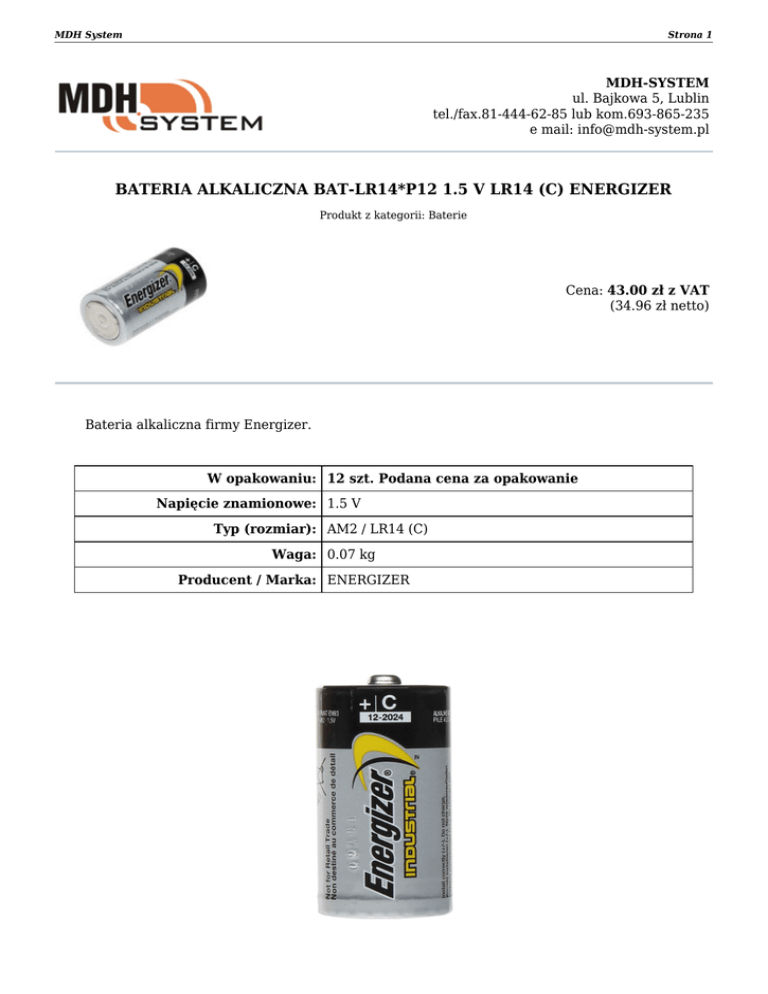 MDH System Strona 1 MDH-SYSTEM ul. Bajkowa 5, Lublin tel./fax.81-444-62-85 lub kom.693-865-235 e mail: [email protected] BATERIA ALKALICZNA BAT-LR14*P12 1.5 V LR14 (C) ENERGIZER Produkt z kategorii: Baterie Cena: 43.00 zł z VAT (34.96 zł netto) Bateria alkaliczna firmy Energizer. W opakowaniu: 12 szt. Podana cena za opakowanie Napięcie znamionowe: 1.5 V Typ (rozmiar): AM2 / LR14 (C) Waga: 0.07 kg Producent / Marka: ENERGIZER MDH System Strona 2 Opakowanie: Zapraszamy do naszego sklepu internetowego www.mdh-system.pl Dokument wygenerowany 2017-03-04 o godzinie 06:41