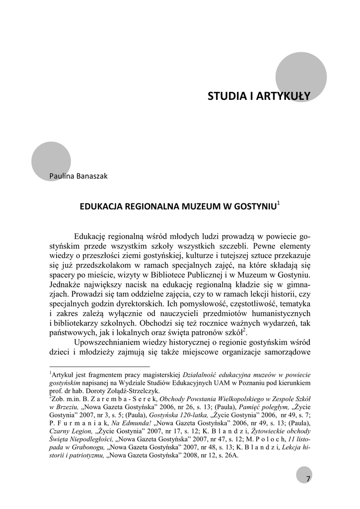 STUDIA I ARTYKUŁY Paulina Banaszak EDUKACJA REGIONALNA MUZEUM W GOSTYNIU1 Edukację regionalną wśród młodych ludzi prowadzą w powiecie gostyńskim przede wszystkim szkoły wszystkich szczebli. Pewne elementy wiedzy o przeszłości ziemi gostyńskiej, kulturze i tutejszej sztuce przekazuje się już przedszkolakom w ramach specjalnych zajęć, na które składają się spacery po mieście, wizyty w Bibliotece Publicznej i w Muzeum w Gostyniu. Jednakże największy nacisk na edukację regionalną kładzie się w gimnazjach. Prowadzi się tam oddzielne zajęcia, czy to w ramach lekcji historii, czy specjalnych godzin dyrektorskich. Ich pomysłowość, częstotliwość, tematyka i zakres zależą wyłącznie od nauczycieli przedmiotów humanistycznych i bibliotekarzy szkolnych. Obchodzi się też rocznice ważnych wydarzeń, tak państwowych, jak i lokalnych oraz święta patronów szkół2. Upowszechnianiem wiedzy historycznej o regionie gostyńskim wśród dzieci i młodzieży zajmują się także miejscowe organizacje samorządowe 1 Artykuł jest fragmentem pracy magisterskiej Działalność edukacyjna muzeów w powiecie gostyńskim napisanej na Wydziale Studiów Edukacyjnych UAM w Poznaniu pod kierunkiem prof. dr hab. Doroty Zołądź-Strzelczyk. 2 Zob. m.in. B. Z a r e m b a - S e r e k, Obchody Powstania Wielkopolskiego w Zespole Szkół w Brzeziu, „Nowa Gazeta Gostyńska” 2006, nr 26, s. 13; (Paula), Pamięć poległym, „Życie Gostynia” 2007, nr 3, s. 5; (Paula), Gostyńska 120-latka, „Życie Gostynia” 2006, nr 49, s. 7; P. F u r m a n i a k, Na Edmunda! „Nowa Gazeta Gostyńska” 2006, nr 49, s. 13; (Paula), Czarny Legion, „Życie Gostynia” 2007, nr 17, s. 12; K. B l a n d z i, Żytowieckie obchody Święta Niepodległości, „Nowa Gazeta Gostyńska” 2007, nr 47, s. 12; M. P o l o c h, 11 listopada w Grabonogu, „Nowa Gazeta Gostyńska” 2007, nr 48, s. 13; K. B l a n d z i, Lekcja historii i patriotyzmu, „Nowa Gazeta Gostyńska” 2008, nr 12, s. 26A. 7 ROCZNIK GOSTYŃSKI 1 2014 i instytucje kultury – Biblioteka Publiczna Miasta i Gminy w Gostyniu, Gostyński Ośrodek Kultury „Hutnik” i Muzeum w Gostyniu. W istotny sposób w procesie tym uczestniczą też organizacje pozarządowe – np. Gostyńskie Towarzystwo Kulturalne, Gostyńskie Towarzystwo Historyczne, Towarzystwo Miłośników Gostyńskiej Fary czy Koło Polskiego Związku Filatelistów w Gostyniu. Pierwsze zajęcia z myślą o młodzieży przeprowadzono w Gostyniu w roku 1985. Od stycznia do maja odbywało się Młodzieżowe Studium Wiedzy o Regionie. Wykłady przeprowadzili członkowie Gostyńskiego Towarzystwa Kulturalnego i pracownicy Muzeum w Gostyniu: mgr Stefan Jankowiak, mgr Andrzej Grześkowiak, mgr Roman Tomaszewski, mgr Jan Poprawa i mgr Henryk Gościański. 25 stałych uczestników otrzymało dyplomy okolicznościowe i kalendarze regionalne3. To jedyny taki przypadek. W praktyce bowiem do połowy lat dziewięćdziesiątych XX wieku Muzeum w Gostyniu nie prowadziło przemyślanej i ukierunkowanej edukacji regionalnej wśród młodzieży. Koncentrowano swoją uwagę przede wszystkim na osobach dorosłych – dla nich organizowano wystawy, konferencje naukowe, prelekcje, wydawano publikacje regionalne. Systematyczna praca z młodzieżą rozpoczęła się dopiero w roku 1996, gdy prezesem Gostyńskiego Towarzystwa Kulturalnego został Jan Poprawa, nauczyciel historii i geografii w miejscowym Zespole Szkół Zawodowych w Gostyniu. W pierwszej kolejności *zmieniła się postawa członków GTK, a w konsekwencji także historyków zatrudnionych w Muzeum w Gostyniu4. Najstarszym konkursem o tematyce regionalnej organizowanym dla młodych osób jest rywalizacja głosząca hasło „Wiem więcej o… ziemi gostyńskiej”. Odbywa się ona nieprzerwanie od 1993 roku, każdorazowo z okazji kolejnych Dni Gostynia. Organizatorami konkursu od samego początku są: Gostyńskie Towarzystwo Kulturalne, Biblioteka Publiczna i Muzeum w Gostyniu. Pierwotnie brali w nim udział uczniowie szkół podstawowych i średnich, a po reorganizacji szkolnictwa – gimnazjaliści i uczniowie szkół ponadgimnazjalnych z terenu powiatu gostyńskiego. Patronaty nad imprezą sprawują Burmistrz Gostynia i Starosta Gostyński. Nadrzędnym celem imprezy jest zainteresowanie młodzieży historią ziemi gostyńskiej oraz utrwalenie już zdobytej wiedzy. Każdorazowo uczestniczy w konkursach kilkadziesiąt osób. Od 1997 roku konkurs cieszy się wysokim prestiżem i stał się sztandarową imprezą organizowaną przez Muzeum w Gostyniu i Gostyńskie Towarzystwo Kulturalne5. 3 R. C z u b, R. F u r m a ń c z a k, J. P o p r a w a, Gostyńskie Towarzystwo Kulturalne 19572007, Gostyń 2007, s. 55. 4 R. C z u b, Muzealne wczoraj i dziś, „Nowa Gazeta Gostyńska” 2003, nr 25, s. 43. 5 Zob. m.in. I. M e h r, Dni Gostynia w bibliotece, „Nowa Gazeta Gostyńska” 2006, nr 24, s. 10; E. C z u b, Ziemia gostyńska bez tajemnic, „Nowa Gazeta Gostyńska” 2007, nr 23, 8 STUDIA I ARTYKUŁY W 2000 roku po raz pierwszy zorganizowano konkurs wiedzy pt. „Sławni gostynianie”. Jego organizatorami byli Gimnazjum nr 1 w Gostyniu, Muzeum w Gostyniu, Biblioteka Publiczna Miasta i Gminy w Gostyniu oraz Gostyńskie Towarzystwo Kulturalne. Jest to konkurs przeznaczony dla gimnazjalistów z terenu powiatu gostyńskiego. Także nad tymi zmaganiami honorowy patronat sprawuje Burmistrz Gostynia. Dotychczas przeprowadzono sześć edycji konkursu, a jego bohaterami byli: Gustaw Potworowski, Edmund Bojanowski, Szczepan Kaczmarek, Przemysł II, Marcin Poniecki i Kasper Miaskowski6. Począwszy od roku 2001 w Gostyniu organizuje się konkurs wiedzy „Gostyń i okolice” w kategorii uczniów klas III szkół podstawowych z terenu gminy Gostyń. Przygotowują go Muzeum w Gostyniu, Biblioteka Publiczna Miasta i Gminy w Gostyniu, Gostyńskie Towarzystwo Kulturalne oraz Szkoła Podstawowa nr 5 im. ks. Franciszka Olejniczaka w Gostyniu. Jes
