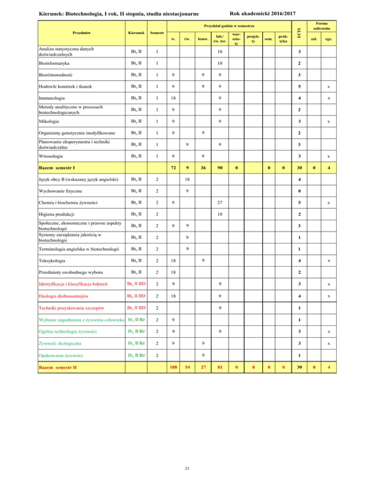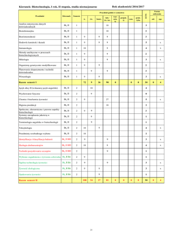 Rok akademicki 2016/2017 Kierunek: Biotechnologia, I rok, II stopnia, studia niestacjonarne Przedmiot Kierunek Semestr w. ćw. konw. lab./ ćw. ter. warsztaty projekty sem. praktyka ECTS Przydział godzin w semestrze Forma zaliczenia zal. egz. Analiza statystyczna danych doświadczalnych Btz II 1 18 3 Bioinformatyka Btz II 1 18 2 Bioróżnorodność Btz II 1 9 9 9 3 Hodowle komórek i tkanek Btz II 1 9 9 9 5 x Immunologia Btz II 1 18 9 4 x Metody analityczne w procesach biotechnologicznych Btz II 1 9 9 2 Mikologia Btz II 1 9 9 3 Organizmy genetycznie modyfikowane Btz II 1 9 Planowanie eksperymentu i techniki doświadczalne Btz II 1 Wirusologia Btz II 1 9 9 72 Razem semestr I 9 2 9 3 9 9 36 3 90 0 0 0 30 Język obcy II (wskazany język angielski) Btz II 2 18 4 Wychowanie fizyczne Btz II 2 9 0 Chemia i biochemia żywności Btz II 2 Higiena produkcji Btz II 2 Btz II 2 Btz II Terminologia angielska w biotechnologii Społeczne, ekonomiczne i prawne aspekty biotechnologii Systemy zarządzania jakością w biotechnologii 9 x 27 5 18 2 x 0 4 x 9 3 2 9 1 Btz II 2 9 1 Toksykologia Btz II 2 18 Przedmioty swobodnego wyboru Btz II 2 18 Identyfikacja i klasyfikacja bakterii Btz II BD 2 9 9 3 x Ekologia drobnoustrojów Btz II BD 2 18 9 4 x Techniki pozyskiwania szczepów Btz II BD 2 9 1 Wybrane zagadnienia z żywienia człowieka Btz II Bż 2 9 Ogólna technologia żywności Btz II Bż 2 9 Żywność ekologiczna Btz II Bż 2 9 Opakowania żywności Btz II Bż 2 Razem semestr II 9 108 9 x 4 2 1 9 54 21 3 x 9 3 x 9 1 27 81 0 0 0 0 30 0 4
