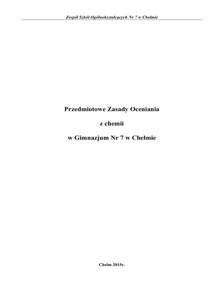 Zespół Szkół Ogólnokształcących Nr 7 w Chełmie Przedmiotowe Zasady Oceniania z chemii w Gimnazjum Nr 7 w Chełmie Chełm 2015r. Zespół Szkół Ogólnokształcących Nr 7 w Chełmie Przedmiotowe Zasady Oceniania z chemii opracowane zostały na podstawie: 1. Rozporządzenia MEN i S z dnia 7 września 2004r w sprawie warunków i sposobu oceniania, klasyfikowania i promowania uczniów i słuchaczy oraz przeprowadzania egzaminów i sprawdzianów w szkołach publicznych (Dz. U. nr 199 z 2004r). 2. Podstawy programowej dla gimnazjum z chemii i ścieżek edukacyjnych. 3. Programu nauczania chemii 4. Wewnątrzszkolnych Zasad Oceniania w Gimnazjum Nr 7 w ZSO Nr 7 w Chełmie. Dotychczasowe ewaluacja przedstawionych niżej Przedmiotowych Zasad Oceniania i wymagań programowych potwierdza wszystkie cele i nadzieje nauczyciela towarzyszące jego opracowywaniu: - sprawiedliwy a jednocześnie zobiektywizowany sposób oceniania - ocenianie nabytej wiedzy i umiejętności ucznia - docenianie wkładu pracy przy uczeniu się - ukierunkowane wysiłków ucznia przy opanowywaniu obowiązującego materiału - należyte przygotowanie do egzaminu gimnazjalnego z części przyrodniczo-matematycznej - ułatwienie i zwiększenie efektywności pracy nauczyciela: - zrealizowanie w pełni obowiązującego zakresu chemii w gimnazjum - dostarczenie pełnej informacji o aktywności i postępach uczniów - wychwycenie uczniów specjalnie uzdolnionych. CELE OCENIANIA NA CHEMII. 1. Sprawdzanie umiejętności posługiwania się wiedzą chemiczną w życiu codziennym w sytuacjach typowych i problemowych. 2. Sprawdzanie wiadomości i umiejętności praktycznych. 3. Kształtowanie postaw ucznia. 4. Kształtowanie umiejętności logicznego samodzielnego myślenia. 5. Wskazanie uczniowi, nauczycielowi i rodzicom stanu umiejętności uczniów i pomoc w wyborze formy wyrównania braków lub pokonaniu trudności. METODY I NARZĘDZIA ORAZ SZCZEGÓŁOWE ZASADY SPRAWDZANIA I OCENIANIA OSIĄGNIĘĆ UCZNIÓW 1. Wypowiedzi ustne – połączone ze sprawdzeniem prac domowych 2 – 3 razy w semestrze, pod względem rzeczowości, stosowania języka chemicznego, umiejętności formułowania dłuższej wypowiedzi. Przy odpowiedzi ustnej obowiązuje znajomość materiału z tych lekcji, które są niezbędne do bieżącej i dalszej nauki. Uczeń może być zwolniony z odpowiedzi tylko w uzasadnionych przypadkach – dłuższa (tygodniowa) nieobecność w szkole oraz przykre zdarzenia i wypadki losowe. 2. Kartkówki 17 minutowe, zwane tu kontrolami wiedzy i umiejętności, obejmujące materiał z trzech, niekiedy czterech ostatnich lekcji; terminy i ich zakres w postaci pytań i zadań znane są uczniom na cały rok szkolny. W przypadkach niepowodzenia uczeń ma możliwość poprawy kartkówki. Uczniowie nieobecni na kartkówce piszą ją w najbliższym terminie (jeden tydzień) lub odpowiadają (opcjonalnie) ustnie przy tablicy. Uczeń może być zwolniony w danym dniu z kartkówki z powodów j.w., lecz niezwłocznie po ustaniu przeszkody powinien ją zaliczyć. Zrezygnowano z całogodzinnych obszernych sprawdzianów i testów dydaktycznych na rzecz zwiększonej liczby w.o. kontroli. Ponadto wobec dwóch godzin chemii tygodniowo w klasie trzeciej opracowano specjalny program powtórzeniowy, który powinien przynieść lepsze efekty niż sprawdziany i lepiej systematyzować wiedzę i umiejętności także przed końcowym egzaminem gimnazjalnym. 2 Zespół Szkół Ogólnokształcących Nr 7 w Chełmie 3. Merytorycznie poprawna aktywność ucznia premiowana może być oceną – np. za przeprowadzenie ciekawego doświadczenia lub dopisaniem do ocen znaku „+”. Ponieważ szkolny system oceniania nie przewiduje umieszczania ich w dzienniku, nauczyciel odnotowuje je w swoich dokumentach i bierze pod uwagę przy wystawianiu oceny semestralnej lub końcowej. 4. Prace domowe obowiązkowe i dla chętnych. Wobec znacznego obciążenia uczniów nauką z wielu przedmiotów oraz wątpliwej wartości dydaktycznej, nauczyciel chemii chciałby unikać zadawania pisemnych prac do domu. Jego marzeniem jest wypracowanie takich swoich działań, by maksymalne efekty dydaktyczne uzyskać w trakcie lekcji i na tyle uczynić je ciekawymi, by uczeń z własnej woli pogłębiał wiedzę w domu. Jednakże wobec rosnących wymagać egzaminacyjnych i skąpej ilości czasu przeznaczonego na naukę w szkole jest zmuszony prace takie zadawać i konsekwentnie sprawdzać ich wykonanie przez każdego ucznia 2 – 3 razy w semestrze. 5. Zeszyt przedmiotowy. Uczeń zobowiązany jest do prowadzenia zeszytu przedmiotowego, stąd nauczyciel nie uważa, by premiować go za to specjalną oceną. Motywuje go natomiast podawaniem do zapisania treści niezbędnych przy egzekwowaniu odpowiedzi, czy pisaniu kartkówek oraz żąda okazania zeszytu w trakcie odpowiedzi. Systematycznie i estetycznie prowadzony zeszyt decyduje w przypadku wątpliwości przy wystawianiu oceny semestralnej lub końcowej. W przypadku kartkówek przyjmuje się skalę punktową przeliczaną na oceny cyfrowe wg kryteriów. • ocena celująca.........................91% plus zadanie dodatkowe • bardzo dobra............................100%-91% • dobra........................................90%-71% • dostateczna..............................70%-51% • dopuszczająca..........................50%-31% • niedostateczna.........................30%-0%. Oceny wystawiane przez nauczyciela są uczniowi znane. OGÓLNE KRYTERIA OCENIANIA Z CHEMII: Ocenę celującą otrzymuje uczeń, który: posiada wiadomości i umiejętności znacznie wykraczające poza program nauczania, potrafi korzystać z różnych źródeł informacji nie tylko tych wskazanych przez nauczyciela, potrafi stosować wiadomości w sytuacjach nietypowych (problemowych), proponuje rozwiązania nietypowe, umie formułować problemy i dokonywać analizy syntezy nowych zjawisk, potrafi precyzyjnie rozumować posługujące się wieloma elementami