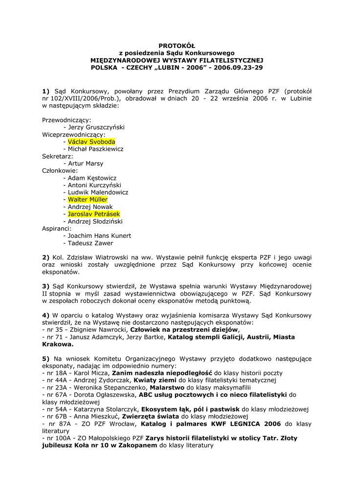 PROTOKÓŁ z posiedzenia Sądu Konkursowego MIĘDZYNARODOWEJ WYSTAWY FILATELISTYCZNEJ POLSKA - CZECHY „LUBIN - 2006” - 2006.09.23-29 1) Sąd Konkursowy, powołany przez Prezydium Zarządu Głównego PZF (protokół nr 102/XVIII/2006/Prob.), obradował w dniach 20 - 22 września 2006 r. w Lubinie w następującym składzie: Przewodniczący: - Jerzy Gruszczyński Wiceprzewodniczący: - Václav Svoboda - Michał Paszkiewicz Sekretarz: - Artur Marsy Członkowie: - Adam Kęstowicz - Antoni Kurczyński - Ludwik Malendowicz - Walter Müller - Andrzej Nowak - Jaroslav Petrásek - Andrzej Słodziński Aspiranci: - Joachim Hans Kunert - Tadeusz Zawer 2) Kol. Zdzisław Wiatrowski na ww. Wystawie pełnił funkcję eksperta PZF i jego uwagi oraz wnioski zostały uwzględnione przez Sąd Konkursowy przy końcowej ocenie eksponatów. 3) Sąd Konkursowy stwierdził, że Wystawa spełnia warunki Wystawy Międzynarodowej II stopnia w myśl zasad wystawiennictwa obowiązującego w PZF. Sąd Konkursowy w zespołach roboczych dokonał oceny eksponatów metodą punktową. 4) W oparciu o katalog Wystawy oraz wyjaśnienia komisarza Wystawy Sąd Konkursowy stwierdził, że na Wystawę nie dostarczono następujących eksponatów: - nr 35 - Zbigniew Nawrocki, Człowiek na przestrzeni dziejów, - nr 71 - Janusz Adamczyk, Jerzy Bartke, Katalog stempli Galicji, Austrii, Miasta Krakowa. 5) Na wniosek Komitetu Organizacyjnego Wystawy przyjęto dodatkowo następujące eksponaty, nadając im odpowiednio numery: - nr 18A - Karol Micza, Zanim nadeszła niepodległość do klasy historii poczty - nr 44A - Andrzej Zydorczak, Kwiaty ziemi do klasy filatelistyki tematycznej - nr 23A - Weronika Stepanczenko, Malarstwo do klasy maksymafilii - nr 67A - Dorota Ogłaszewska, ABC usług pocztowych i co nieco filatelistyki do klasy młodzieżowej - nr 54A - Katarzyna Stolarczyk, Ekosystem łąk, pól i pastwisk do klasy młodzieżowej - nr 67B - Anna Mieszkuć, Zwierzęta świata do klasy młodzieżowej - nr 87A - ZO PZF Wrocław, Katalog i palmares KWF LEGNICA 2006 do klasy literatury - nr 100A - ZO Małopolskiego PZF Zarys historii filatelistyki w stolicy Tatr. Złoty jubileusz Koła nr 10 w Zakopanem do klasy literatury - nr 100B - ZO Małopolskiego PZF Rocznica wymarszu ku wolności – katalog KWF Kraków 2004 do klasy literatury - nr 100C - ZO Małopolskiego PZF Filatelista Małopolski do klasy literatury - nr 100D - ZO PZF Wrocław Wrocławski Informator Filatelistyczny do klasy literatury 6) Ponadto Sąd Konkursowy: a) dokonał przesunięć w klasach konkursowych następujących eksponatów: - nr 41 - z klasy tematycznej do klasy aerofilatelistyki - nr 16 - z klasy historii poczty do klasy tradycyjnej - nr 44 - z klasy tematycznej do klasy sędziów i aspirantów b) wyłączył z oceny następujące eksponaty: - nr 87 – Oddział PZF Ruda Śląska, Katalog wystawy Euro*Fil* Hobby – Ruda Śląska (współautor jest członkiem Sądu Konkursowego) - nr 99 - ZO Śląsko-Dąbrowskiego PZF, Katalog, Palmares, Przewodnik XIX OWF Katowice 2003 (nie spełnia wymogów regulaminowych Wystawy) c) dokonał korekt do Katalogu Wystawy, uaktualniając tytuły eksponatów wg tytułów prezentowanych na karcie tytułowej. 7) Sąd Konkursowy zgodnie z punktem 11 Regulaminu Sądu Konkursowego przyznał następujące nagrody: Nagrodę GRAND PRIX Wystawy – statuetkę św. Barbary autorstwa Janusza Owsianego - dla najlepszego eksponatu wystawianego w klasach konkursowych Wystawy wszystkimi głosami otrzymał eksponat nr 24 - Lumír Brendl Z temna k národnímu probuzení a vzniku Československa 1918-1945 / Trudne czasy w Bohemii w latach 1620 – 1918 i Czechosłowacji 1918 – 1945 wraz z dyplomem w randze medalu dużego złotego (97 pkt.) Nagrodę Specjalną dla najlepszego eksponatu w klasie filatelistyki tradycyjnej otrzymał eksponat nr 6 - Petr Radosta Velká Británie 1840-1873 / Wielka Brytania 1840-1873 wraz z dyplomem w randze medalu dużego złotego (94 pkt.) Nagrodę specjalną dla najlepszego eksponatu w klasie historii poczty otrzymał eksponat nr 18A - Karol Micza - Zanim nadeszła niepodległość wraz z dyplomem w randze medalu złotego (89 pkt.) Nagrodę specjalną dla najlepszego eksponatu w klasie młodzieżowej otrzymał eksponat nr 58 - Alicja Łuszczyna Ruch olimpijski w Polsce wraz z dyplomem w randze medalu dużego pozłacanego (84 pkt.) Nagrodę specjalną dla najlepszego eksponatu w klasie literatury otrzymał eksponat nr 86 - Komitet Organizacyjny KWF Trzebinia Katalog Całostki lata 19192003 wraz z dyplomem w randze medalu dużego pozłacanego (83 pkt.) 8) W klasach konkursowych Sąd Konkursowy przyznał następujące wyróżnienia: [w poniższych tabelach podano kolejno: nr eksponatu / imię, nazwisko, Okręg i kraj wystawcy / tytuł eksponatu / przyznane punkty i wyróżnienie: medal (skróty: DZ – dyplom w stopniu medalu dużego złotego; Z – złotego; DPZ – dużego pozłacanego; PZ – pozłacanego; DS – dużego srebrnego; S – srebrnego; PS – posrebrzanego; B – brązowego) lub dyplom (D) / ewentualny numer przyznanej nagrody – wg listy dostarczonej przez Komitet Organizacyjny Wystawy] N r Wystawca (okręg) Tytuł eksponatu KLASA FILATELISTYKI TRADYCYJNEJ Punkty Medal Nagro da 1 Jerzy Gibek, O. Wałbrzych, PL 2 Jan Malik, O. Małopolski, PL Stanisław Malita, O. Wrocław, PL Ladislav Ondruška, KF Praha, CZ 3 4 5 6 7 1 6 Wacław Połcik, O. Śląsko-Dąbrowski, PL Petr Radosta, KF Horní Slavkov, CZ Miroslav Šťotka, KF Ostrava, CZ Jiří Sedlák, KF Kladno, CZ Zmagania sportowe – okolicznościowe wydawnictwa Poczty Polskiej 1926-1939 Czechy – Słowacja / I Republika Francja Generální Gouvernement 1939-1944 Generalne Gubernatorstwo 1939 - 1944 Rzeczpospolita Polska 1944-1954 Velká Británie 1840-1873 Wielka Brytania 1840-1873 Bosna a Hercegovina do roku 1918 Bośnia i Hercegowina do roku 1918 Česká Republika 19932005: Ocelotisk z plochých desek Republika Czech 19932005: rytodruki 