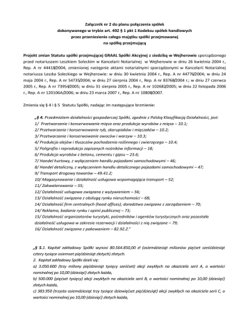 Załącznik nr 2 do planu połączenia spółek dokonywanego w trybie art. 492 § 1 pkt 1 Kodeksu spółek handlowych przez przeniesienie całego majątku spółki przejmowanej na spółkę przejmującą Projekt zmian Statutu spółki przejmującej GRAAL Spółki Akcyjnej z siedzibą w Wejherowie sporządzonego przed notariuszem Leszkiem Soleckim w Kancelarii Notarialnej w Wejherowie w dniu 26 kwietnia 2004 r., Rep. A nr 44418/2004, zmienionej następnie aktami notarialnymi sporządzonymi w Kancelarii Notarialnej notariusza Leszka Soleckiego w Wejherowie: w dniu 30 kwietnia 2004 r., Rep. A nr 44776/2004; w dniu 24 maja 2004 r., Rep. A nr 54735/2004; w dniu 27 sierpnia 2004 r., Rep. A nr 83768/2004 r.; w dniu 27 czerwca 2005 r., Rep. A nr 73954/2005; w dniu 31 sierpnia 2005 r., Rep. A nr 102682/2005; w dniu 22 listopada 2006 r., Rep. A nr 120106A/2006; w dniu 23 marca 2007 r., Rep. A nr 10808/2007. Zmienia się § 4 i § 5 Statutu Spółki, nadając im następujące brzmienie: „§ 4. Przedmiotem działalności gospodarczej Spółki, zgodnie z Polską Klasyfikacją Działalności, jest: 1/ Przetwarzanie i konserwowanie mięsa oraz produkcja wyrobów z mięsa – 10.1; 2/ Przetwarzanie i konserwowanie ryb, skorupiaków i mięczaków – 10.2; 3/ Przetwarzanie i konserwowanie owoców i warzyw – 10.3; 4/ Produkcja olejów i tłuszczów pochodzenia roślinnego i zwierzęcego – 10.4; 5/ Poligrafia i reprodukcja zapisanych nośników informacji – 18; 6/ Produkcja wyrobów z betonu, cementu i gipsu – 23.6; 7/ Handel hurtowy, z wyłączeniem handlu pojazdami samochodowymi – 46; 8/ Handel detaliczny, z wyłączeniem handlu detalicznego pojazdami samochodowymi – 47; 9/ Transport drogowy towarów – 49.41.Z; 10/ Magazynowanie i działalnośd usługowa wspomagająca transport – 52; 11/ Zakwaterowanie – 55; 12/ Działalnośd usługowa związana z wyżywieniem – 56; 13/ Działalnośd związana z obsługą rynku nieruchomości – 68; 14/ Działalnośd firm centralnych (head offices); doradztwo związane z zarządzeniem – 70; 14/ Reklama, badanie rynku i opinii publicznej – 73; 15/ Działalnośd organizatorów turystyki, pośredników i agentów turystycznych oraz pozostała działalnośd usługowa w zakresie rezerwacji i działalności z nią związane – 79; 16/ Działalnośd związana z pakowaniem – 82.92.Z.” „§ 5.1. Kapitał zakładowy Spółki wynosi 80.564.850,00 zł (osiemdziesiąt milionów piędset sześddziesiąt cztery tysiące osiemset pięddziesiąt złotych) złotych. 2. Kapitał zakładowy Spółki dzieli się: a) 3.050.600 (trzy miliony pięddziesiąt tysięcy sześdset) akcji zwykłych na okaziciela serii A, o wartości nominalnej po 10,00 (dziesięd) złotych każda, b) 500.000 (piędset tysięcy) akcji zwykłych na okaziciela serii B, o wartości nominalnej po 10,00 (dziesięd) złotych każda, c) 383.950 (trzysta osiemdziesiąt trzy tysiące dziewiędset pięddziesiąt) akcji zwykłych na okaziciela serii C, o wartości nominalnej po 10,00 (dziesięd) złotych każda, d) 225.000 (dwieście dwadzieścia pięd tysięcy) akcji zwykłych na okaziciela serii D, o wartości nominalnej po 10,00 (dziesięd) złotych każda, e) 1.459.742 (jeden milion czterysta pięddziesiąt dziewięd tysięcy siedemset czterdzieści dwa) akcji zwykłych na okaziciela serii E, o wartości nominalnej po 10,00 (dziesięd) złotych każda, f) 2.230.000 (dwa miliony dwieście trzydzieści tysięcy) akcji zwykłych na okaziciela serii F, o wartości nominalnej po 10,00 (dziesięd) złotych każda, g) 207.148 (dwieście siedem tysięcy sto czterdzieści osiem) akcji zwykłych na okaziciela serii G, o wartości nominalnej po 10,00 (dziesięd) złotych każda, h) 45 (czterdzieści pięd) akcji zwykłych na okaziciela serii H, o wartości nominalnej po 10,00 (dziesięd) złotych każda”.