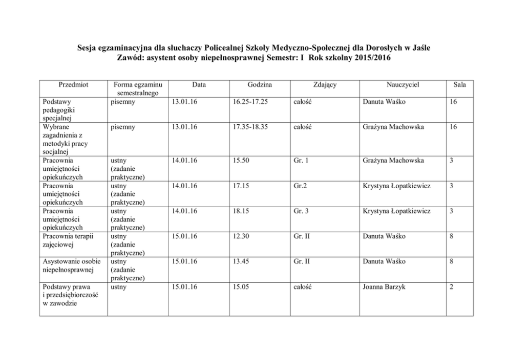 Sesja egzaminacyjna dla słuchaczy Policealnej Szkoły Medyczno-Społecznej dla Dorosłych w Jaśle Zawód: asystent osoby niepełnosprawnej Semestr: I Rok szkolny 2015/2016 Przedmiot Podstawy pedagogiki specjalnej Wybrane zagadnienia z metodyki pracy socjalnej Pracownia umiejętności opiekuńczych Pracownia umiejętności opiekuńczych Pracownia umiejętności opiekuńczych Pracownia terapii zajęciowej Asystowanie osobie niepełnosprawnej Podstawy prawa i przedsiębiorczość w zawodzie Data Zdający Forma egzaminu semestralnego pisemny Godzina Nauczyciel Sala 13.01.16 16.25-17.25 całość Danuta Waśko 16 pisemny 13.01.16 17.35-18.35 całość Grażyna Machowska 16 ustny (zadanie praktyczne) ustny (zadanie praktyczne) ustny (zadanie praktyczne) ustny (zadanie praktyczne) ustny (zadanie praktyczne) ustny 14.01.16 15.50 Gr. 1 Grażyna Machowska 3 14.01.16 17.15 Gr.2 Krystyna Łopatkiewicz 3 14.01.16 18.15 Gr. 3 Krystyna Łopatkiewicz 3 15.01.16 12.30 Gr. II Danuta Waśko 8 15.01.16 13.45 Gr. II Danuta Waśko 8 15.01.16 15.05 całość Joanna Barzyk 2 Wybrane zagadnienia z psychologii, socjologii i etyki Wybrane zagadnienia z anatomii, fizjologii i patologii Polityka społeczna ustny 16.01.16 8.00 całość Alicja Zając 2 ustny 16.01.16 8.00 całość Danuta Misiołek 11 ustny 16.01.16 11.30 całość Dorota Zygmunt 2 Asystowanie osobie niepełnosprawnej ustny (zadanie praktyczne) ustny (zadanie praktyczne) ustny 18.01.16 15.15 Gr. I Grażyna Machowska 3 18.01.16 16.00 Gr. I Monika Kulik-Marek 2 19.01.16 15.15 całość Grażyna Machowska 3 ustny 19.01.16 15.15 całość Danuta Waśko 11 Pracownia terapii zajęciowej Wybrane zagadnienia z metodyki pracy socjalnej Podstawy pedagogiki specjalnej ZDAJĄCY PROSZENI SĄ O PUNKTUALNE ZGŁOSZENIE SIĘ NA EGZAMIN Egzamin ustny: 4 słuchaczy/60 minut