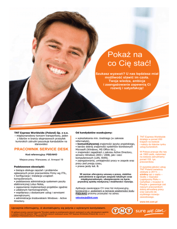 PokaŜ na co Cię stać! Szukasz wyzwań? U nas będziesz miał moŜliwość stawić im czoła. Twoja wiedza, ambicja i zaangaŜowanie zapewnią Ci rozwój i satysfakcję! TNT Express Worldwide (Poland) Sp. z o.o. - międzynarodowy koncern transportowy, jeden z liderów w branŜy ekspresowych przesyłek kurierskich zatrudni poszukuje kandydatów na stanowisko: PRACOWNIK SERVICE DESK Kod referencyjny: PSD/AHO Miejsce pracy: Warszawa, ul. Annopol 19 Podstawowe obowiązki: • bieŜąca obsługa zapytań i problemów zgłaszanych przez pracowników Firmy wg ITIL, • konfiguracja i instalacja urządzeń komputerowych, • podstawowa administracja systemem poczty elektronicznej Lotus Notes, • zapewnienie implementacji projektów zgodnie z ustalonym harmonogramem, • współpraca z dostawcami usług i serwisami zewnętrznymi, • administracja środowiskiem Windows - Active Directory. Od kandydatów oczekujemy: • wykształcenia min. średniego (w zakresie informatyki), • komunikatywnej znajomości języka angielskiego, • bardzo dobrej znajomości systemów biznesowych Microsoft (Windows, MS Office itd.), • znajomości zagadnień z zakresu Active Directory, serwery Windows 2003 / 2008, jaki i sieci komputerowych (LAN, WAN). • zaangaŜowania, umiejętności pracy w zespole oraz pracy pod presją czasu, • prawa jazdy kat. B. W zamian oferujemy umowę o pracę, stabilne zatrudnienie w zgranym zespole lokalnym oraz międzynarodowym, ubezpieczenie na Ŝycie, prywatną opiekę medyczną i moŜliwości rozwoju. Aplikacje zawierające CV oraz list motywacyjny, koniecznie z podaniem w temacie wiadomości kodu PSD/AHO prosimy przesyłać na adres: [email protected] Uprzejmie informujemy, iŜ skontaktujemy się jedynie z wybranymi kandydatami. W aplikacji prosimy zawrzeć klauzulę "WyraŜam zgodę na przetwarzanie danych osobowych w celu rekrutacyjnym zgodnie z ustawą z dnia 29 sierpnia 1997 r. o ochronie danych osobowych przez TNT Express Worldwide (Poland) Sp. z o.o. z siedzibą w Warszawie przy ul. WiraŜowej 35". TNT Express Worldwide działaja w ponad 200 krajach na świecie i naleŜy do liderów rynku usług kurierskich. W Polsce pracuje dla nas ok 1900 osób, natomiast na świecie zatrudniamy ponad 155 tys. pracowników. O wysokiej jakości usług TNT Poland świadczy zdobyte w 2011r. – siódmy raz z rzędu – Godło « Operator Logistyczny Roku ». Certyfikat « Investor in People » gwarantuje zaś naszym pracownikom dobrą atmosferę pracy oraz warunki do szybkiego rozwoju zawodowego. www.tnt.com.pl