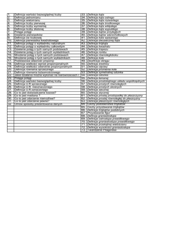 1. 2. 3. 4. 5. 6. 7. 8. 9. 10. 11. 12. 13. 14. 15. 16. 17. 18. 19. 20. 21. 22. 23. 24. 25. 26. 27. 28. 29. 30. 31. 32. Definicja wartości bezwzględnej liczby Definicja jednomianu Definicja wielomianu Definicja liczby pierwszej Definicja liczby wymiernej Definicja liczby złożonej Potęga potęgi Dzielenie pierwiastków Definicja osi liczbowej Definicja pierwiastka kwadratowego Definicja potęgi o wykładniku naturalnym Definicja potęgi o wykładniku całkowitym Dzielenie potęg o tych samych podstawach Dzielenie potęg o tych samych wykładnikach Mnożenie potęg o tych samych podstawach Mnożenie potęg o tych samych wykładnikach Podstawowa własność proporcji Definicja wielkości wprost proporcjonalnych Definicja wielkości odwrotnie proporcjonalnych Definicja równania sprzecznego Definicja równania tożsamościowego Jakie działania można wykonać na nierównościach r. Potęga potęgi Definicja wartości bezwzględnej liczby Definicja U.R sprzecznego Definicja U.R. nieoznaczonego Definicja U.R.oznaczonego Co to jest doświadczenie losowe? Co to jest mediana ? Co to jest zdarzenie niemożliwe? Co to jest zdarzenie pewne? Omów sposoby prezentowania danych 33. 34. 35. 36. 37. 38. 39. 40. 41. 42. 43. 44. 45. 46. 47. 48. 49. 50. 51. 52. 53. 54. 55. 56. 57. 58. 59. 60. 61. 62. 63. 64. 65. 66. 67. 68. 69. 70. 71. 72. 73. Definicja kąta Definicja kąta ostrego Definicja kąta rozwartego Definicja kąta środkowego Definicja kąta wklęsłego Definicja kąta wypukłego Definicja kątów przyległych Definicja kątów wierzchołkowych Definicja kata wpisanego Definicja dwusiecznej kąta Definicja trójkąta Definicja kwadratu Definicja trapezu Definicja rombu Definicja równoległoboku Definicja koła Dewfinicja okręgu Definicja średnicy Definicja cięciwy Definicja promienia koła Definicja symetralnej odcinka Definicja odcinka Definicja łamanej Definicja prostokątnego układu współrzędnych Definicja prostych równoległych Definicja prostych skośnych Definicja siecznej Definicja stycznej Definicja prostej prostopadłej do płaszczyzny Definicja prostej równoległej do płaszcyzny Definicja płaszczyzn równoległych Cechy podobieństwa trójkatów Cechy przystawania trójkątów Definicja trójkątów podobnych Przystawanie figur Defincja graniastosłupa Definicja ostrosłupa prawidłowego Definicja graniastosłupa prawidłowego Definicja przekątnej wielościanu Definicja wysokości graniastosłupa Twierdzenie Pitagorasa