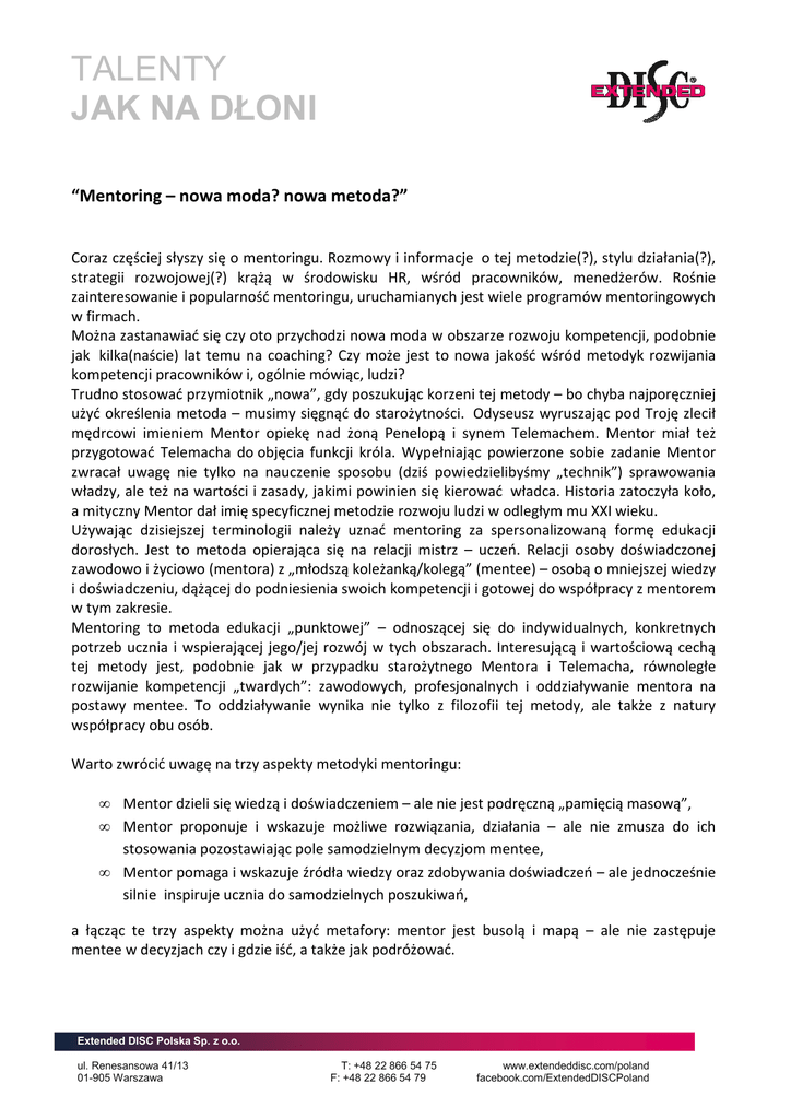 TALENTY JAK NA DŁONI “Mentoring – nowa moda? nowa metoda?” Coraz częściej słyszy się o mentoringu. Rozmowy i informacje o tej metodzie(?), stylu działania(?), strategii rozwojowej(?) krążą w środowisku HR, wśród pracowników, menedżerów. Rośnie zainteresowanie i popularność mentoringu, uruchamianych jest wiele programów mentoringowych w firmach. Można zastanawiać się czy oto przychodzi nowa moda w obszarze rozwoju kompetencji, podobnie jak kilka(naście) lat temu na coaching? Czy może jest to nowa jakość wśród metodyk rozwijania kompetencji pracowników i, ogólnie mówiąc, ludzi? Trudno stosować przymiotnik „nowa”, gdy poszukując korzeni tej metody – bo chyba najporęczniej użyć określenia metoda – musimy sięgnąć do starożytności. Odyseusz wyruszając pod Troję zlecił mędrcowi imieniem Mentor opiekę nad żoną Penelopą i synem Telemachem. Mentor miał też przygotować Telemacha do objęcia funkcji króla. Wypełniając powierzone sobie zadanie Mentor zwracał uwagę nie tylko na nauczenie sposobu (dziś powiedzielibyśmy „technik”) sprawowania władzy, ale też na wartości i zasady, jakimi powinien się kierować władca. Historia zatoczyła koło, a mityczny Mentor dał imię specyficznej metodzie rozwoju ludzi w odległym mu XXI wieku. Używając dzisiejszej terminologii należy uznać mentoring za spersonalizowaną formę edukacji dorosłych. Jest to metoda opierająca się na relacji mistrz – uczeń. Relacji osoby doświadczonej zawodowo i życiowo (mentora) z „młodszą koleżanką/kolegą” (mentee) – osobą o mniejszej wiedzy i doświadczeniu, dążącej do podniesienia swoich kompetencji i gotowej do współpracy z mentorem w tym zakresie. Mentoring to metoda edukacji „punktowej” – odnoszącej się do indywidualnych, konkretnych potrzeb ucznia i wspierającej jego/jej rozwój w tych obszarach. Interesującą i wartościową cechą tej metody jest, podobnie jak w przypadku starożytnego Mentora i Telemacha, równoległe rozwijanie kompetencji „twardych”: zawodowych, profesjonalnych i oddziaływanie mentora na postawy mentee. To oddziaływanie wynika nie tylko z filozofii tej metody, ale także z natury współpracy obu osób. Warto zwrócić uwagę na trzy aspekty metodyki mentoringu: • • • Mentor dzieli się wiedzą i doświadczeniem – ale nie jest podręczną „pamięcią masową”, Mentor proponuje i wskazuje możliwe rozwiązania, działania – ale nie zmusza do ich stosowania pozostawiając pole samodzielnym decyzjom mentee, Mentor pomaga i wskazuje źródła wiedzy oraz zdobywania doświadczeń – ale jednocześnie silnie inspiruje ucznia do samodzielnych poszukiwań, a łącząc te trzy aspekty można użyć metafory: mentor jest busolą i mapą – ale nie zastępuje mentee w decyzjach czy i gdzie iść, a także jak podróżować. Extended DISC Polska Sp. z o.o. ul. Renesansowa 41/13 01-905 Warszawa T: +48 22 866 54 75 F: +48 22 866 54 79 www.extendeddisc.com/poland facebook.com/ExtendedDISCPoland TALENTY JAK NA DŁONI Proces uczenia i rozwijania przez mentora-mistrza wykorzystuje się dla szybkiego i skutecznego rozwinięcia wybranych kompetencji koniecznej wobec awansu lub objęcia nowej funkcji, w sytuacji rozpoczynania działalności w nowej dziedzinie, w nauczaniu akademickim, przy przygotowywaniu następcy pracownika o unikalnych umiejętnościach i wielu innych. Kończąc ten felieton przedstawię jeden z warunków skuteczności procesu mentoringu – uczeń musi być przekonany, że jego „mentor to autorytet, za którym warto podążać i go naśladować”. O tym i innych aspektach wykorzystania metodyki mentoringu zarówno w środowisku zawodowym jak i życiu codziennym, o kluczach sukcesu w jej stosowaniu, metodach budowy efektywnej relacji mentor-mentee – w kolejnych felietonach z tej serii. A odpowiadając na tytułowe pytanie: to nie jest nowa „moda”, ale też nie jest to „nowa” metoda – jest to nieco zapomniana metoda o sprawdzonej skuteczności. Bardzo ciekawym aspektem jest kwestia efektywnej relacji między Mentorem a Mentee. Tutaj bardzo przydatne mogą się okazać narzędzia diagnostyczne takie jak np. Extended DISC, a w szczególności dedykowany raport: Coaching / Mentoring – Doskonalenie relacji Do usłyszenia, zapraszam do kolejnych spotkań. Tomasz Wański Mentor - Konsultant – Trener Certyfikowany Konsultant Extended -DISC Extended DISC Polska Sp. z o.o. ul. Renesansowa 41/13 01-905 Warszawa T: +48 22 866 54 75 F: +48 22 866 54 79 www.extendeddisc.com/poland facebook.com/ExtendedDISCPoland