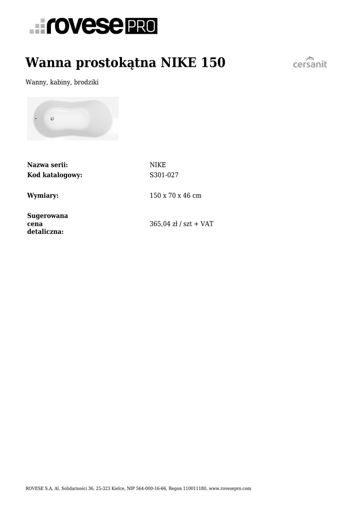 Wanna prostokątna NIKE 150 Wanny, kabiny, brodziki Nazwa serii: NIKE Kod katalogowy: S301-027 Wymiary: 150 x 70 x 46 cm Sugerowana cena detaliczna: 365,04 zł / szt + VAT ROVESE S.A. Al. Solidarności 36, 25-323 Kielce, NIP 564-000-16-66, Regon 110011180, www.rovesepro.com