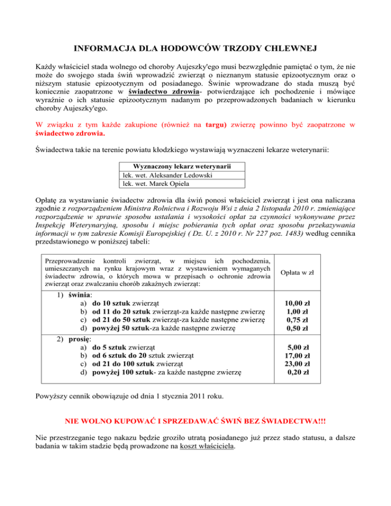 INFORMACJA DLA HODOWCÓW TRZODY CHLEWNEJ Każdy właściciel stada wolnego od choroby Aujeszky'ego musi bezwzględnie pamiętać o tym, że nie może do swojego stada świń wprowadzić zwierząt o nieznanym statusie epizootycznym oraz o niższym statusie epizootycznym od posiadanego. Świnie wprowadzane do stada muszą być koniecznie zaopatrzone w świadectwo zdrowia- potwierdzające ich pochodzenie i mówiące wyraźnie o ich statusie epizootycznym nadanym po przeprowadzonych badaniach w kierunku choroby Aujeszky'ego. W związku z tym każde zakupione (również na targu) zwierzę powinno być zaopatrzone w świadectwo zdrowia. Świadectwa takie na terenie powiatu kłodzkiego wystawiają wyznaczeni lekarze weterynarii: Wyznaczony lekarz weterynarii lek. wet. Aleksander Ledowski lek. wet. Marek Opiela Opłatę za wystawianie świadectw zdrowia dla świń ponosi właściciel zwierząt i jest ona naliczana zgodnie z rozporządzeniem Ministra Rolnictwa i Rozwoju Wsi z dnia 2 listopada 2010 r. zmieniające rozporządzenie w sprawie sposobu ustalania i wysokości opłat za czynności wykonywane przez Inspekcję Weterynaryjną, sposobu i miejsc pobierania tych opłat oraz sposobu przekazywania informacji w tym zakresie Komisji Europejskiej ( Dz. U. z 2010 r. Nr 227 poz. 1483) według cennika przedstawionego w poniższej tabeli: Przeprowadzenie kontroli zwierząt, w miejscu ich pochodzenia, umieszczanych na rynku krajowym wraz z wystawieniem wymaganych świadectw zdrowia, o których mowa w przepisach o ochronie zdrowia zwierząt oraz zwalczaniu chorób zakaźnych zwierząt: Opłata w zł 1) świnia: a) do 10 sztuk zwierząt b) od 11 do 20 sztuk zwierząt-za każde następne zwierzę c) od 21 do 50 sztuk zwierząt-za każde następne zwierzę d) powyżej 50 sztuk-za każde następne zwierzę 10,00 zł 1,00 zł 0,75 zł 0,50 zł 2) prosię: a) do 5 sztuk zwierząt b) od 6 sztuk do 20 sztuk zwierząt c) od 21 do 100 sztuk zwierząt d) powyżej 100 sztuk- za każde następne zwierzę 5,00 zł 17,00 zł 23,00 zł 0,20 zł Powyższy cennik obowiązuje od dnia 1 stycznia 2011 roku. NIE WOLNO KUPOWAĆ I SPRZEDAWAĆ ŚWIŃ BEZ ŚWIADECTWA!!! Nie przestrzeganie tego nakazu będzie groziło utratą posiadanego już przez stado statusu, a dalsze badania w takim stadzie będą prowadzone na koszt właściciela. Decyzje Powiatowego Lekarza Weterynarii w Kłodzku o nadanym statusie stada oraz ich kserokopie są jedynie potwierdzeniem faktu, iż stado jest objęte programem zwalczania choroby Aujeszky’ego u świń, nie zastępują jednak świadectwa zdrowia. Gdy masz już stado o statusie wolnym - możesz wprowadzać do niego tylko świnie o równorzędnym lub wyższym statusie ( wolnym lub urzędowo wolnym). Nie dopuszcza się wprowadzania świń do stada o statusie niższym niż status posiadany!!! Gdy chcesz utworzyć nowe stado świń możesz je utworzyć tylko ze świń pochodzących ze stada wolnego lub urzędowo wolnego, koniecznie musisz posiadać świadectwo zdrowia dla nowo wprowadzonych świń, będące potwierdzeniem statusu. Ze świadectwem tym należy się zgłosić do PLW w Oleśnicy celem nadania statusu stadu i objęcia go monitoringiem. Ponadto jesteś zobowiązany do zarejestrowania nowoutworzonego stada w biurze powiatowym Agencji Restrukturyzacji i Modernizacji Rolnictwa. Przypomina się jednocześnie, że obowiązkiem hodowcy, oprócz prowadzenia księgi rejestracji stada (wraz z aktualnymi wpisami), jest trwałe i indywidualne oznakowanie trzody chlewnej (tatuaż lub kolczyki wraz z dodaną kolejną cyfrą dla danej lochy lub knura w stadzie celem przyporządkowania próbki krwi danej sztuce). Konsekwencją braku oznakowania loch i knurów w stadzie, w którym zostanie stwierdzony wynik dodatni jest ubój całego stada podstawowego bez prawa do odszkodowania.