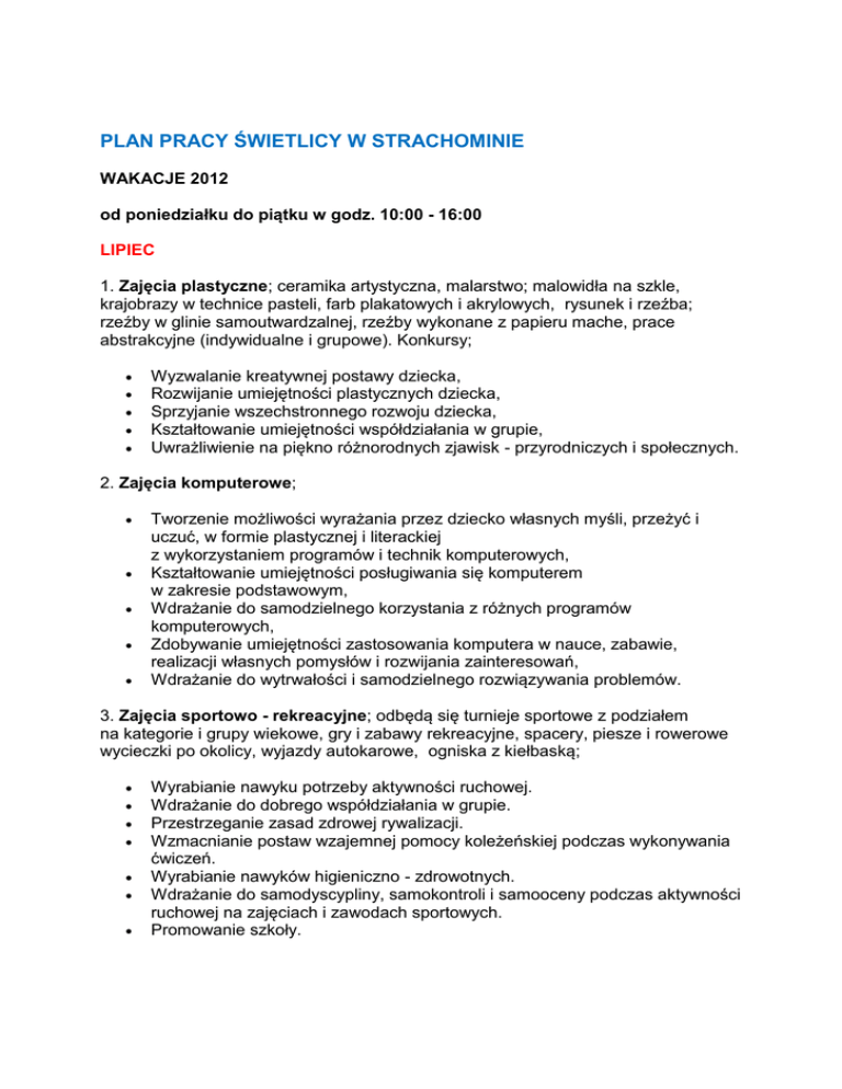 PLAN PRACY ŚWIETLICY W STRACHOMINIE WAKACJE 2012 od poniedziałku do piątku w godz. 10:00 - 16:00 LIPIEC 1. Zajęcia plastyczne; ceramika artystyczna, malarstwo; malowidła na szkle, krajobrazy w technice pasteli, farb plakatowych i akrylowych, rysunek i rzeźba; rzeźby w glinie samoutwardzalnej, rzeźby wykonane z papieru mache, prace abstrakcyjne (indywidualne i grupowe). Konkursy; Wyzwalanie kreatywnej postawy dziecka, Rozwijanie umiejętności plastycznych dziecka, Sprzyjanie wszechstronnego rozwoju dziecka, Kształtowanie umiejętności współdziałania w grupie, Uwrażliwienie na piękno różnorodnych zjawisk - przyrodniczych i społecznych. 2. Zajęcia komputerowe; Tworzenie możliwości wyrażania przez dziecko własnych myśli, przeżyć i uczuć, w formie plastycznej i literackiej z wykorzystaniem programów i technik komputerowych, Kształtowanie umiejętności posługiwania się komputerem w zakresie podstawowym, Wdrażanie do samodzielnego korzystania z różnych programów komputerowych, Zdobywanie umiejętności zastosowania komputera w nauce, zabawie, realizacji własnych pomysłów i rozwijania zainteresowań, Wdrażanie do wytrwałości i samodzielnego rozwiązywania problemów. 3. Zajęcia sportowo - rekreacyjne; odbędą się turnieje sportowe z podziałem na kategorie i grupy wiekowe, gry i zabawy rekreacyjne, spacery, piesze i rowerowe wycieczki po okolicy, wyjazdy autokarowe, ogniska z kiełbaską; Wyrabianie nawyku potrzeby aktywności ruchowej. Wdrażanie do dobrego współdziałania w grupie. Przestrzeganie zasad zdrowej rywalizacji. Wzmacnianie postaw wzajemnej pomocy koleżeńskiej podczas wykonywania ćwiczeń. Wyrabianie nawyków higieniczno - zdrowotnych. Wdrażanie do samodyscypliny, samokontroli i samooceny podczas aktywności ruchowej na zajęciach i zawodach sportowych. Promowanie szkoły. 4. Zajęcia socjoterapeutyczne - profilaktyka uzależnień; zajęcia odbywać się będą w formach; Burza mózgów - sprzyja rozwojowi twórczego myślenia, Pogadanka - pozwala na odwołanie się do doświadczeń i wiedzy dzieci, Miniwykład - przeprowadzany w celu przybliżenia dzieciom wiedzy z zakresu podejmowanych zagadnień, Psychodrama, scenki - pozwalają dzieciom na „przepracowanie" własnych zachowań w trudnych sytuacjach, znalezienie rozwiązań, ale w bezpiecznych warunkach, Pantomima - uczy wyrażania myśli, słów ruchem ciała, gestem, Prace plastyczne, techniczne - umożliwiają dzieciom niewerbalne wyrażanie siebie, Wizualizacja - służy przypomnieniu wydarzeń z przeszłości, uczy pozytywnego myślenia, Zabawy - poprawiają nastrój, integrują, aktywizują dzieci bądź pomagają im rozładować napięcie uwarunkowane stresem, Praca indywidualna - sprzyja autorefleksji, Praca z tekstem - pozwala na omówienie zagadnień problemowych na podstawie przykładów, 5. Zajęcia kulinarne; dzieci uczestniczą w przygotowaniu i degustacji potraw; Doskonalenie umiejętności bezpiecznego posługiwania się sprzętem AGD ułatwiającym pracę w kuchni oraz poznanie jego wszechstronnego zastosowania, Nauczenie się komponowania codziennego jadłospisu oraz doboru przykładowego menu na odświętne okazje z wykorzystaniem pełnowartościowych produktów, Poznanie zasad zdrowego odżywiania i jego znaczenia dla rozwijającego się organizmu, Doskonalenie umiejętności samodzielnego przygotowywania śniadań i kolacji, Nauka pieczenia prostych ciast, ciasteczek oraz przyrządzania innych deserów, Zdobywanie umiejętności gotowania prostych dań obiadowych, przygotowywania sałatek i surówek, Uczenie się sporządzania listy zakupów artykułów spożywczych niezbędnych w kuchni na bieżąco oraz potrzebnych na zaplanowane potrawy. WYJAZDY ŚWIETLICA STRACHOMINO - LIPIEC 4.07.2012 r. - BASEN USTRONIE MORSKIE 12zł/2godz. 5.07.2012 r. - DYSKOTEKA W TYMIENIU godz. 17:00 6.07.2012 r. - MULTIKINO KOSZALIN „EPOKA LODOWCOWA" 3D - 16zł (dzieci młodsze) „SPIDERMAN" (dzieci starsze) 10.07.2012 r. - CZŁUCHÓW - MINIZOO 18.07.2012 r. - WYJAZD DO DOBRZYCY (boisko) - zabawy rekreacyjno - sportowe, ognisko z kiełbaską 24.07.2012 r. - SIERAKOWO SŁAWIEŃSKIE - WIOSKA HOBBITÓW 27.07.2012 r. - PARK LINOWY - KOSZALIN - ok. 20zł Bliższe informacje pod numerem tel. 609281353.