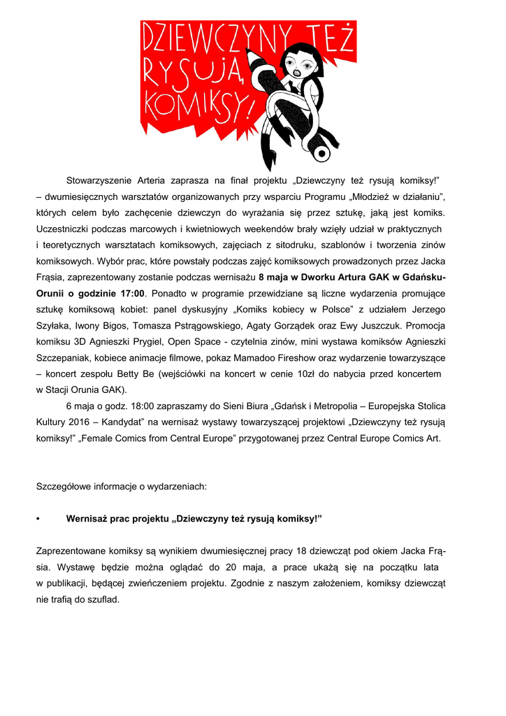 Stowarzyszenie Arteria zaprasza na finał projektu „Dziewczyny też rysują komiksy!” – dwumiesięcznych warsztatów organizowanych przy wsparciu Programu „Młodzież w działaniu”, których celem było zachęcenie dziewczyn do wyrażania się przez sztukę, jaką jest komiks. Uczestniczki podczas marcowych i kwietniowych weekendów brały wzięły udział w praktycznych i teoretycznych warsztatach komiksowych, zajęciach z sitodruku, szablonów i tworzenia zinów komiksowych. Wybór prac, które powstały podczas zajęć komiksowych prowadzonych przez Jacka Frąsia, zaprezentowany zostanie podczas wernisażu 8 maja w Dworku Artura GAK w GdańskuOrunii o godzinie 17:00. Ponadto w programie przewidziane są liczne wydarzenia promujące sztukę komiksową kobiet: panel dyskusyjny „Komiks kobiecy w Polsce” z udziałem Jerzego Szyłaka, Iwony Bigos, Tomasza Pstrągowskiego, Agaty Gorządek oraz Ewy Juszczuk. Promocja komiksu 3D Agnieszki Prygiel, Open Space - czytelnia zinów, mini wystawa komiksów Agnieszki Szczepaniak, kobiece animacje filmowe, pokaz Mamadoo Fireshow oraz wydarzenie towarzyszące – koncert zespołu Betty Be (wejściówki na koncert w cenie 10zł do nabycia przed koncertem w Stacji Orunia GAK). 6 maja o godz. 18:00 zapraszamy do Sieni Biura „Gdańsk i Metropolia – Europejska Stolica Kultury 2016 – Kandydat” na wernisaż wystawy towarzyszącej projektowi „Dziewczyny też rysują komiksy!” „Female Comics from Central Europe” przygotowanej przez Central Europe Comics Art. Szczegółowe informacje o wydarzeniach: • Wernisaż prac projektu „Dziewczyny też rysują komiksy!” Zaprezentowane komiksy są wynikiem dwumiesięcznej pracy 18 dziewcząt pod okiem Jacka Frąsia. Wystawę będzie można oglądać do 20 maja, a prace ukażą się na początku lata w publikacji, będącej zwieńczeniem projektu. Zgodnie z naszym założeniem, komiksy dziewcząt nie trafią do szuflad. • Panel dyskusyjny „Komiks kobiecy w Polsce”, Prowadzenie: Anna Miler Udział biorą: Prof UG Dr hab. Jerzy Szyłak Autor licznych artykułów i książek o historii i teorii komiksu (między innymi: Komiks: świat przerysowany, Zgwałcone oczy, Komiks i okolice pornografii) i kilku innych – praca magisterska, doktorska jak i habilitacja na temat komiksu. Absolwent i pracownik naukowy UG. Pracuje też w Instytucie Pedagogiczno-Językowym Państwowej Wyższej Szkoły Zawodowej w Elblągu. Scenarzysta komiksowy: Alicja (według Lewisa Carrolla; rys. Sławomir Jezierski), Obywatel w palącej potrzebie i Obywatele w miłosnych uściskach (rys. Jacek Michalski), Szminka (rys. Joanna Karpowicz), Benek Dampc i trup sąsiada (rys. Robert Służały). Ma w komiksowym dorobku także scenariusze do krótkich komiksów publikowanych w najrozmaitszych pismach oraz kilka samodzielnie narysowanych historyjek. Iwona Bigos Iwona Bigos - Dyrektorka Gdańskiej Galerii Miejskiej, kuratorka sztuki. Współorganizatorka wystawy "Komiksy po polsku. Prezentacja polskiej sceny komiksowej. Comics nach polnischer Art. Präsentation der Comicszene aus Polen", która odbyła się w Bremie. Współzałożycielka Stowarzyszenia agitPolska. Polsko-Niemieckiej Inicjatywy Kooperacji Kulturalnych. Tomasz Pstrągowski Doktorant Uniwersytetu Gdańskiego (bada tematykę komiksów autobiograficznych), redaktor serwisu Komiksomania.pl, współpracownik serwisów ksiazki.wp.pl, film.wp.pl, aleseriale.pl i gry.wp.pl, współtwórca podcastu „Nieczyste zagrywki”, laureat konkursu „Dziennika Gazety Prawnej” na pamiętnik Matki Polki pracującej. Ewa Juszczuk Studentka ASP, rysowniczka, publikowała do tej pory w magazynach „JEJU” oraz „Karton”; http://evajus.blogspot.com/. Agata Gorządek Rysowniczka, twórczyni filmów animowanych, absolwentka PWSFTv w Łodzi; http://weegee.digart.pl/. • Open Space: Czytelnia zinów – zbiory polskich i zagranicznych zinów kobiecych z kolekcji revenge of the nerds/J.Tomiak Filmy animowane kobiet – Agata Gorządek, Maja Demska, Zumba Stein, Julia Skupny, Agnieszka Prygiel • Wystawa prac Agnieszki Szczepaniak, http://www.paplalala.digart.pl/ Promocja komiksu 3D Agnieszki Prygiel Wydany przy wsparciu projektu CENTRALA Central Europe Comics Art komiks Agnieszki Prygiel O ludku w wiecznością zamiast głowy i inne opowieści zawiera refleksyjne opowieści autorki rysowane w latach 2002-2009. Porusza tematy poszukiwania prawdziwej miłości oraz swojego miejsca w życiu a operuje przy tym specyficznym humorem. Komiks został wykonany w technice anaglifowej 3D umożliwiającej oglądanie trójwymiarowego efektu za pomocą okularów z czerwonym i niebieskim filtrem. • Pokaz Mamadoo Fireshow Mamadoo Fireshow - połączone alternatywną i radosną chęcią pokazania figlarnej i kobiecej natury fireshow od pięciu lat tworzą pokazy tryskające kolorami oraz rozkosznym dla oczu kiczem. Fireshow Mamadoo przedstawia inną stronę ognia - ognia jako źródła zabawy i radości, a także pretekstu do humorystycznych scenek taneczno-pantomimicznych. Poza działalnością artystyczną, członkinie grupy ożywiają trójmiejską przestrzeń kulturalną przez organizację takich wydarzeń jak KuglART FEST czy Festiwal Rytmu i Ognia FROG. http://www.mamadoo.pl • Koncert Betty Be (Indie / Alternatywna / Punk) Kiedy zespół Los Trabantos rozpadł się, każda z dziewczyn pogrążyła się w swoim własnym piekle. Lady Graża (gitara, voc) szukała ratunku w ramionach kolejnych wpływowych mężczyzn, lecz związki te nie przynosiły jej ukojenia. Ula de Luxe (bas) zostawiła w stołecznych barach szlak rozbitych szklanek do wódce i krwi wszystkich tych, którzy ośmielili się stanąć na jej drodze. Bejonz (sax, voc) zatrudniła się jako diva śpiewająca tandetne przeboje w barze dla wykolejeńców. Kiedy dziewczyny spotkały się po raz kolejny, zrozumiały, że dalej tak być nie może. Oczy rzucały złowrogie spojrzenia, dłonie same zaciskały się w pięś