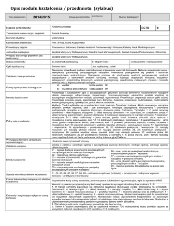 Opis modułu kształcenia / przedmiotu (sylabus) Rok akademicki: Grupa przedmiotów: 2014/2015 Nazwa przedmiotu: podstawowe Anatomia zwierząt Numer katalogowy: ECTS 8 Tłumaczenie nazwy na jęz. angielski: Animal Anatomy Kierunek studiów: weterynaria Koordynator przedmiotu: Prof. dr hab. Marta Kupczyńska Prowadzący zajęcia: Pracownicy i doktoranci Zakładu Anatomii Porównawczej i Klinicznej Katedry Nauk Morfologicznych Jednostka realizująca: Wydział Medycyny Weterynaryjnej, Katedra Nauk Morfologicznych, Zakład Anatomii Porównawczej i Klinicznej Wydział, dla którego przedmiot jest realizowany: Wydział Medycyny Weterynaryjnej Status przedmiotu: a) przedmiot podstawowy b) stopień I rok 1 Cykl dydaktyczny: Semestr letni Jęz. wykładowy: polski Założenia i cele przedmiotu: Formy dydaktyczne, liczba godzin: Metody dydaktyczne: Pełny opis przedmiotu: Wymagania formalne (przedmioty wprowadzające): Założenia wstępne: Efekty kształcenia: Sposób weryfikacji efektów kształcenia: c) stacjonarne i niestacjonarne Nauczenie prawidłowej budowy makroskopowej organizmów zwierząt domowych. Nabycie umiejętności opisu i identyfikacji gatunkowej poszczególnych narządów. Prawidłowe posługiwanie się polskim i łacińskim mianownictwem anatomicznym. Stworzenie podstaw do studiowania anatomii porównawczej, anatomii topograficznej z elementami anatomii klinicznej, histologii, fizjologii, diagnostyki klinicznej, wszystkich zabiegowych przedmiotów klinicznych, anatomii patologicznej, przedmiotów związanych chowem i hodowlą zwierząt oraz z higieną zwierząt rzeźnych. a) wykład liczba godzin 30 b) ćwiczenia prosektoryjne liczba godzin 60 Prezentacja i szczegółowy opis u poszczególnych gatunków zwierząt domowych wyizolowanych narządów układu nerwowego, oddechowego, trawiennego, moczowo-płciowego, elementów powłoki wspólnej ze szczególnym uwzględnieniem narządu palcowego, egzenteracje. Prezentacja i preparacja struktur gałki ocznej. Prezentacja szkieletu ptaka, egzenteracja kury domowej. Autorskie prezentacje multimedialne, multimedialne komercyjne programy dydaktyczne, praca własna studentów. Wykłady. Treści wykładów są uzupełnieniem treści ćwiczeń. Tematyka: budowa układu nerwowego, narządów zmysłów, powłoki wspólnej, błon i jam surowiczych. Artrologia szczegółowa. Unaczynienie i unerwienie ważniejszych narządów w aspekcie klinicznym. Anatomia ptaka. Ćwiczenia. Tematyka: 1, 2: układ nerwowy ośrodkowy – rdzeń kręgowy, mózgowie; 3: układ nerwowy obwodowy – nn. rdzeniowe, nn. czaszkowe, zwoje; 4: układ nerwowy autonomiczny, gruczoły dokrewne; 5: kolokwium teoretyczne; 6: narządy zmysłów; 7: kolokwium teoretyczne; 8-11: układ oddechowy – jama nosowa, gardło, krtań, tchawica, oskrzela, płuca, opłucna – mięsożerne, świnia, przeżuwacze, koń; 12, 13: kolokwium praktyczne i teoretyczne; 14: aparat trawienny – jama ustna, gardło – mięsożerne, świnia, przeżuwacze, koń; 15: przewód pokarmowy, wątroba, trzustka, otrzewna – mięsożerne, koń; 16: przewód pokarmowy, wątroba, trzustka, otrzewna – przeżuwacze, świnia; 17: egzenteracja – mięsożerne; 18: egzenteracja – przeżuwacze; 19, 20: kolokwium praktyczne i teoretyczne; 21: narządy moczowe; 22: narządy płciowe męskie; 23: narządy płciowe żeńskie; 24, 25: kolokwium praktyczne i teoretyczne; 26: powłoka wspólna: włosy, opuszki, sutki, rogi, narządy palcowe; 27: anatomia ptaka; 28: kolokwium teoretyczne; 29-30: powtórzenie materiału z semestru I i II, praca własna. Daty i tematy realizacji poszczególnych ćwiczeń będą podane na tablicy informacyjnej Zakładu. Anatomia zwierząt semestr zimowy wiedza z zakresu: osteologii ogólnej i szczegółowej zwierząt domowych, miologii ogólnej, artrologii ogólnej, układu krążenia 01 – opisuje budowę anatomiczną poszczególnych 06 – zna i umie się posługiwać anatomicznym narządów gatunków zwierząt domowych mianownictwem polskim i łacińskim 02 – rozpoznaje różnice gatunkowe 07 – rozumie znaczenie poszczególnych struktur i 03 – rozumie różnorodność morfologiczną gatunków narządów w praktyce klinicznej zwierząt domowych 08 – umie określić ogólną przydatność funkcjonalną 04 – rozumie związki morfologiczne narządów poszczególnych struktur i narządów tworzących układ 09 – rozumie potrzeby dokształcania się przez całe 05 – zna powiązania morfologiczne pomiędzy życie poszczególnymi układami narządów 01, 02, 03, 04, 05, 06, 07, 08, 09 – zaliczenia cząstkowe (kolokwia) – teoretyczne i praktyczne; egzamin końcowy – praktyczny i teoretyczny Forma dokumentacji osiągniętych efektów Indywidualne karty oceny studentów, pisemne prace kolokwialne i egzaminacyjne, wpis do systemu eHMS kształcenia: Warunki uzyskania pozytywnej oceny końcowej: spełnienie wymagań określonych w punktach 1 - 8 1. W trakcie semestru przewiduje się zaliczenia cząstkowe obejmujące wiedzę przekazaną na wykładach i ćwiczeniach: a) teoretycznych: 1 – układ nerwowy, 2 – narządy zmysłów, 3 – układ oddechowy; 4 – aparat trawienny; 5 – aparat moczowo-płciowy; 6 – powłoka wspólna; 7 – anatomia ptaków oraz b) praktycznych: 1 – układ oddechowy; 2 – aparat trawienny; 3 – aparat moczowo-płciowy. Student zobowiązany jest do uczestnictwa Elementy i wagi mające wpływ na ocenę we wszystkich zaliczeniach cząstkowych. Nieobecność należy usprawiedliwić bezpośrednio po zaistniałym końcową: wypadku losowym lub maksymalnie tydzień od ostatniego dnia obejmującego zwolnienie lekarskie. Studentom z usprawiedliwioną nieobecnością zostanie wyznaczony osobny termin zaliczenia. 2. Dla każdego zaliczenia cząstkowego przewiduje się dwa terminy. 3. Termin I: student zobowiązany jest do uzyskania minimum 70% maksymalnej liczby punktów, łącznie ze wszystkich zaliczeń cząstkowych (217 punktów z 310 możliwych). 4