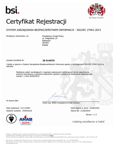Certyfikat Rejestracji SYSTEM ZARZĄDZANIA BEZPIECZEŃSTWEM INFORMACJI - ISO/IEC 27001:2013 Niniejszym stwierdzam, że: Powiatowy Urząd Pracy ul. Pośpiecha 14 Katowice 40-852 Polska Uzyskał Certyfikat Nr: IS 514575 i działa w oparciu o System Zarządzania Bezpieczeństwem Informacji zgodny z wymaganiami ISO/IEC 27001:2013 w zakresie: Realizacja zadań wynikających z regulacji ustawowych odnoszących się do ograniczenia poziomu bezrobocia w powiecie katowickim zgodnie z Deklaracją Stosowania Zabezpieczeń, wersja 1 z dnia 26/06/2015. W imieniu BSI: Frank Lee, EMEA Compliance & Risk Director Data rejestracji: 21/11/2007 Data wejścia w życie: 22/09/2016 Ostatnie wydanie: 19/09/2016 Ważny do: 21/09/2019 Strona: 1 z 2 Niniejszy certyfikat został wystawiony elektronicznie. Jest własnością BSI i podlega warunkom kontraktu. Autentyczność certyfikatu elektronicznego może zostać potwierdzona online. Wersje drukowane certyfikatu mogą zostać zweryfikowane na www.bsi-global.com/ClientDirectory bądź pod numerem telefonu +48 22 330 61 90. Informacje i kontakt: BSI, Kitemark Court, Davy Avenue, Knowlhill, Milton Keynes MK5 8PP. Tel: +44 345 080 9000 BSI Assurance UK Limited, zarejestrowana w Anglii pod numerem 7805321 przy 39 Chiswick High Road, Londyn W4 4AL, Wielka Brytania. Członek BSI Group. Certyfikat Nr: IS 514575 Lokalizacja Działania objęte certyfikacją Powiatowy Urząd Pracy ul. Pośpiecha 14 Katowice 40-852 Polska Realizacja zadań wynikających z regulacji ustawowych odnoszących się do ograniczenia poziomu bezrobocia w powiecie katowickim. Data rejestracji: 21/11/2007 Data wejścia w życie: 22/09/2016 Ostatnie wydanie: 19/09/2016 Ważny do: 21/09/2019 Strona: 2 z 2 Niniejszy certyfikat odnosi się do systemu zarządzania bezpieczeństwem informacji, a nie do produktów lub usług organizacji certyfikowanej. Numer certyfikatu, symbol jednostki certyfikującej i/lub symbol akredytacji nie mogą być stosowane na produktach ani na dokumentach nawiązujących do produktów i/lub usług oferowanych przez organizację certyfikowaną. Materiały promocyjne, reklamowe, ogłoszenia bądź inne dokumenty prezentujące lub nawiązujące do certyfikatu, do symbolu jednostki certyfikującej lub do symbolu akredytacji, muszą być zgodne z przeznaczeniem certyfikatu. Certyfikat jako taki nie zwalnia organizacji z obowiązku przestrzegania wymagań prawnych. Niniejszy certyfikat został wystawiony elektronicznie. Jest własnością BSI i podlega warunkom kontraktu. Autentyczność certyfikatu elektronicznego może zostać potwierdzona online. Wersje drukowane certyfikatu mogą zostać zweryfikowane na www.bsi-global.com/ClientDirectory bądź pod numerem telefonu +48 22 330 61 90. Informacje i kontakt: BSI, Kitemark Court, Davy Avenue, Knowlhill, Milton Keynes MK5 8PP. Tel: +44 345 080 9000 BSI Assurance UK Limited, zarejestrowana w Anglii pod numerem 7805321 przy 39 Chiswick High Road, Londyn W4 4AL, Wielka Brytania. Członek BSI Group.