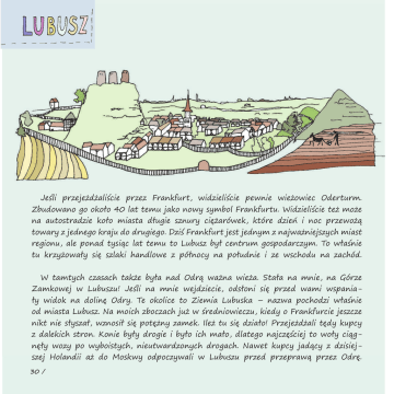 Jeśli przejeżdżaliście przez Frankfurt, widzieliście pewnie wieżowiec Oderturm. Zbudowano go około 40 lat temu jako nowy symbol Frankfurtu. Widzieliście też może na autostradzie koło miasta długie sznury ciężarówek, które dzień i noc przewożą towary z jednego kraju do drugiego. Dziś Frankfurt jest jednym z najważniejszych miast regionu, ale ponad tysiąc lat temu to Lubusz był centrum gospodarczym. To właśnie tu krzyżowały się szlaki handlowe z północy na południe i ze wschodu na zachód. W tamtych czasach także była nad Odrą ważna wieża. Stała na mnie, na Górze Zamkowej w Lubuszu! Jeśli na mnie wejdziecie, odsłoni się przed wami wspaniały widok na dolinę Odry. Te okolice to Ziemia Lubuska – nazwa pochodzi właśnie od miasta Lubusz. Na moich zboczach już w średniowieczu, kiedy o Frankfurcie jeszcze nikt nie słyszał, wznosił się potężny zamek. Ileż tu się działo! Przejeżdżali tędy kupcy z dalekich stron. Konie były drogie i było ich mało, dlatego najczęściej to woły ciągnęły wozy po wyboistych, nieutwardzonych drogach. Nawet kupcy jadący z dzisiejszej Holandii aż do Moskwy odpoczywali w Lubuszu przed przeprawą przez Odrę. 30 / Taka podróż była niebezpieczna. Nie istniały dokładne reguły poruszania się po drogach ani policja, która dbałaby o przestrzeganie prawa i porządku. Jeżeli w drodze złamała się oś wozu, trzeba ją było samemu naprawić. Kupcy często byli napadani i okradani przez bandy rozbójników. Jeszcze dzisiaj wzdłuż dawnych szlaków handlowych można znaleźć stare monety ukryte przez kupców obawiających się rabunku. Bezpiecznie było tylko w lubuskim zamku. Tutaj podróżni mogli zaopatrzyć się w żywność, a wozy oddać do gruntownej naprawy. Ważne drogi handlowe krzyżowały się właśnie tutaj, ponieważ w Lubuszu stosunkowo łatwo było przejechać przez Odrę. Mostu wprawdzie nigdy nie zbudowano, ale poziom wody był dość niski, a rzeka niezbyt szeroka. Rybacy dobrze znający okolicę mogli pokazać przejezdnym wygodny bród i pomóc się prze- prawić. Lecz możecie mi wierzyć, i tak wszyscy mieli mokre nogi, a niektóre wozy trzeba było na drugim brzegu znowu naprawiać. Za to zimą podróżnym było wygodnie! Gdy lód był dostatecznie gruby, mogli szybko przemierzyć rzekę. Ponieważ Lubusz przez wiele stuleci był ważnym punktem na szlaku handlowym, często toczono o niego walki. Różni władcy chcieli być panami tutejszego zamku. Stopniowo miasto traciło jednak na znaczeniu, ponieważ z powodu ocieplenia klimatu zmieniła się i Odra. Tak, tak, nie tylko teraz robi się w Europie coraz cieplej! Wtedy też podwyższał się poziom wody w Odrze. Bród na rzece był coraz trudniejszy do pokonania, bo tereny wokół głównego nurtu zalewała woda. W pewnym momencie okazało się, że Odrę łatwiej przejść tam, gdzie dziś leży Frankfurt – właśnie między innymi dlatego założono tam miasto. Z lubuskiego zamku nic nie zostało, ale na Górze Zamkowej zbudowano murki przypominające kontury niektórych jego części. Po murkach można biegać, a ze zboczy góry podziwiać piękną okolicę. / 31 30 / W Lubuszu mieszka siedmiu drewnianych krasnoludków. Znajdź ich i jednego narysuj! Szukaj przy placu zabaw! Kiedyś część miasteczka leżała też po drugiej stronie Odry. Można tam było szybko dopłynąć promem. Teraz, żeby dostać się na drugi brzeg – na przykład do leżącej niedaleko wsi Nowy Lubusz – trzeba pokonać około 20 kilometrów. Dowiedz się, gdzie znajduje się najbliższy most na Odrze. Na terenie kościoła w Lubuszu, między budynkiem świątyni a salą spotkań, znajduje się mały dziedziniec. Dowiedz się, co było na jego miejscu do 1945 roku. Budynek muzeum regionalnego w Lubuszu ma już ponad 200 lat! Znajdź go, a potem pokoloruj rysunek. / 33