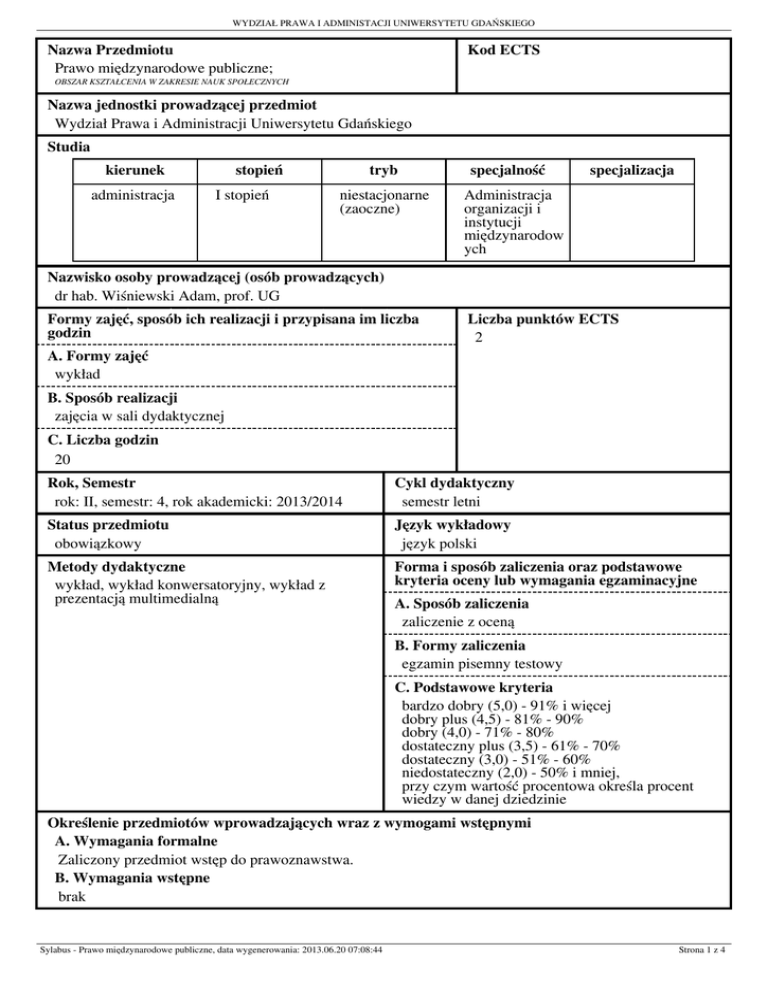 WYDZIAŁ PRAWA I ADMINISTACJI UNIWERSYTETU GDAŃSKIEGO Nazwa Przedmiotu Prawo Prawo międzynarodowe międzynarodowe publiczne; publiczne; Kod ECTS OBSZAR KSZTAŁCENIA W ZAKRESIE NAUK SPOŁECZNYCH Nazwa jednostki prowadzącej przedmiot Wydział Prawa i Administracji Uniwersytetu Gdańskiego Studia kierunek administracja administracja stopień II stopień stopień tryb niestacjonarne (zaoczne) niestacjonarne (zaoczne) Nazwisko osoby prowadzącej (osób prowadzących) dr hab. Wiśniewski Adam, prof. UG Formy godzin Formy zajęć, zajęć, sposób sposób ich ich realizacji realizacji ii przypisana przypisana im im liczba liczba godzin A. Formy zajęć wykład wykład specjalność Administracja organizacji i Administracja instytucji międzynarodow ych organizacji i instytucji międzynarodow ych specjalizacja Liczba punktów ECTS 2 B. Sposób realizacji zajęcia zajęcia w w sali sali dydaktycznej dydaktycznej C. Liczba godzin 20 20 Rok, Semestr rok: II, semestr: 4, rok akademicki: 2013/2014 Cykl dydaktyczny semestr letni Status przedmiotu obowiązkowy Język wykładowy język polski Metody dydaktyczne wykład, wykład konwersatoryjny, wykład z prezentacją multimedialną Forma i sposób zaliczenia oraz podstawowe kryteria oceny lub wymagania egzaminacyjne A. Sposób zaliczenia zaliczenie z oceną B. Formy zaliczenia egzamin pisemny testowy C. Podstawowe kryteria bardzo dobry (5,0) - 91% i więcej dobry plus (4,5) - 81% - 90% dobry (4,0) - 71% - 80% dostateczny plus (3,5) - 61% - 70% dostateczny (3,0) - 51% - 60% niedostateczny (2,0) - 50% i mniej, przy czym wartość procentowa określa procent wiedzy w danej dziedzinie Określenie przedmiotów wprowadzających wraz z wymogami wstępnymi A. Wymagania formalne Zaliczony przedmiot wstęp do prawoznawstwa. B. Wymagania wstępne brak Sylabus - Prawo międzynarodowe publiczne, data wygenerowania: 2013.06.20 07:08:44 Strona 1 z 4 WYDZIAŁ PRAWA I ADMINISTACJI UNIWERSYTETU GDAŃSKIEGO Cele przedmiotu Celem przedmiotu jest przekazanie studentom wiedzy z zakresu ogólnego prawa międzynarodowego publicznego. Studenci zostaną zapoznani z podstawowymi zasadami, pojęciami, instytucjami, trendami oraz specyfiką i istotą prawa międzynarodowego. Przedstawione zostaną: związki między prawem międzynarodowym publicznym a prawem krajowym, pozycja i znaczenie prawa międzynarodowego w krajowym porządku prawnym, sankcje, umowy międzynarodowe i inne źródła prawa międzynarodowego, a także zagadnienia z zakresu poszczególnych działów tej gałęzi prawa (prawa człowieka, prawo morza, prawo dyplomatyczne i konsularne, międzynarodowe prawo karne itp.). Studenci zostaną zapoznani z najważniejszymi orzeczeniami sądów międzynarodowych oraz przygotowani do samodzielnego posługiwania się i stosowania norm prawa międzynarodowego. Sylabus - Prawo międzynarodowe publiczne, data wygenerowania: 2013.06.20 07:08:44 Strona 2 z 4 WYDZIAŁ PRAWA I ADMINISTACJI UNIWERSYTETU GDAŃSKIEGO Treści programowe 1. Pojęcie i istota prawa międzynarodowego oraz stosunków międzynarodowych, skład i cechy społeczności międzynarodowej (problematyka definiowania prawa międzynarodowego, historia prawa międzynarodowego, cechy prawa międzynarodowego jako gałęzi prawa, prawo międzynarodowe publiczne a prawo europejskie, podstawy obowiązywania prawa międzynarodowego, rodzaje sankcji w prawie międzynarodowym, użycie siły w prawie międzynarodowym, zasady prawa międzynarodowego, rodzaje norm prawa międzynarodowego, czynniki wpływające na przestrzegania prawa międzynarodowego, pojęcie i skład społeczności międzynarodowego, cechy charakterystyczne społeczności międzynarodowej, tendencje rozwojowe współczesnego prawa międzynarodowego); 2. Prawo międzynarodowe a prawo wewnętrzne (podstawowe rodzaje koncepcji tłumaczących stosunek pomiędzy prawem międzynarodowym a prawem wewnętrznym, metody zapewniania skuteczności prawu międzynarodowemu w systemie prawa krajowego i ich podziały, znaczenie zasady pacta sunt servanda, pozycja prawa międzynarodowego w porządku prawnym RP); 3. Źródła prawa międzynarodowego (pojęcie, rodzaje źródeł prawa międzynarodowego oraz ich cechy,3.2. zagadnienie hierarchii norm prawa międzynarodowego, umowy międzynarodowe, pojęcie, rodzaje i cechy umów międzynarodowych jako źródła prawa, procedura zawierania umów międzynarodowych, zakres mocy obowiązującej umów międzynarodowych, nieważność umowy międzynarodowej, wygaśniecie umowy międzynarodowej, procedura postępowania w przypadkach nieważności i wygaśnięcia umowy międzynarodowej, zastrzeżenia do umów międzynarodowych, przystąpienie do umowy międzynarodowej, interpretacja umów międzynarodowych, sukcesja państw w odniesieniu do umów międzynarodowych, zwyczaj międzynarodowy, ogólne zasady prawa jako źródło prawa międzynarodowego, uchwały organizacji międzynarodowych, akty jednostronne); 4. Podmioty prawa międzynarodowego (rodzaje podmiotów prawa międzynarodowego, atrybuty podmiotowości w prawie międzynarodowym, państwo jako podmiot prawa międzynarodowego, rodzaje państw, suwerenność i atrybuty suwerenności państwa, powstanie i upadek państw, sukcesja państw, immunitet państwa, pojęcie, rodzaje i zakres, odpowiedzialność międzynarodowa państwa, podstawy odpowiedzialności międzynarodowej państw, formy odpowiedzialności, odpowiedzialność bezpośrednia i pośrednia, inne podmioty prawa międzynarodowego, organizacje międzynarodowe, podmiotowość prawnomiędzynarodowa osób fizycznych i prawnych, podmioty sui genesis prawa międzynarodowego, podmiotowość narodu, uznanie międzynarodowe). 5. Organizacje międzynarodowe. Tworzenie, rodzaje i funkcje organizacji międzynarodowych, organy organizacji międzynarodowych, członkostwo w organizacjach międzynarodowych, organizacje pozarządowe, Organizacja Narodów Zjednoczonych, organizacje wyspecjalizowane w systemie ONZ, Unia Europejska, Org