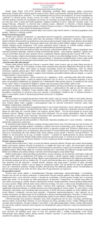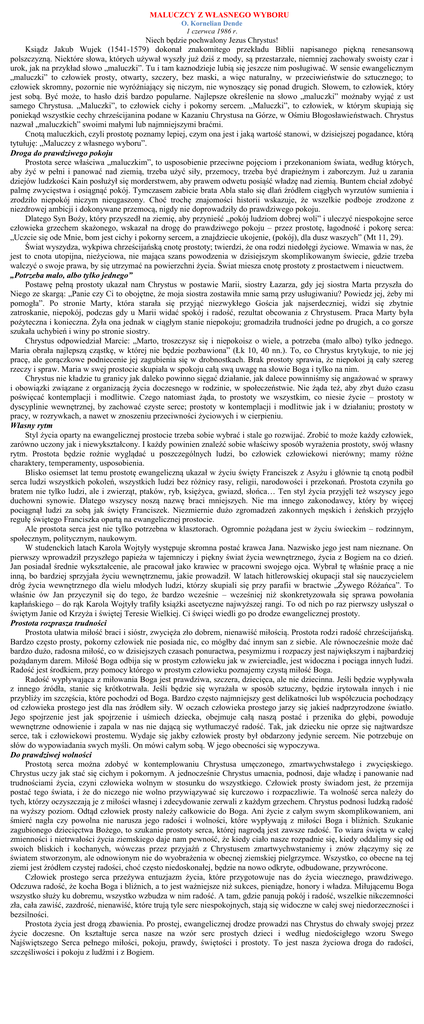 MALUCZCY Z WŁASNEGO WYBORU O. Kornelian Dende 1 czerwca 1986 r. Niech będzie pochwalony Jezus Chrystus! Ksiądz Jakub Wujek (1541-1579) dokonał znakomitego przekładu Biblii napisanego piękną renesansową polszczyzną. Niektóre słowa, których używał wyszły już dziś z mody, są przestarzałe, niemniej zachowały swoisty czar i urok, jak na przykład słowo „maluczki”. Tu i tam kaznodzieje lubią się jeszcze nim posługiwać. W sensie ewangelicznym „maluczki” to człowiek prosty, otwarty, szczery, bez maski, a więc naturalny, w przeciwieństwie do sztucznego; to człowiek skromny, pozornie nie wyróżniający się niczym, nie wynoszący się ponad drugich. Słowem, to człowiek, który jest sobą. Być może, to hasło dziś bardzo popularne. Najlepsze określenie na słowo „maluczki” możnaby wyjąć z ust samego Chrystusa. „Maluczki”, to człowiek cichy i pokorny sercem. „Maluczki”, to człowiek, w którym skupiają się poniekąd wszystkie cechy chrześcijanina podane w Kazaniu Chrystusa na Górze, w Ośmiu Błogosławieństwach. Chrystus nazwał „maluczkich” swoimi małymi lub najmniejszymi braćmi. Cnotą maluczkich, czyli prostotę poznamy lepiej, czym ona jest i jaką wartość stanowi, w dzisiejszej pogadance, którą tytułuję: „Maluczcy z własnego wyboru”. Droga do prawdziwego pokoju Prostota serce właściwa „maluczkim”, to usposobienie przeciwne pojęciom i przekonaniom świata, według których, aby żyć w pełni i panować nad ziemią, trzeba użyć siły, przemocy, trzeba być drapieżnym i zaborczym. Już u zarania dziejów ludzkości Kain posłużył się morderstwem, aby prawem odwetu posiąść władzę nad ziemią. Buntem chciał zdobyć palmę zwycięstwa i osiągnąć pokój. Tymczasem zabicie brata Abla stało się dlań źródłem ciągłych wyrzutów sumienia i zrodziło niepokój niczym nieugaszony. Choć trochę znajomości historii wskazuje, że wszelkie podboje zrodzone z niezdrowej ambicji i dokonywane przemocą, nigdy nie doprowadziły do prawdziwego pokoju. Dlatego Syn Boży, który przyszedł na ziemię, aby przynieść „pokój ludziom dobrej woli” i uleczyć niespokojne serce człowieka grzechem skażonego, wskazał na drogę do prawdziwego pokoju – przez prostotę, łagodność i pokorę serca: „Uczcie się ode Mnie, bom jest cichy i pokorny sercem, a znajdziecie ukojenie, (pokój), dla dusz waszych” (Mt 11, 29). Świat wyszydza, wykpiwa chrześcijańską cnotę prostoty; twierdzi, że ona rodzi niedołęgi życiowe. Wmawia w nas, że jest to cnota utopijna, nieżyciowa, nie mająca szans powodzenia w dzisiejszym skomplikowanym świecie, gdzie trzeba walczyć o swoje prawa, by się utrzymać na powierzchni życia. Świat miesza cnotę prostoty z prostactwem i nieuctwem. „Potrzeba mało, albo tylko jednego” Postawę pełną prostoty ukazał nam Chrystus w postawie Marii, siostry Łazarza, gdy jej siostra Marta przyszła do Niego ze skargą: „Panie czy Ci to obojętne, że moja siostra zostawiła mnie samą przy usługiwaniu? Powiedz jej, żeby mi pomogła”. Po stronie Marty, która starała się przyjąć niezwykłego Gościa jak najserdeczniej, widzi się zbytnie zatroskanie, niepokój, podczas gdy u Marii widać spokój i radość, rezultat obcowania z Chrystusem. Praca Marty była pożyteczna i konieczna. Żyła ona jednak w ciągłym stanie niepokoju; gromadziła trudności jedne po drugich, a co gorsze szukała uchybień i winy po stronie siostry. Chrystus odpowiedział Marcie: „Marto, troszczysz się i niepokoisz o wiele, a potrzeba (mało albo) tylko jednego. Maria obrała najlepszą cząstkę, w której nie będzie pozbawiona” (Łk 10, 40 nn.). To, co Chrystus krytykuje, to nie jej pracę, ale gorączkowe podniecenie jej zagubienia się w drobnostkach. Brak prostoty sprawia, że niepokoi ją cały szereg rzeczy i spraw. Maria w swej prostocie skupiała w spokoju całą swą uwagę na słowie Boga i tylko na nim. Chrystus nie kładzie tu granicy jak daleko powinno sięgać działanie, jak dalece powinniśmy się angażować w sprawy i obowiązki związane z organizacją życia doczesnego w rodzinie, w społeczeństwie. Nie żąda też, aby zbyt dużo czasu poświęcać kontemplacji i modlitwie. Czego natomiast żąda, to prostoty we wszystkim, co niesie życie – prostoty w dyscyplinie wewnętrznej, by zachować czyste serce; prostoty w kontemplacji i modlitwie jak i w działaniu; prostoty w pracy, w rozrywkach, a nawet w znoszeniu przeciwności życiowych i w cierpieniu. Własny rytm Styl życia oparty na ewangelicznej prostocie trzeba sobie wybrać i stale go rozwijać. Zrobić to może każdy człowiek, zarówno uczony jak i niewykształcony. I każdy powinien znaleźć sobie właściwy sposób wyrażenia prostoty, swój własny rytm. Prostota będzie rożnie wyglądać u poszczególnych ludzi, bo człowiek człowiekowi nierówny; mamy różne charaktery, temperamenty, usposobienia. Blisko osiemset lat temu prostotę ewangeliczną ukazał w życiu święty Franciszek z Asyżu i głównie tą cnotą podbił serca ludzi wszystkich pokoleń, wszystkich ludzi bez różnicy rasy, religii, narodowości i przekonań. Prostota czyniła go bratem nie tylko ludzi, ale i zwierząt, ptaków, ryb, księżyca, gwiazd, słońca… Ten styl życia przyjęli też wszyscy jego duchowni synowie. Dlatego wszyscy noszą nazwę braci mniejszych. Nie ma innego zakonodawcy, który by więcej pociągnął ludzi za sobą jak święty Franciszek. Niezmiernie dużo zgromadzeń zakonnych męskich i żeńskich przyjęło regułę świętego Franciszka opartą na ewangelicznej prostocie. Ale prostota serca jest nie tylko potrzebna w klasztorach. Ogromnie pożądana jest w życiu świeckim – rodzinnym, społecznym, politycznym, naukowym. W studenckich latach Karola Wojtyły występuje skromna postać krawca Jana. Nazwisko jego jest nam nieznane. On pierwszy wprowadził przyszłego papieża w tajemniczy i