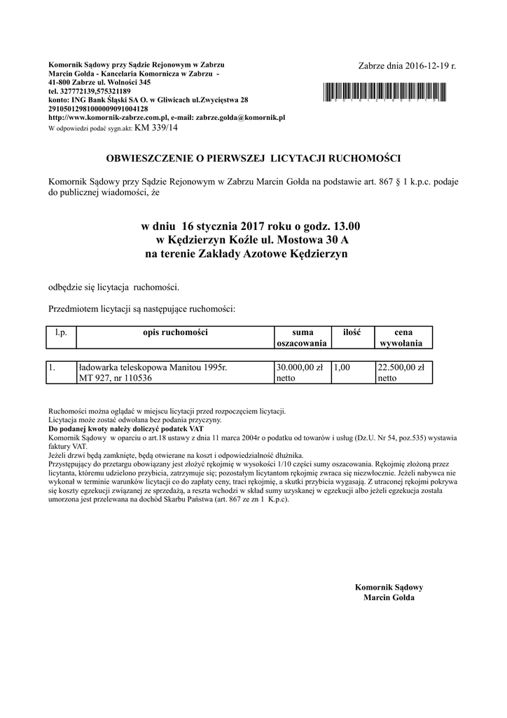 Komornik Sądowy przy Sądzie Rejonowym w Zabrzu Marcin Gołda - Kancelaria Komornicza w Zabrzu 41-800 Zabrze ul. Wolności 345 tel. 327772139,575321189 konto: ING Bank Śląski SA O. w Gliwicach ul.Zwycięstwa 28 29105012981000009091004128 http://www.komornik-zabrze.com.pl, e-mail: [email protected] W odpowiedzi podać sygn.akt: KM Zabrze dnia 2016-12-19 r. *5016121900710* 339/14 OBWIESZCZENIE O PIERWSZEJ LICYTACJI RUCHOMOŚCI Komornik Sądowy przy Sądzie Rejonowym w Zabrzu Marcin Gołda na podstawie art. 867 § 1 k.p.c. podaje do publicznej wiadomości, że w dniu 16 stycznia 2017 roku o godz. 13.00 w Kędzierzyn Koźle ul. Mostowa 30 A na terenie Zakłady Azotowe Kędzierzyn odbędzie się licytacja ruchomości. Przedmiotem licytacji są następujące ruchomości: l.p. 1. opis ruchomości ładowarka teleskopowa Manitou 1995r. MT 927, nr 110536 suma oszacowania 30.000,00 zł netto ilość 1,00 cena wywołania 22.500,00 zł netto Ruchomości można oglądać w miejscu licytacji przed rozpoczęciem licytacji. Licytacja może zostać odwołana bez podania przyczyny. Do podanej kwoty należy doliczyć podatek VAT Komornik Sądowy w oparciu o art.18 ustawy z dnia 11 marca 2004r o podatku od towarów i usług (Dz.U. Nr 54, poz.535) wystawia faktury VAT. Jeżeli drzwi będą zamknięte, będą otwierane na koszt i odpowiedzialność dłużnika. Przystępujący do przetargu obowiązany jest złożyć rękojmię w wysokości 1/10 części sumy oszacowania. Rękojmię złożoną przez licytanta, któremu udzielono przybicia, zatrzymuje się; pozostałym licytantom rękojmię zwraca się niezwłocznie. Jeżeli nabywca nie wykonał w terminie warunków licytacji co do zapłaty ceny, traci rękojmię, a skutki przybicia wygasają. Z utraconej rękojmi pokrywa się koszty egzekucji związanej ze sprzedażą, a reszta wchodzi w skład sumy uzyskanej w egzekucji albo jeżeli egzekucja została umorzona jest przelewana na dochód Skarbu Państwa (art. 867 ze zn 1 K.p.c). Komornik Sądowy Marcin Gołda