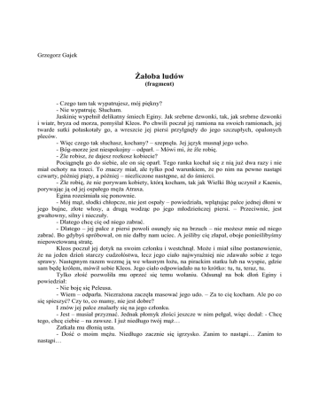 Grzegorz Gajek Żałoba ludów (fragment) - Czego tam tak wypatrujesz, mój piękny? - Nie wypatruję. Słucham. Jaskinię wypełnił delikatny śmiech Eginy. Jak srebrne dzwonki, tak, jak srebrne dzwonki i wiatr, bryza od morza, pomyślał Kleos. Po chwili poczuł jej ramiona na swoich ramionach, jej twarde sutki połaskotały go, a wreszcie jej piersi przylgnęły do jego szczupłych, opalonych pleców. - Więc czego tak słuchasz, kochany? – szepnęła. Jej język musnął jego ucho. - Bóg-morze jest niespokojny – odparł. – Mówi mi, że źle robię. - Źle robisz, że dajesz rozkosz kobiecie? Pociągnęła go do siebie, ale on się oparł. Tego ranka kochał się z nią już dwa razy i nie miał ochoty na trzeci. To znaczy miał, ale tylko pod warunkiem, że po nim na pewno nastąpi czwarty, później piąty, a później – niezliczone następne, aż do śmierci. - Źle robię, że nie porywam kobiety, którą kocham, tak jak Wielki Bóg uczynił z Kaenis, porywając ją od jej ospałego męża Atraxa. Egina roześmiała się ponownie. - Mój mąż, słodki chłopcze, nie jest ospały – powiedziała, wplątując palce jednej dłoni w jego bujne, złote włosy, a drugą wodząc po jego młodzieńczej piersi. – Przeciwnie, jest gwałtowny, silny i nieczuły. - Dlatego chcę cię od niego zabrać. - Dlatego – jej palce z piersi powoli osunęły się na brzuch – nie możesz mnie od niego zabrać. Bo gdybyś spróbował, on nie dałby nam uciec. A jeśliby cię złapał, oboje ponieślibyśmy niepowetowaną stratę. Kleos poczuł jej dotyk na swoim członku i westchnął. Może i miał silne postanowienie, że na jeden dzień starczy cudzołóstwa, lecz jego ciało najwyraźniej nie zdawało sobie z tego sprawy. Następnym razem wezmę ją we własnym łożu, na pirackim statku lub na wyspie, gdzie sam będę królem, mówił sobie Kleos. Jego ciało odpowiadało na to krótko: tu, tu, teraz, tu. Tylko złość pozwoliła mu oprzeć się temu wołaniu. Odsunął na bok dłoń Eginy i powiedział: - Nie boję się Peleusa. - Wiem – odparła. Niezrażona zaczęła masować jego udo. – Za to cię kocham. Ale po co się spieszyć? Czy to, co mamy, nie jest dobre? I znów jej palce znalazły się na jego członku. - Jest – musiał przyznać. Jednak płomyk złości jeszcze w nim pełgał, więc dodał: - Chcę tego, chcę ciebie – na zawsze. I już niedługo twój mąż… Zatkała mu dłonią usta. - Dość o moim mężu. Niedługo zacznie się igrzysko. Zanim to nastąpi… Zanim to nastąpi… Reszta zginęła w pocałunkach. Kleos obrócił się i rozłożył Eginę na chłodnym piasku jaskini, w której się skryli. Całował ją, rozkoszując się zapachem i smakiem jej gładkiej, oliwkowej skóry. Ona ponaglała go, niecierpliwa jak zwykle, już mokra, już gotowa… Kleos zamarł nagle. Uniósł się na ramionach. - Co?! – parsknęła Egina. - Słyszę coś. - Jeśli to znowu twój bóg domaga się porwań, to powiedz mu… - Cii! Nie. Ktoś idzie. Słyszysz? Śpiewa. Egina przekrzywiła głowę. Przez chwilę nasłuchiwała, a potem zepchnęła z siebie Kleosa i poderwała się na nogi. - To rybak – powiedziała. – Z wioski. Oni czasem tu przychodzą, zbierają małże i ostrygi. - Tu nic nie ma – zaoponował słabo Kleos. – Na pewno zaraz… Nie dała mu dokończyć. Rzuciła mu chiton i płaszcz. - Szybko! – syknęła. - Co mam robić? - Jak to, co? Ubieraj się i idź do niego! Zagadaj go! Nie może mnie tu zobaczyć! Kleos ubrał się posłusznie i wybiegł z jaskini, a potem wspiął się po skałach na nabrzeże. Kamienistą plażą szedł podśpiewując niepozorny mężczyzna: czarny, ogorzały, mięsisty. Jego wygląd zdradzał żeglarza, ubiór – możnego pana, wojownika. Jego chiton był zielony jak morze, obszyty złotą nicią, na niego narzucił niedbale błękitny płaszcz spięty srebrną broszą. Gdy się zbliżył, Kleos spostrzegł, że broszę wykuto w kształt ponętnej nimfy. - Witaj, przyjacielu! – odezwał się nieznajomy. Zęby błysnęły jaskrawą bielą na tle ciemnej brody, gdy się uśmiechnął. – Poszukuję pani Eginy, nie widziałeś jej może w tych stronach? - Pani…? – Kleos poczuł, że jego serce przyspiesza. Ruszył naprzeciw nieznajomemu, żeby odciągnąć go od jaskini. – Cóżby tu miała robić? W te strony przychodzą tylko rybacy i dzikie kozy. - Słusznie – nieznajomy kolejny raz błysnął zębami. – Lecz widziałem jak dziś rano opuszcza megaron i zamiast iść na targ lub do pralni przechadza się plażą. - Z pewnością jej służki wiedzą, gdzie się udała. - A, pewnie tak. Powinienem był ich spytać, w końcu wszystkie zostały we dworze. Ciekawa sprawa, nie sądzisz, przyjacielu? Dobrze urodzona pani, a zamiast wyręczać się swymi służkami daje im wolne, by umizgały się do stajennych. Spodziewałbym się, że zastanę tu choć jedną z nich, a tymczasem zastaję samotnego chłopca… W jego ciemnych, prawie czarnych oczach pojawił się figlarny błysk. Uśmiech nie znikał z jego twarzy przez cały czas, gdy przyglądał się Kleosowi. On wie, pomyślał młodzieniec, jednak zamierzał iść w zaparte. - Cóż, doprawdy niezwykłe – powiedział, a potem, nagle wyczuwając humor rozmówcy, dodał: - Może jakaś zazdrosna bogini postanowiła zmienić piękną panią Eginę w tego właśnie chłopca. Nieznajomy huknął śmiechem tak gwałtownym, że Kleos niemal podskoczył. - Słusznie, młodzieńcze – powiedział. – Na nic moje poszukiwania, pani Egina pewnie wróciła już do megaronu, kiedym nie baczył. Wszak żałoba po zmarłym wymaga, by była na miejscu. Wracam do miasta, zechcesz mi towarzyszyć? Kleosowi nie bardzo się to uśmiechało, ale cóż było robić? Pokiwał głową i we dwóch ruszyli wzdłuż plaży z powrotem do miasta. - Zastanawiasz się pewnie, chłopcze, kim jest szaleniec, który cię zaczepił i czego chce od pięknej żony Peleusa-kr