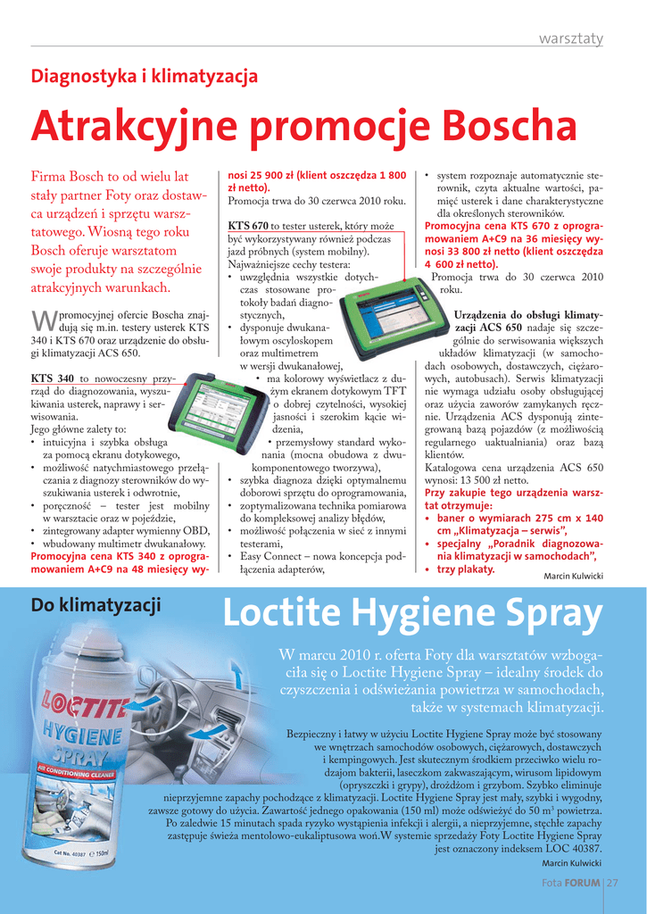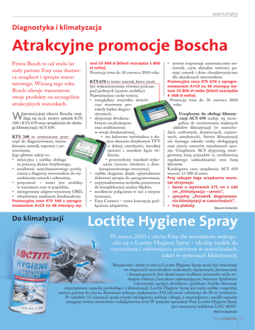 warsztaty Diagnostyka i klimatyzacja Atrakcyjne promocje Boscha Firma Bosch to od wielu lat stały partner Foty oraz dostawca urządzeń i sprzętu warsztatowego. Wiosną tego roku Bosch oferuje warsztatom swoje produkty na szczególnie atrakcyjnych warunkach. promocyjnej ofercie Boscha znajdują się m.in. testery usterek KTS 340 i KTS 670 oraz urządzenie do obsługi klimatyzacji ACS 650. W zyKTS 340 to nowoczesny przyurząd do diagnozowania, wyszukiwania usterek, naprawy i ser-wisowania. Jego główne zalety to: • intuicyjna i szybka obsługaa ego, za pomocą ekranu dotykowego, • możliwość natychmiastowego przełączania z diagnozy sterowników do wyszukiwania usterek i odwrotnie, • poręczność – tester jest mobilny w warsztacie oraz w pojeździe, • zintegrowany adapter wymienny OBD, • wbudowany multimetr dwukanałowy. Promocyjna cena KTS 340 z oprogramowaniem A+C9 na 48 miesięcy wy- Do klimatyzacji nosi 25 900 zł (klient oszczędza 1 800 zł netto). Promocja trwa do 30 czerwca 2010 roku. KTS 670 to tester usterek, który może być wykorzystywany również podczas jazd próbnych (system mobilny). Najważniejsze cechy testera: • uwzględnia wszystkie kie dotychczas stosowane prootokoły badań diagno-stycznych, • dysponuje dwukana-łowym oscyloskopem m oraz multimetrem j dwukanałowej, wej w wersji • ma m kolorowy wyświetlacz z dużżym ekranem dotykowym TFT o dobrej czytelności, wysokiej jasności i szerokim kącie widzenia, • przemysłowy standard wykonan nania (mocna obudowa z dwukomponentowego tworzywa), • szybka diagnoza dzięki optymalnemu doborowi sprzętu do oprogramowania, • zoptymalizowana technika pomiarowa do kompleksowej analizy błędów, • możliwość połączenia w sieć z innymi testerami, • Easy Connect – nowa koncepcja podłączenia adapterów, • system rozpoznaje automatycznie sterownik, czyta aktualne wartości, pamięć usterek i dane charakterystyczne dla określonych sterowników. Promocyjna cena KTS 670 z oprogramowaniem A+C9 na 36 miesięcy wynosi 33 800 zł netto (klient oszczędza 4 600 zł netto). Promocja trwa do 30 czerwca 2010 Promo roku roku. U Urządzenia do obsługi klimatyzzacji ACS 650 nadaje się szczególnie do serwisowania większych gó układów klimatyzacji (w samochoukład dach osobowych, os dostawczych, ciężarowych, autobusach). Serwis klimatyzacji nie wymaga udziału osoby obsługującej oraz użycia zaworów zamykanych ręcznie. Urządzenia ACS dysponują zintegrowaną bazą pojazdów (z możliwością regularnego uaktualniania) oraz bazą klientów. Katalogowa cena urządzenia ACS 650 wynosi: 13 500 zł netto. Przy zakupie tego urządzenia warsztat otrzymuje: • baner o wymiarach 275 cm x 140 cm „Klimatyzacja – serwis”, • specjalny „Poradnik diagnozowania klimatyzacji w samochodach”, • trzy plakaty. Marcin Kulwicki Loctite Hygiene Spray W marcu 2010 r. oferta Foty dla warsztatów wzbogaciła się o Loctite Hygiene Spray – idealny środek do czyszczenia i odświeżania powietrza w samochodach, także w systemach klimatyzacji. Bezpieczny i łatwy w użyciu Loctite Hygiene Spray może być stosowany we wnętrzach samochodów osobowych, ciężarowych, dostawczych i kempingowych. Jest skutecznym środkiem przeciwko wielu rodzajom bakterii, laseczkom zakwaszającym, wirusom lipidowym (opryszczki i grypy), drożdżom i grzybom. Szybko eliminuje nieprzyjemne zapachy pochodzące z klimatyzacji. Loctite Hygiene Spray jest mały, szybki i wygodny, zawsze gotowy do użycia. Zawartość jednego opakowania (150 ml) może odświeżyć do 50 m3 powietrza. Po zaledwie 15 minutach spada ryzyko wystąpienia infekcji i alergii, a nieprzyjemne, stęchłe zapachy zastępuje świeża mentolowo-eukaliptusowa woń.W systemie sprzedaży Foty Loctite Hygiene Spray jest oznaczony indeksem LOC 40387. Marcin Kulwicki Fota FORUM 27