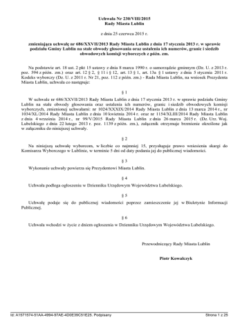 Uchwała Nr 230/VIII/2015 Rady Miasta Lublin z dnia 25 czerwca 2015 r. zmieniająca uchwałę nr 686/XXVII/2013 Rady Miasta Lublin z dnia 17 stycznia 2013 r. w sprawie podziału Gminy Lublin na stałe obwody głosowania oraz ustalenia ich numerów, granic i siedzib obwodowych komisji wyborczych z późn. zm. Na podstawie art. 18 ust. 2 pkt 15 ustawy z dnia 8 marca 1990 r. o samorządzie gminnym (Dz. U. z 2013 r. poz. 594 z późn. zm.) oraz art. 12 § 2, § 11 i § 12, art. 13 § 1, art. 13a § 1 ustawy z dnia 5 stycznia 2011 r. Kodeks wyborczy (Dz. U. z 2011 r. Nr 21, poz. 112 z późn. zm.) - Rada Miasta Lublin, na wniosek Prezydenta Miasta Lublin, uchwala co następuje: §1 W uchwale nr 686/XXVII/2013 Rady Miasta Lublin z dnia 17 stycznia 2013 r. w sprawie podziału Gminy Lublin na stałe obwody głosowania oraz ustalenia ich numerów, granic i siedzib obwodowych komisji wyborczych, zmienionej uchwałami: nr 1024/XXXIX/2014 Rady Miasta Lublin z dnia 13 marca 2014 r., nr 1034/XL/2014 Rady Miasta Lublin z dnia 10 kwietnia 2014 r. oraz nr 1154/XLIII/2014 Rady Miasta Lublin z dnia 4 września 2014 r., nr 99/V/2015 Rady Miasta Lublin z dnia 26 marca 2015 r. (Dz. Urz. Woj. Lubelskiego z dnia 22 lutego 2013 r. poz. 1139 z późn. zm.), załącznik otrzymuje brzmienie określone jak w załączniku do niniejszej uchwały. §2 Na niniejszą uchwałę wyborcom, w liczbie co najmniej 15, przysługuje prawo wniesienia skargi do Komisarza Wyborczego w Lublinie, w terminie 5 dni od daty podania jej do publicznej wiadomości. §3 Wykonanie uchwały powierza się Prezydentowi Miasta Lublin. §4 Uchwała podlega ogłoszeniu w Dzienniku Urzędowym Województwa Lubelskiego. §5 Uchwałę podaje się do publicznej wiadomości poprzez zamieszczenie jej w Biuletynie Informacji Publicznej. §6 Uchwała wchodzi w życie z dniem ogłoszenia w Dzienniku Urzędowym Województwa Lubelskiego. Przewodniczący Rady Miasta Lublin Piotr Kowalczyk Id: A1571574-51AA-4994-97AE-4D0E39C51E25. Podpisany Strona 1 z 25 Załącznik do uchwały nr 230/VIII/2015 Rady Miasta Lublin z dnia 25 czerwca 2015 r. Załącznik do uchwały nr 686/XXVII/2013 Rady Miasta Lublin z dnia 17 stycznia 2013 r. Nr obwodu 1 2 3 4 5 Granice obwodu głosowania Siedziba obwodowej komisji wyborczej ULICE: Popiełuszki str. nieparzysta od nr 23 do końca, Puławska str. nieparzysta od nr 19 do Przedszkole nr 43 końca i str. parzysta od nr 24 do końca, al. Sikorskiego str. nieparzysta od nr 7 do końca, ul. Skautów 11a Skautów w całości. ULICE: Boczna Lubomelskiej w całości, Czechowska str. parzysta od nr 14 do końca i str. nieparzysta od nr 19 do końca, Ćwiklińskiej w całości, al. Długosza str. nieparzysta Gimnazjum nr 18 w całości i str. parzysta od nr 10 do końca, Leszczyńskiego w całości, Lubomelska str. parzysta im. Macieja Rataja w całości, Ogródkowa w całości, Popiełuszki str. nieparzysta od nr 1 do nr 5, Przy Stawie al. Jana Długosza 8 w całości, Snopkowska w całości. ULICE: Legionowa str. parzysta w całości, Popiełuszki str. parzysta od nr 32 do końca, Szkoła Podstawowa nr 21 Puławska str. nieparzysta od nr 1 do nr 17 i str. parzysta od nr 2 do nr 22, Al. Racławickie im. Królowej Jadwigi str. nieparzysta od nr 25 do końca, al. Sikorskiego str. nieparzysta od nr 1 do nr 5, Szarych ul. Zuchów 1 Szeregów w całości, Zuchów w całości. ULICE: al. Długosza str. parzysta od nr 2 do nr 8, Dubois w całości, Głowackiego w całości, Junoszy w całości, Księżycowa w całości, Legionowa str. nieparzysta w całości, Lelka-Sowy Bursa Szkolna nr 1 w całości, Norwida w całości, Poniatowskiego w całości, Popiełuszki str. nieparzysta od nr 7 ul. Księdza Jerzego Popiełuszki 7 do nr 19 i str. parzysta od nr 2 do nr 30, Al. Racławickie str. nieparzysta od nr 1 do nr 23, Rayskiego w całości. ULICE: Głęboka str. nieparzysta od nr 37 do końca, Godebskiego str. nieparzysta nr 1, al. Kraśnicka nr 2, Al. Racławickie str. parzysta od nr 28 do końca, Spadochroniarzy Przedszkole nr 65 str. nieparzysta w całości i str. parzysta od nr 2 do nr 4, Weteranów str. nieparzysta od nr 15 do ul. Mariana Langiewicza 3a końca. Id: A1571574-51AA-4994-97AE-4D0E39C51E25. Podpisany Dzielnica Nr okręgu Wieniawa I Wieniawa I Wieniawa I Wieniawa I Wieniawa I Strona 2 z 25 6 7 8 9 10 11 12 13 ULICE: Godebskiego str. parzysta nr 2, Łopacińskiego str. nieparzysta w całości, Pagi I Liceum Ogólnokształcące w całości, Al. Racławickie str. parzysta od nr 18 do nr 26, Sowińskiego str. nieparzysta od nr 1 im. Stanisława Staszica do nr 3 i str. parzysta od nr 2 do nr 4, Weteranów str. nieparzysta od nr 1 do nr 13. Al. Racławickie 26 ULICE: Czwartaków w całości, Godebskiego str. nieparzysta od nr 3 do końca, Langiewicza Szkoła Podstawowa nr 6 str. nieparzysta od nr 15 do końca i str. parzysta w całości, Radziszewskiego str. nieparzysta od im. Romualda Traugutta nr 15 do końca i str. parzysta od nr 16 do końca, Spadochroniarzy str. parzysta od nr 6 do ul. Czwartaków 11 końca, Weteranów str. parzysta od nr 30 do końca, Wysockiego w całości. ULICE: Akademicka str. nieparzysta w całości, Beliniaków w całości, Bema w całości, Głęboka str. nieparzysta od nr 31 do nr 35, Godebskiego str. parzysta od nr 4 do końca, Bursa Szkolna nr 3 Langiewicza str. nieparzysta od nr 1 do nr 13, Radziszewskiego str. nieparzysta od nr 9 do ul. Weteranów 3 nr 13 i str. parzysta od nr 10 do nr 14, Sowińskiego str. nieparzysta od nr 5 do nr 13 i str. parzysta od nr 6 do nr 12, Weteranów str. parzysta od nr 2 do nr 28. ULICE: Biernackiego str. nieparzysta w całości, Chodźki str. nieparzysta od nr 1 do nr 17 i str. parzysta od nr 2 do nr 6, Fijałkowskiego w całości, Gębali w całości, Hirszfelda w Szkoła Podstawowa nr 25 całości, Jaczewskiego w całości, Kleniewskich w całości, Obywatelska w całości, Połaniecka im. Władysława Broniewskiego w całości, Północna str. nieparzysta od nr 1 do nr 1