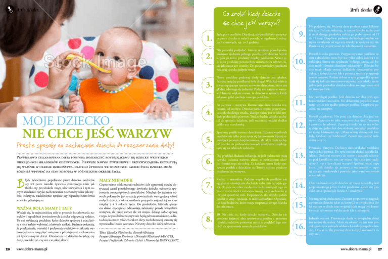 Co zrobić kiedy dziecko nie chce jeść warzyw? 1. 2. 3. Moje dziecko nie chce jeść warzyw Proste sposoby na zachęcanie dziecka do rozszerzania diety! Prawidłowo zbilansowana dieta powinna dostarczyć rozwijającemu się dziecku wszystkich niezbędnych składników odżywczych. Pierwsze nawyki żywieniowe i przyzwyczajenia kształtują się właśnie w okresie dzieciństwa, dlatego żywienie we wczesnych latach życia dziecka może również wpływać na stan zdrowia w późniejszym okresie życia. B łędy żywieniowe popełniane przez dziecko, rodziców czy też przez ośrodki żywienia zbiorowego takie jak żłobki czy przedszkola mogą ulec utrwaleniu i tym samym zwiększać ryzyko zachorowania na choroby takie jak otyłość, cukrzyca, nadciśnienie tętnicze czy hipercholesterolemia w wieku późniejszym. Ważna rola mamy i taty Wydaje się, że najważniejszą rolę w procesie kształtowania nawyków i upodobań żywieniowych dziecka odgrywają rodzice. To oni wybierają produkty, które dziecko spożywa i uczą które z nich należy wybierać, a których unikać. Badania pokazują, że przekonania, wartości i preferencje rodziców w zakresie wyboru jedzenia mogą być związane z późniejszymi zachowaniami żywieniowymi dzieci. Ostatecznie to dziecko decyduję czy dany produkt zje, czy nie i w jakiej ilości. 26 Mały niejadek Często mimo wielu starań rodziców i ich ogromnej wiedzy dotyczącej zasad prawidłowego żywienia dziecko odmawia spożywania poszczególnych produktów. Niechęć do jedzenia nowych pokarmów jest sytuacją powszechnie występującą wśród małych dzieci, a okres nasilenia przypada najczęściej na czas między 2 a 5 rokiem życia. Do produktów, których spożycia dzieci najczęściej odmawiają zaliczamy przede wszystkim warzywa, ale także owoce ale też mięso. Zdając sobie sprawę z tego, że posiłki bez warzyw nie będą pełnowartościowe, a dieta dziecka może mieć charakter diety niedoborowej staramy się wprowadzać nowe warzywa. Niestety dziecko dalej odmawia. Tekst: Klaudia Wiśniewska, dietetyk kliniczny Instytut Zdrowego Żywienia i Dietetyki Klinicznej SANVITA, Instytut Profilaktyki Zdrowia Dzieci i Niemowląt BABY CLINIC. 4. 5. 6. 7. 8. Stałe pory posiłków. Dopilnuj, aby posiłki były spożywane przez dziecko o stałych porach, w regularnych odstępach czasowych, np. co 3 godziny. Nie pozwalaj podjadać. Istnieje mniejsze prawdopodobieństwo zjedzenia pełnego posiłku jeśli dziecko będzie sięgało po różne produkty między posiłkami. Nawet jeśli są to produkty powszechnie uznawane za zdrowe, takie jak owoce czy orzechy. Do picia pomiędzy posiłkami podawaj dziecku jedynie wodę. Nowe produkty podawaj kiedy dziecko jest głodne. Przerwa między posiłkami była długa? Wróciłaś właśnie z wyczerpującego spaceru ze swoim dzieckiem, które jest głodne i domaga się jedzenia? Podaj mu najpierw warzywo! Istnieje większa szansa, że dziecko w sytuacji, kiedy odczuwa głód spróbuje nowego produktu. Po pierwsze – warzywa. Rozszerzając dietę dziecka rozpocznij od warzyw. Dziecko bardzo często przyzwyczaja się do słodkiego smaku, dlatego ważne jest to jaki produkt podasz jako pierwszy. Trudno będzie dziecko zachęcić do spożycia kalafiora, jeśli wcześniej podałaś słodkie jabłko czy marchewkę. 9. 10. 11. 12. Spożywaj posiłki razem z dzieckiem. Jedzenie wspólnych posiłków nie tylko przyczynia się do powstania lepszej atmosfery i poczucia bezpieczeństwa, ale także może zachęcić dziecko do próbowania nowych produktów znajdujących się na talerzach rodziców. Daj przykład. Badania wskazują, że jeśli rodzice nie mają nawyku jedzenia warzyw, dzieci w późniejszym okresie również tego nie robią. Za każdym razem kiedy spożywasz posiłek z dzieckiem na Twoim talerzu powinny znajdować się warzywa. Zadbaj o atmosferę. Podczas wspólnych posiłków nie oglądajcie telewizji, nie słuchajcie radia i nie czytajcie gazet. Skupcie się tylko i wyłącznie na konsumpcji tego co macie na talerzach i zwracajcie uwagę na to co dziecko je i w jaki sposób to robi. Dopilnujcie, aby dziecko jadało posiłki w ciszy i spokoju, w miłej atmosferze. Ograniczcie ilość bodźców, które mogą rozpraszać uwagę dziecka do minimum. 10. Nie złość się, kiedy dziecko odmawia. Dziecko nie powinno kojarzyć aktu spożywania posiłku z gniewem i złością rodziców, ponieważ może to pogłębić jego niechęć do spożywania nowych produktów. 13. Nie poddawaj się. Podawaj dany produkt nawet kilkanaście razy. Badania wskazują, że zanim dziecko zaakceptuje smak danego produktu należy go podać nawet od 11 do 15 razy. Cierpliwie podawaj do każdego posiłku warzywa niezależnie od tego czy dziecko je spożywa czy nie. Powinno się przyzwyczaić do ich obecności na talerzu. Pozwól dziecku gotować. Przygotowywanie posiłków razem z dzieckiem może być nie tylko dobrą zabawą i rewelacyjną formą na spędzanie wolnego czasu, ale będzie miało również charakter edukacyjny. Dziecko będzie miało okazje poznać dokładnie poszczególne produkty, z których samo lub z pomocą rodzica przygotuje potem potrawę. Bardzo dobrze w tym przypadku sprawdzają się koktajle owocowo-warzywne oraz sałatki, szczególnie jeśli pozwolisz dziecku wybrać to czego chce użyć do swojego dania. Nie przeciągaj posiłku. Jeśli dziecko nie chce jeść, spokojnie odbierz mu talerz. Nie dokarmiaj go później martwiąc się, że nie zjadło pełnego posiłku. Cierpliwie poczekaj na następny. Pozwól decydować. Nie pytaj czy dziecko chce jeść warzywo. Zapytaj o to jakie warzywo chce zjeść. Proponuj i pozwalaj decydować. Zapytaj dziecko na co ma ochotę dając mu jedno lub dwa wyboru pomiędzy produktami mniej lubianymi, np.: „Masz ochotę dzisiaj zjeść brokuły, kalafiora czy bakłażana?” Pozwól mu podjąć świadomą decyzję. Przemycaj warzywa. Do kaszy możesz dodać posiekany szpinak lub
