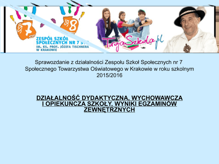 Sprawozdanie z działalności Zespołu Szkoł Społecznych nr 7 Społecznego Towarzystwa Oświatowego w Krakowie w roku szkolnym 2015/2016 DZIAŁALNOŚĆ DYDAKTYCZNA, WYCHOWAWCZA I OPIEKUŃCZA SZKOŁY, WYNIKI EGZAMINÓW ZEWNĘTRZNYCH 1. Wyniki sprawdzianu szóstoklasistów w roku szkolnym 2015/2016 1.1 język polski 1.1.1. śr. pkt klasy: 17,6/21 (wynik procentowy 88,2) 1.1.2. gmina: 15,8/20 (wynik procentowy 79,2) 1.1.3. wojewodztwo: 14,7/20 (wynik procentowy 73,3) 1.2. matematyka 1.2.1. śr. pkt klasy: 17/20 (wynik procentowy 85) 1.2.2. gmina: 13,6/20 (wynik procentowy 68,2) 1.2.3. wojewodztwo:11,6/20 (wynik procentowy 58,2) 1.3. część językowa - j. Angielski 1.3.1. śr. pkt klasy: 33/40 (wynik procentowy 97) 1.3.2. gmina: 33,5/40 (wynik procentowy 83,8) 1.3.3. wojewodztwo: 29,3/40 (wynik procentowy 73,3) 2. Wyniki egzaminu gimnazjalnego w roku szkolnym 2015/2016 2.1. język polski 2.1.1. śr. pkt szkoły: 24,8/32 (wynik procentowy 77,6) 2.1.2. gmina: 24,7/32 (wynik procentowy 77,2) 2.1.3. wojewodztwo: 23,1/32 (wynik procentowy 72,1) 2.2. historia i społeczeństwo 2.2.1. śr. pkt szkoły: 23,8/32(wynik procentowy 74,3) 2.2.2 gmina: 20,9/32 (wynik procentowy 65,3) 2.2.3 wojewodztwo: 19/32 (wynik procentowy 59,3) 2.3 matematyka 2.3.1. śr. pkt szkoły: 21,1/28 (wynik procentowy 75,2) 2.3.2. gmina: 17,2/28 (wynik procentowy 61,4) 2.3.3. wojewodztwo: 14,8 (wynik procentowy 52,9) 2.4. przedmioty przyrodnicze 2.4.1. śr. pkt szkoły: 20,4/28(wynik procentowy 72,9) 2.4.2. gmina: 17/28 (wynik procentowy 60,7) 2.4.3. wojewodztwo: 15,1 (wynik procentowy 54) 2.5. język angielski – poziom podstawowy 2.5.1. śr. pkt szkoły: 37,8/40 (wynik procentowy 94,6) 2.5.2 gmina: 30,8/40 (wynik procentowy 77) 2.5.3. wojewodztwo: 25,9/40 (wynik procentowy 64,9) 2.6. język angielski – poziom rozszerzony 2.6.1. śr. pkt szkoły: 34,1 (wynik procentowy 85,3) 2.6.2. gmina: 23,9/40 (wynik procentowy 59,9) 2.6.3. wojewodztwo: 18,1 (wynik procentowy 45,2) OSIĄGNIĘCIA UCZNIÓW i NAUCZYCIELI KONKURSY MAŁOPOLSKIEGO KURATORA OŚWIATY • Konkurs Matematyczny Do etapu rejonowego zakwalifikowali się: -Zuzanna Skałka -Jakub Kosiarkiewicz • Finalistką etapu wojewódzkiego została Zuzanna Skałka. Koordynator: p. Beata Więczaszek XXV edycja MIĘDZYNARODOWEGO KONKURSU KANGUR MATEMATYCZNY Laureat: - Augustyn Krzysztof Wynik bardzo dobry: • • Anna Galys Franciszek Jurkowski Wyróżnienie: • • • • • • • • • • • • • • • • • • • Bartosz Łagudza Kamila Kobylarczyk Jakub Łagudza Szymon Czort Nina Chronowska Jakub Stachniak Olga Mazurek Marcin Chwastek Andrzej Sulecki Antonina Dziadur Norbert Słaboń Błażej Bułka Stanisław Wąsikiewicz Paweł Augustyn Alicja Gruca Wojciech Matuszyński Zuzanna Skałka Patrycja Jaskierny Adrian Jabłoński KONKURS KRAKOWSKA MATEMATYKA: Finaliści: • • Franciszek Jurkowski Krzysztof Augustyn IX edycja OGÓLNOPOLSKIEGO KONKURSU NAUK PRZYRODNICZYCH „ŚWIETLIK” • Uczniowie, którzy otrzymali nagrodę w IX Edycji Konkursu Nauk Przyrodniczych Świetlik : • • • • • • Nina Hetnał – klasa 1a Maja Moorthi – klasa 2a Bartosz Łagudza – klasa 2b Jakub Stachniak – klasa 3a Jakub Swat – klasa 3b Paweł Knot – klasa 5a • • Uczniowie, którzy otrzymali wyróżnienia: • • • • • • • • • • • • • • Piotr Niemiec – klasa 1a Paulina Piróg – klasa 1a Maja Struska – klasa 1b Nina Chronowska – klasa 2a Szymon Kowal – klasa 2a Małgorzata Godyń – klasa 2b Antoni Czajkowski – klasa 2b Jakub Łagudza – klasa 2b Kacper Mróz – klasa 2b Marcin Chwastek – klasa 3b Kajetan Kościński – klasa 3b Małgorzata Ukowska – klasa 4a Michał Cisowski – klasa 4b Zuzia Ryżak – klasa 4b • Koordynator konkursu: Barbara Mycek Konkurs „Dzieje Krakowa w czasie Wielkiej Wojny” „Gra miejska" - 5 gimnazjalistów zostało finalistami etapu wojewódzkiego gry miejskiej. Koordynatorzy konkursu p. D. Korczykowski, p. P. Rogoziński KONKURSY JĘZYKOWE Imię i nazwisko Miejsce w wojew. Miejsce w kraju Olga Ptak klasa kl. Ig 1 31 Michał Misztal kl. 5 3 25 Inez Mazur kl. Ig 4 52 Anna Mach kl. III g 5 96 Zuzanna Ryżak kl.4 6 84 Katarzyna Grądalska kl.II g 7 88 Kajetan Rybarski kl. 4 7 87 Dominik Dzierżek kl. IIg 7 88 Maciej Gąsior kl. 6 20 115 1. język angielski – – ENGLISH HIGH FLIER ENGLISH ACE Koordynatorzy: Izabela Stepień, Ewelina Zabrzeńska, Małgorzata Luty, Małgorzata Adamska-Cieślik 2. język niemiecki: – KONKURS „DEUTSCHFREUND 2015” • 1. miejsce w Małopolsce – Alicja Gruca, kl. 5 (dyplom za uzyskanie bardzo dobrego wyniku), • 2. miejsce w Małopolsce – Daniel Cieliczko, kl. 5 (dyplom za uzyskanie dobrego wyniku), • 6. miejsce w Małopolsce – Michał Misztal, kl. 5 (dyplom za uzyskanie dobrego wyniku), KONKURS „SPRACHDOKTOR 2016” • 2. miejsce w Małopolsce – Olga Łuczak, kl. 5 (dyplom za uzyskanie bardzo dobrego wyniku), • 3. miejsce w Małopolsce – Magdalena Wiśniowska, kl.6 (dyplom za uzyskanie bardzo dobrego wyniku) • 5. miejsce w Małopolsce – Zofia Hebda (dyplom za uzyskanie bardzo dobrego wyniku), kl. 5, • 7. miejsce w Małopolsce – Dominik Dzierżek (dyplom za uzyskanie bardzo dobrego wyniku), kl. IIG, • 7. miejsce w Małopolsce – Julia Karnas (dyplom za uzyskanie dobrego wyniku), kl.4b, • 8. miejsce w Małopolsce – Olga Ptak (dyplom za uzyskanie bardzo dobrego wyniku), kl.IG, KONKURS „SPRACHDOKTOR 2016” c.d. • • • • • • • • • • • 9. miejsce w Małopolsce – Natalia Miedzińska (dyplom za uzyskanie dobrego wyniku), kl. IG, 9. miejsce w Małopolsce – Alicja Gruca (dyplom za uzyskanie dobrego wyniku), kl. 5, 9. miejsce w Małopolsce – Natalia Golonka (dyplom za uzyskanie dobrego wyniku), kl. 5, 8. miejsce w Małopolsce – Magda Grądalska (dyplom za uzyskanie dobrego wyniku), kl. IIIG, 8. miejsce w Małopolsce – Adrian Jabłoński (dyplom za uzyskanie dobrego wyniku), kl. IIIG, 