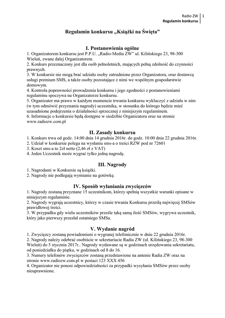 Radio ZW 1 Regulamin konkursu Regulamin konkursu „Książki na Święta” I. Postanowienia ogólne 1. Organizatorem konkursu jest P.P.U. „Radio-Media ZW” ul. Kilińskiego 23, 98-300 Wieluń, zwane dalej Organizatorem. 2. Konkurs przeznaczony jest dla osób pełnoletnich, mających pełną zdolność do czynności prawnych. 3. W konkursie nie mogą brać udziału osoby zatrudnione przez Organizatora, oraz dostawcę usługi premium SMS, a także osoby pozostające z nimi we wspólnym gospodarstwie domowym. 4. Kontrola poprawności prowadzenia konkursu i jego zgodności z postanowieniami regulaminu spoczywa na Organizatorze konkursu. 5. Organizator ma prawo w każdym momencie trwania konkursu wykluczyć z udziału w nim (w tym odmówić przyznania nagrody) uczestnika, w stosunku do którego będzie mieć uzasadnione podejrzenia o działalności sprzecznej z niniejszym regulaminem. 6. Informacje o konkursie będą dostępne w siedzibie Organizatora oraz na stronie www.radiozw.com.pl II. Zasady konkursu 1. Konkurs trwa od godz. 14:00 dnia 14 grudnia 2016r. do godz. 10:00 dnia 22 grudnia 2016r. 2. Udział w konkursie polega na wysłaniu sms-a o treści RZW pod nr 72601 3. Koszt sms-a to 2zł netto (2,46 zł z VAT) 4. Jeden Uczestnik może wygrać tylko jedną nagrodę. III. Nagrody 1. Nagrodami w Konkursie są książki. 2. Nagrody nie podlegają wymianie na gotówkę. IV. Sposób wyłaniania zwycięzców 1. Nagrody zostaną przyznane 15 uczestnikom, którzy spełnią wszystkie warunki opisane w niniejszym regulaminie. 2. Nagrody wygrają uczestnicy, którzy w czasie trwania Konkursu prześlą najwięcej SMSów prawidłowej treści. 3. W przypadku gdy wielu uczestników prześle taką samą ilość SMSów, wygrywa uczestnik, który jako pierwszy przesłał ostatniego SMSa. V. Wydanie nagród 1. Zwycięzcy zostaną powiadomieni o wygranej telefonicznie w dniu 22 grudnia 2016r. 2. Nagrody należy odebrać osobiście w sekretariacie Radia ZW (ul. Kilińskiego 23, 98-300 Wieluń) do 5 stycznia 2017r.. Nagrody wydawane są w godzinach urzędowania sekretariatu, od poniedziałku do piątku, w godzinach od 8 do 16. 3. Numery telefonów zwycięzców zostaną przedstawione na antenie Radia ZW oraz na stronie www.radiozw.com.pl w postaci 123 XXX 456 4. Organizator nie ponosi odpowiedzialności za przypadki wysyłania SMSów przez osoby nieuprawnione. Radio ZW 2 Regulamin konkursu VI. Laureaci i dane osobowe 1. W celu otrzymania nagrody zwycięzca powinien podać swoje dane osobowe (imię, nazwisko, nr telefonu z którego wysłał zwycięskie smsy). Podanie danych jest dobrowolne, jednak w przypadku odmowy udostępnienia niniejszych danych Organizator może nie wydać nagrody takiej osobie. 2. Organizator oświadcza, że podane dane osobowe będą przetwarzane zgodnie z ustawą z dnia 29 sierpnia 1997 r. o ochronie danych osobowych (tj. Dz. U. Z 2002 r. Nr 101, poz. 926) jedynie w celach konkursowych. Każda osoba ma prawo wglądu w swoje dane oraz ich poprawiania. 3. Uczestnicy konkursu przez dokonanie zgłoszenia akceptują postanowienie niniejszego regulaminu, wyrażają zgodę na przetwarzanie swoich danych zgodnie z nim. VII. Reklamacje 1. Wszelkie reklamacje i zastrzeżenia dotyczące przebiegu konkursu mogą być składane przez uczestników wyłącznie w formie pisemnej wraz ze szczegółowym uzasadnieniem, listem poleconym na adres siedziby Organizatora przez cały czas trwania konkursu, jednakże nie później niż w terminie 14 dni od dnia ukończenia konkursu. Reklamacje wpływające po powyższym terminie nie będą rozpatrywane. 2. Złożone reklamacje będą rozpatrywane przez Organizatora niezwłocznie, jednak nie później niż w terminie 7 dni od daty otrzymania reklamacji. 3. Zainteresowani zostaną powiadomieni o sposobie rozpatrzenia reklamacji listem poleconym najpóźniej w ciągu 7 dni od daty rozpatrzenia reklamacji. 4. Decyzja Organizatora co do zgłoszonej reklamacji jest ostateczna. VIII. Postanowienia końcowe 1. W sprawach nieuregulowanych niniejszym regulaminem zastosowanie mają odpowiednie przepisy kodeksu cywilnego (Dz. U. 1964, nr 16, poz. 93 z późniejszymi zmianami). 2. Wszelkie spory i roszczenia związane z Konkursem rozstrzygać będzie sąd powszechny właściwy dla siedziby Organizatora Radio ZW 3 Regulamin konkursu Regulamin konkursu „Świece na Święta” I. Postanowienia ogólne 1. Organizatorem konkursu jest P.P.U. „Radio-Media ZW” ul. Kilińskiego 23, 98-300 Wieluń, zwane dalej Organizatorem. 2. Konkurs przeznaczony jest dla osób pełnoletnich, mających pełną zdolność do czynności prawnych. 3. W konkursie nie mogą brać udziału osoby zatrudnione przez Organizatora, oraz dostawcę usługi premium SMS, a także osoby pozostające z nimi we wspólnym gospodarstwie domowym. 4. Kontrola poprawności prowadzenia konkursu i jego zgodności z postanowieniami regulaminu spoczywa na Organizatorze konkursu. 5. Organizator ma prawo w każdym momencie trwania konkursu wykluczyć z udziału w nim (w tym odmówić przyznania nagrody) uczestnika, w stosunku do którego będzie mieć uzasadnione podejrzenia o działalności sprzecznej z niniejszym regulaminem. 6. Informacje o konkursie będą dostępne w siedzibie Organizatora oraz na stronie www.radiozw.com.pl II. Zasady konkursu 1. Konkurs trwa od godz. 14:00 dnia 14 grudnia 2016r. do godz. 10:00 dnia 22 grudnia 2016r. 2. Udział w konkursie polega na wysłaniu sms-a o treści RADIO pod nr 72601 3. Koszt sms-a to 2zł netto (2,46 zł z VAT) 4. Jeden Uczestnik może wygrać tylko jedną nagrodę. III. Nagrody 1. Nagrodami w Konkursie są zestawy świec. 2. Nagrody nie podlegają wymianie na gotówkę. IV. Sposób wyłaniania zwycięzców 1. Nagrody zostaną przyznane 5 uczestnikom, którzy spełnią wszystkie warunki opisane w niniejszym regulaminie. 2. Nagrody wygrają uczestnicy, którzy w czasie trwania Konkursu prześlą najwięcej SMSów prawidłowej treści. 3. W przypadku gdy wielu uczestnik