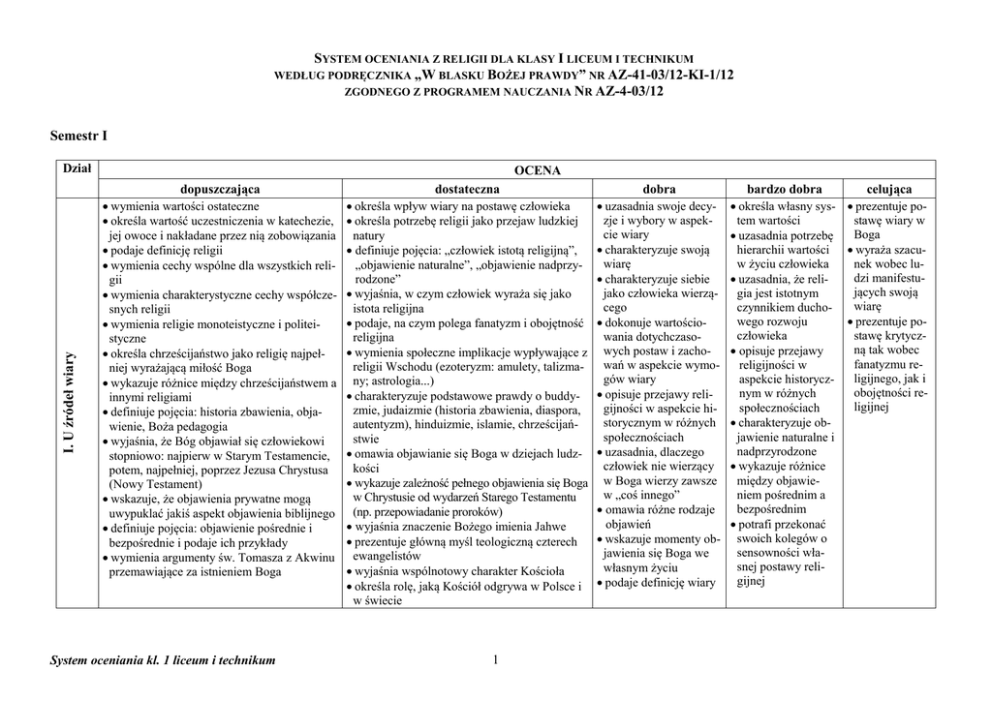 SYSTEM OCENIANIA Z RELIGII DLA KLASY I LICEUM I TECHNIKUM WEDŁUG PODRĘCZNIKA „W BLASKU BOŻEJ PRAWDY” NR AZ-41-03/12-KI-1/12 ZGODNEGO Z PROGRAMEM NAUCZANIA NR AZ-4-03/12 Semestr I I. U źródeł wiary Dział OCENA dopuszczająca wymienia wartości ostateczne określa wartość uczestniczenia w katechezie, jej owoce i nakładane przez nią zobowiązania podaje definicję religii wymienia cechy wspólne dla wszystkich religii wymienia charakterystyczne cechy współczesnych religii wymienia religie monoteistyczne i politeistyczne określa chrześcijaństwo jako religię najpełniej wyrażającą miłość Boga wykazuje różnice między chrześcijaństwem a innymi religiami definiuje pojęcia: historia zbawienia, objawienie, Boża pedagogia wyjaśnia, że Bóg objawiał się człowiekowi stopniowo: najpierw w Starym Testamencie, potem, najpełniej, poprzez Jezusa Chrystusa (Nowy Testament) wskazuje, że objawienia prywatne mogą uwypuklać jakiś aspekt objawienia biblijnego definiuje pojęcia: objawienie pośrednie i bezpośrednie i podaje ich przykłady wymienia argumenty św. Tomasza z Akwinu przemawiające za istnieniem Boga System oceniania kl. 1 liceum i technikum dostateczna określa wpływ wiary na postawę człowieka określa potrzebę religii jako przejaw ludzkiej natury definiuje pojęcia: „człowiek istotą religijną”, „objawienie naturalne”, „objawienie nadprzyrodzone” wyjaśnia, w czym człowiek wyraża się jako istota religijna podaje, na czym polega fanatyzm i obojętność religijna wymienia społeczne implikacje wypływające z religii Wschodu (ezoteryzm: amulety, talizmany; astrologia...) charakteryzuje podstawowe prawdy o buddyzmie, judaizmie (historia zbawienia, diaspora, autentyzm), hinduizmie, islamie, chrześcijaństwie omawia objawianie się Boga w dziejach ludzkości wykazuje zależność pełnego objawienia się Boga w Chrystusie od wydarzeń Starego Testamentu (np. przepowiadanie proroków) wyjaśnia znaczenie Bożego imienia Jahwe prezentuje główną myśl teologiczną czterech ewangelistów wyjaśnia wspólnotowy charakter Kościoła określa rolę, jaką Kościół odgrywa w Polsce i w świecie 1 dobra uzasadnia swoje decyzje i wybory w aspekcie wiary charakteryzuje swoją wiarę charakteryzuje siebie jako człowieka wierzącego dokonuje wartościowania dotychczasowych postaw i zachowań w aspekcie wymogów wiary opisuje przejawy religijności w aspekcie historycznym w różnych społecznościach uzasadnia, dlaczego człowiek nie wierzący w Boga wierzy zawsze w „coś innego” omawia różne rodzaje objawień wskazuje momenty objawienia się Boga we własnym życiu podaje definicję wiary bardzo dobra celująca określa własny sys- prezentuje potem wartości stawę wiary w Boga uzasadnia potrzebę hierarchii wartości wyraża szacuw życiu człowieka nek wobec ludzi manifestu uzasadnia, że relijących swoją gia jest istotnym wiarę czynnikiem duchowego rozwoju prezentuje poczłowieka stawę krytyczną tak wobec opisuje przejawy fanatyzmu rereligijności w ligijnego, jak i aspekcie historyczobojętności renym w różnych ligijnej społecznościach charakteryzuje objawienie naturalne i nadprzyrodzone wykazuje różnice między objawieniem pośrednim a bezpośrednim potrafi przekonać swoich kolegów o sensowności własnej postawy religijnej I. U źródeł wiary Dział OCENA dopuszczająca określa, że katecheza jest wyjaśnianiem Bożego objawienia prezentuje charakterystyczne elementy obrazu Jezusa w poszczególnych Ewangeliach definiuje pojęcia: Chrystus Zbawiciel, Chrystus Odkupiciel, Chrystus Głowa Kościoła określa Kościół jako wspólnotę ochrzczonych, których Głową jest Chrystus wymienia najbardziej znane sekty działające w swoim środowisku i w Polsce określa niebezpieczeństwo płynące z przyłączenia się do sekty dostateczna wie, że Chrystus założył Kościół i nim kieruje określa Kościół jako mistyczne Ciało Chrystusa wyjaśnia, że Kościół jest zapoczątkowaniem królestwa Bożego na ziemi potrafi rozpoznać sposoby werbowania do sekt wyjaśnia, że określenie „nowe ruchy religijne” odnosi się do grup działających poza Kościołem charakteryzuje sposoby obrony przed zagrożeniami ze strony sekt charakteryzuje „grupę ryzyka” osób najbardziej podatnych na wstąpienie do sekty II. U źródeł moralności człowieka wierzącego Dział dobra charakteryzuje „dowody na istnienie Boga” potrafi zinterpretować teksty biblijne odsłaniające niewidzialnego Boga omawia przyczyny różnic w obrazie Jezusa w czterech ewangeliach charakteryzuje rolę Chrystusa w historii ludzkości uzasadnia, że Chrystus jest założycielem i Głową Kościoła potrafi krytycznie odnieść się do różnych form reklamy nowych ruchów religijnych w mediach bardzo dobra celująca pomaga innym po poszukuje znawać Boga własnych argumen charakteryzuje śrotów na istdowiska, w jakich nienie Boga powstały Ewangelie uzasadnia, że sam jest podmiotem w Kościele tworzy Kościół i inspiruje innych do tworzenia go we własnym środowisku OCENA dopuszczająca definiuje pojęcie „godność osoby” wymienia rodzaje godności przyrodzonej i nadprzyrodzonej (godność osobowa i osobowościowa) wymienia wartości ogólnoludzkie, które zogniskowane są wokół godności (prawda, dobro, sprawiedliwość, wolność, odpowiedzialność...) pamięta, że człowiek jest istotą rozumną, obrazem mądrości Boga definiuje pojęcia: wolność, odpowiedzialność, samowola System oceniania kl. 1 liceum i technikum dostateczna wymienia zadania wypływające z godności człowieka rozumie, że godność człowieka ma podstawę w Bogu (wymienia źródła godności człowieka) wyjaśnia, że wolność zakłada wolny wybór między dobrem i złem wymienia skutki wolności nieodpowiedzialnej (samowoli) rozumie negatywny wpływ samowoli na moralność człowieka 2 dobra bardzo dobra celująca potrafi uzasadnić, dlaczego wyk