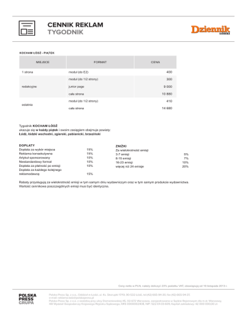 CENNIK REKLAM TYGODNIK KOCHAM ŁÓDŹ - PIĄTEK MIEJSCE 1 strona redakcyjne ostatnia FORMAT CENA moduł (do E2) 400 moduł (do 1/2 strony) 300 junior page 9 000 cała strona 10 880 410 moduł (do 1/2 strony) 14 680 cała strona Tygodnik KOCHAM ŁÓDŹ ukazuje się w każdy piątek i swoim zasięgiem obejmuje powiaty: Łódź, łódzki wschodni, zgierski, pabianicki, brzeziński DOPŁATY ZNIŻKI Dopłata za wybór miejsca 15% Za wielokrotność emisji Reklama konsekutywna 15% 3-7 emisji Artykuł sponsorowany 10% 8-15 emisji Niestandardowy format 10% 16-23 emisji Dopłata za płatność po emisji 10% więcej niż 24 emisje Dopłata za każdego kolejnego reklamodawcę 15% 5% 7% 10% 20% Rabaty przysługują za wielokrotność emisji w tym samym dniu wydawniczym oraz w tym samym produkcie wydawnictwa. Wartość cennikowa poszczególnych emisji musi być identyczna. Ceny netto w PLN, należy doliczyć 23% podatku VAT, obowiązują od 18 listopada 2013 r. Polska Press Sp. z o.o., Oddział w Łodzi, ul. Ks. Skorupki 17/19, 90-532 Łódź, tel.(42) 665-94-30, fax (42) 665-94-37, e-mail: [email protected] Polska Press Sp. z o.o. z siedzibą przy ulicy Domaniewskiej 45, 02-672 Warszawa, zarejestrowana w Sądzie Rejonowym dla m.st. Warszawy, XIII Wydział Gospodarczy Krajowego Rejestru Sądowego, KRS 0000002408, NIP: 522-01-03-609, Kapitał zakładowy: 42 000 000,00 zł.